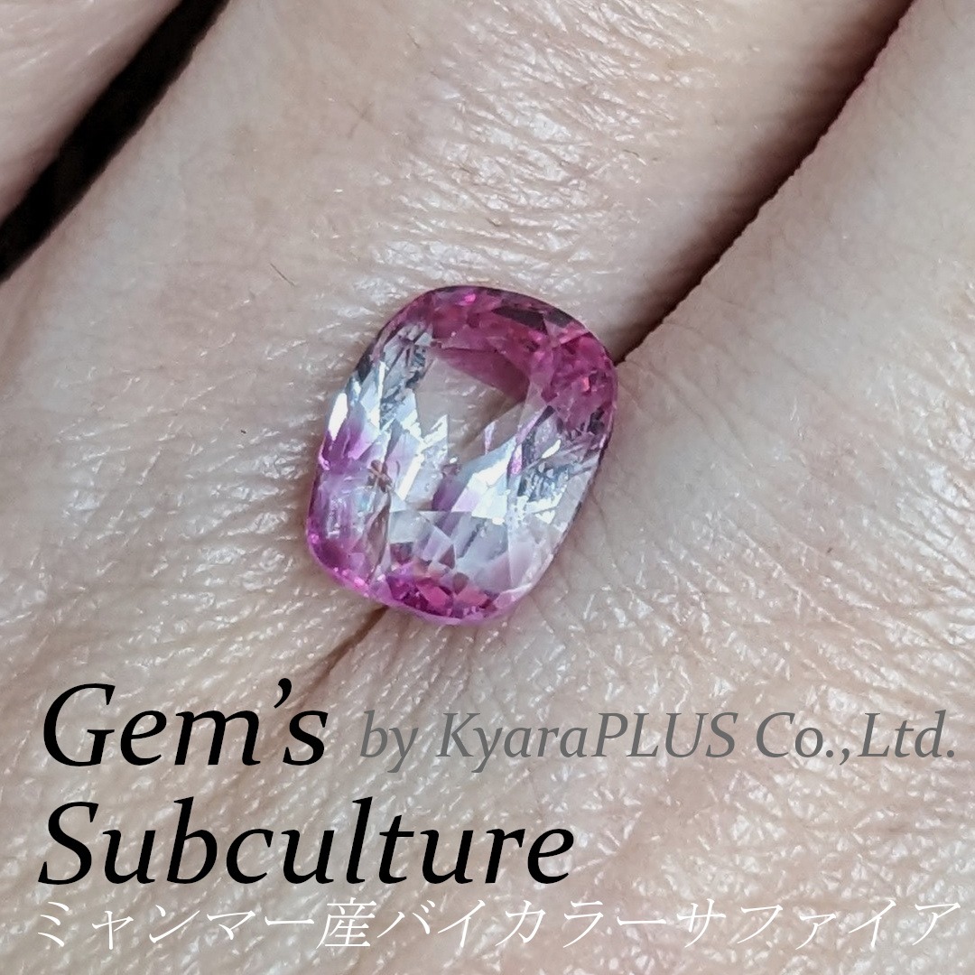 直接ミャンマーから仕入れてきた、自慢のバイカラーサファイアの一つです。ほぼ純粋なカラーレスのホワイトサファイアの中に、まるでリボンを飾り付けたように鮮やかなピンク色のエリアが広がります。こちらは「非加熱(ノーヒート)」。非加熱サファイアは、微妙な色のグラデーションや色相の揺らぎ、色の深みなどを楽しむのも醍醐味の一つ。今回の非加熱サファイアは、混じり気のない純粋なコランダムとピンクサファイアの色相のバイカラーがとってもキュートでレアな1ピースです。