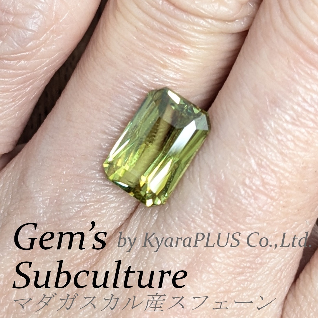 ダイヤモンドを凌ぐ分散度(虹色の輝き)を持つスフェーン。今回施されているカットは、特にその輝きを効果的に見せていると思います。ギラギラ感、伝わるでしょうか?地色もとても美しい若草色です☆