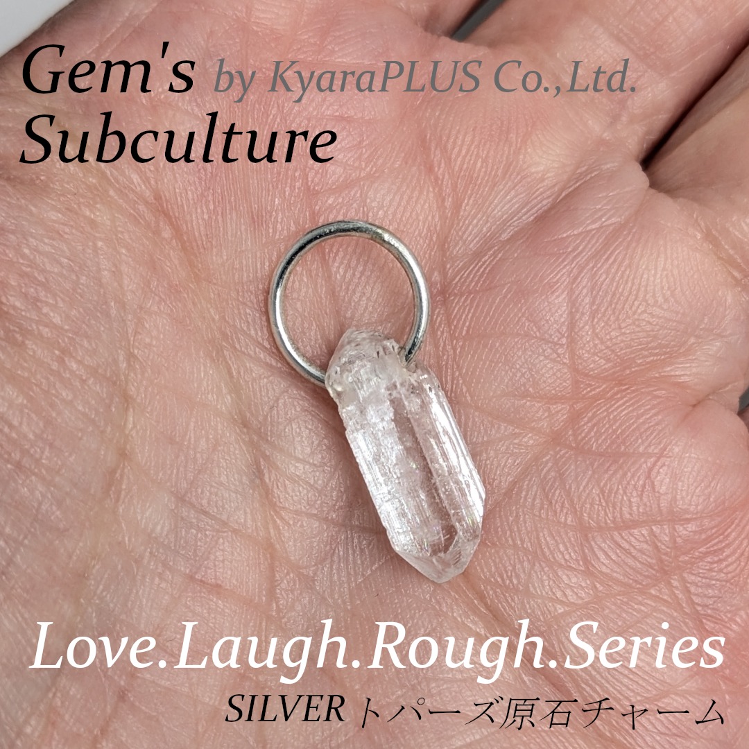 トパーズというと、ブルーやシェリーカラー、人気のピンクなどを思い浮かべる方が多いかもしれませんが、実は本来の姿は「カラーレス(無色)」の結晶です。一見すると水晶にも似た印象の原石ですが、トパーズの特徴は結晶面に見られる“条線”。この条線が長手方向に平行に入っているのがトパーズ特有のもので、水晶のように直角にはなっていません。