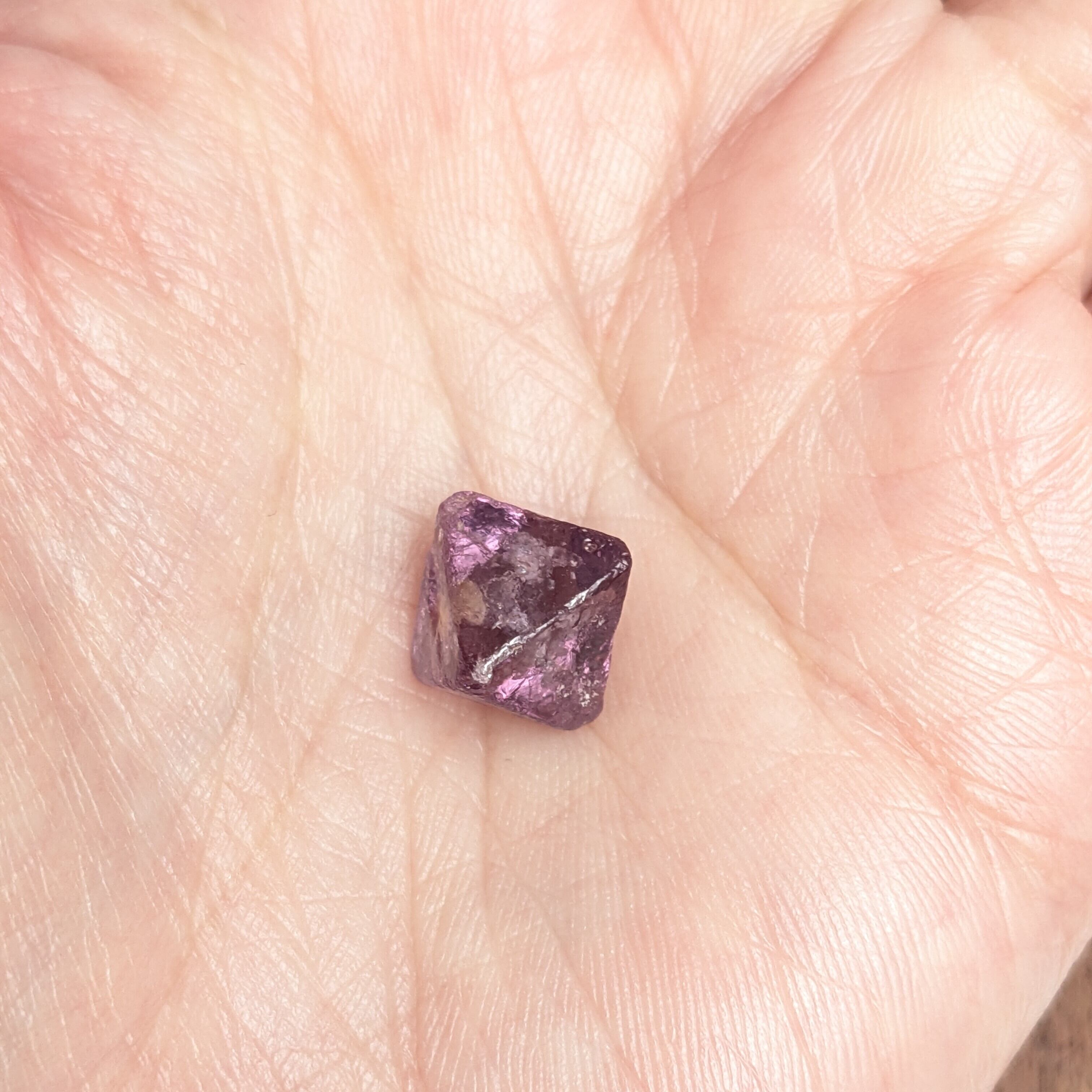 「美しい!」第一声に出てしまうほど、とても見事なスピネルの八面体結晶です。その結晶面で隔てられている、古代と現代の世界。内部にはまるであぶくが湧き立つようにインクルージョンが煌めいていて、今でもブクブクと音を立てながら結晶が成長しているような錯覚に陥ります。結晶面の凸凹は、「蝕像(しょくぞう)」と呼ばれる、個々の石に特徴的に表れる模様。原石ならではの宝石本来のテリを楽しめる1ピースです。