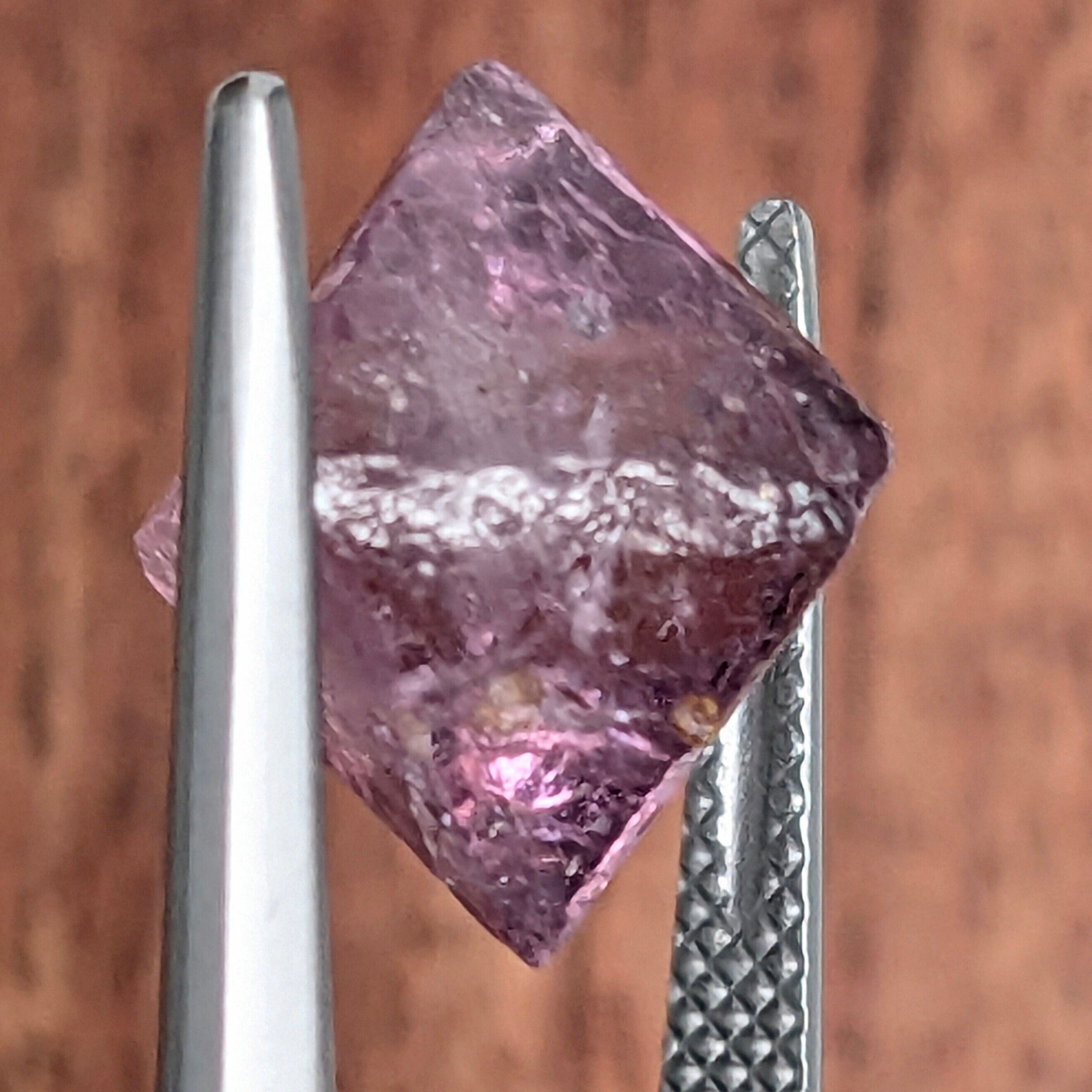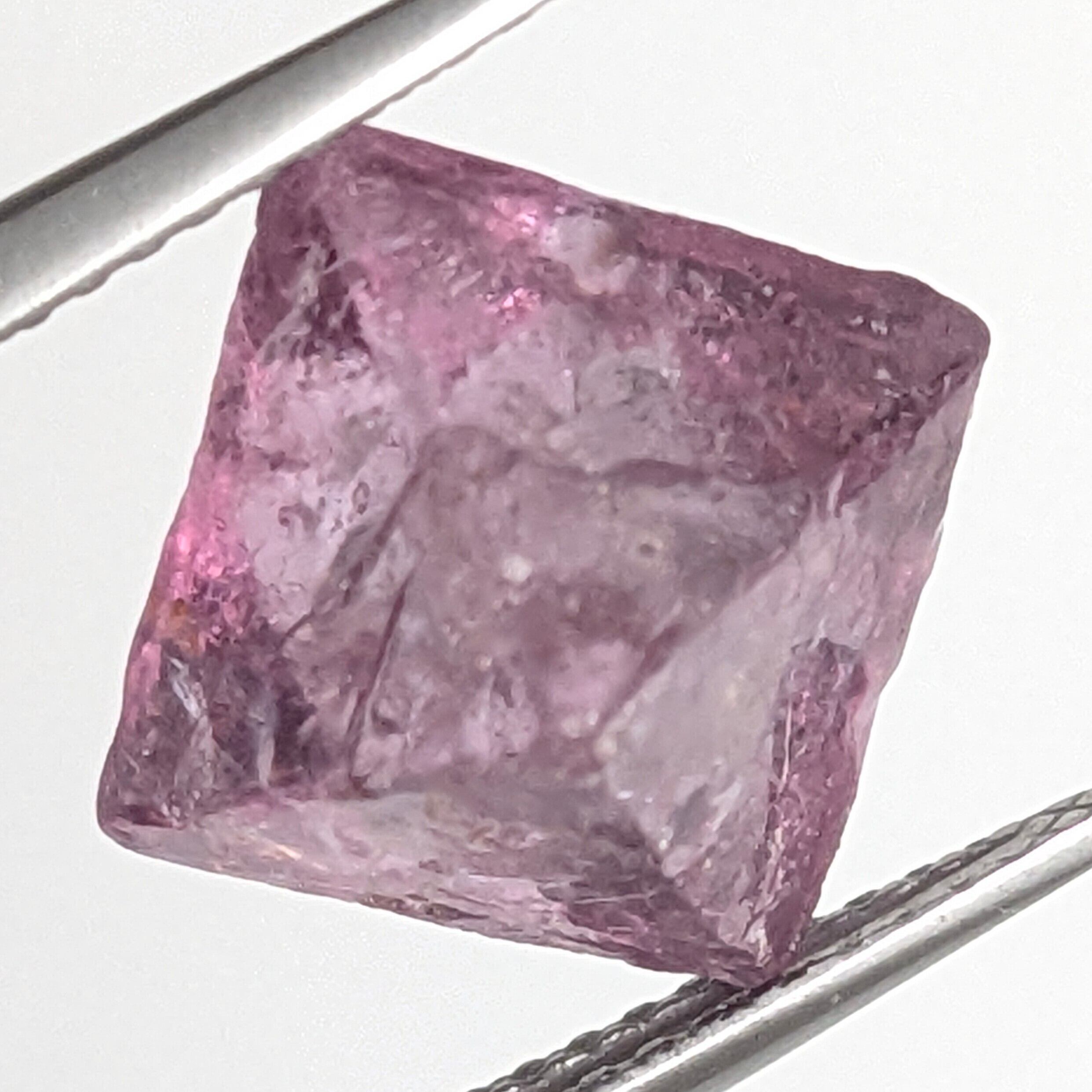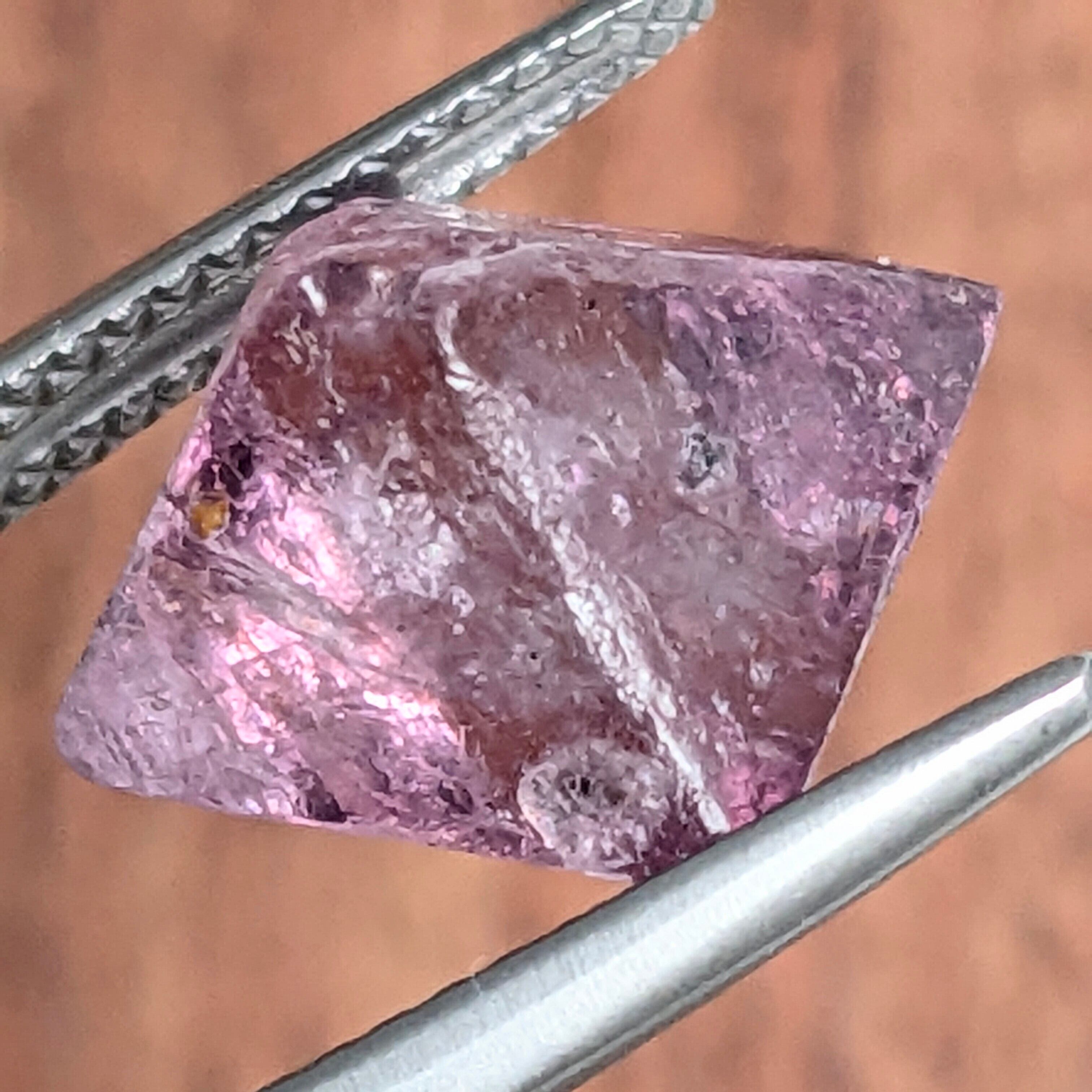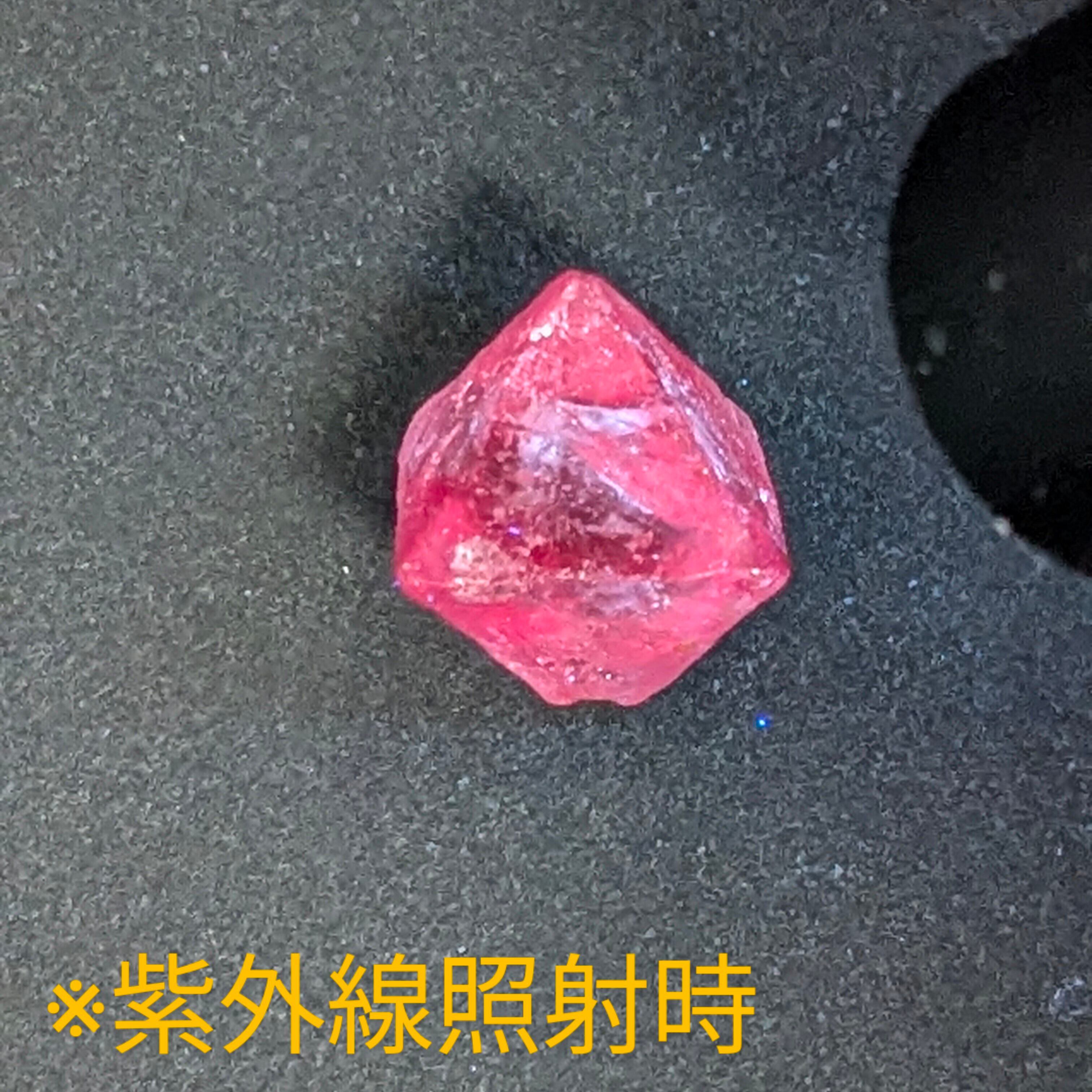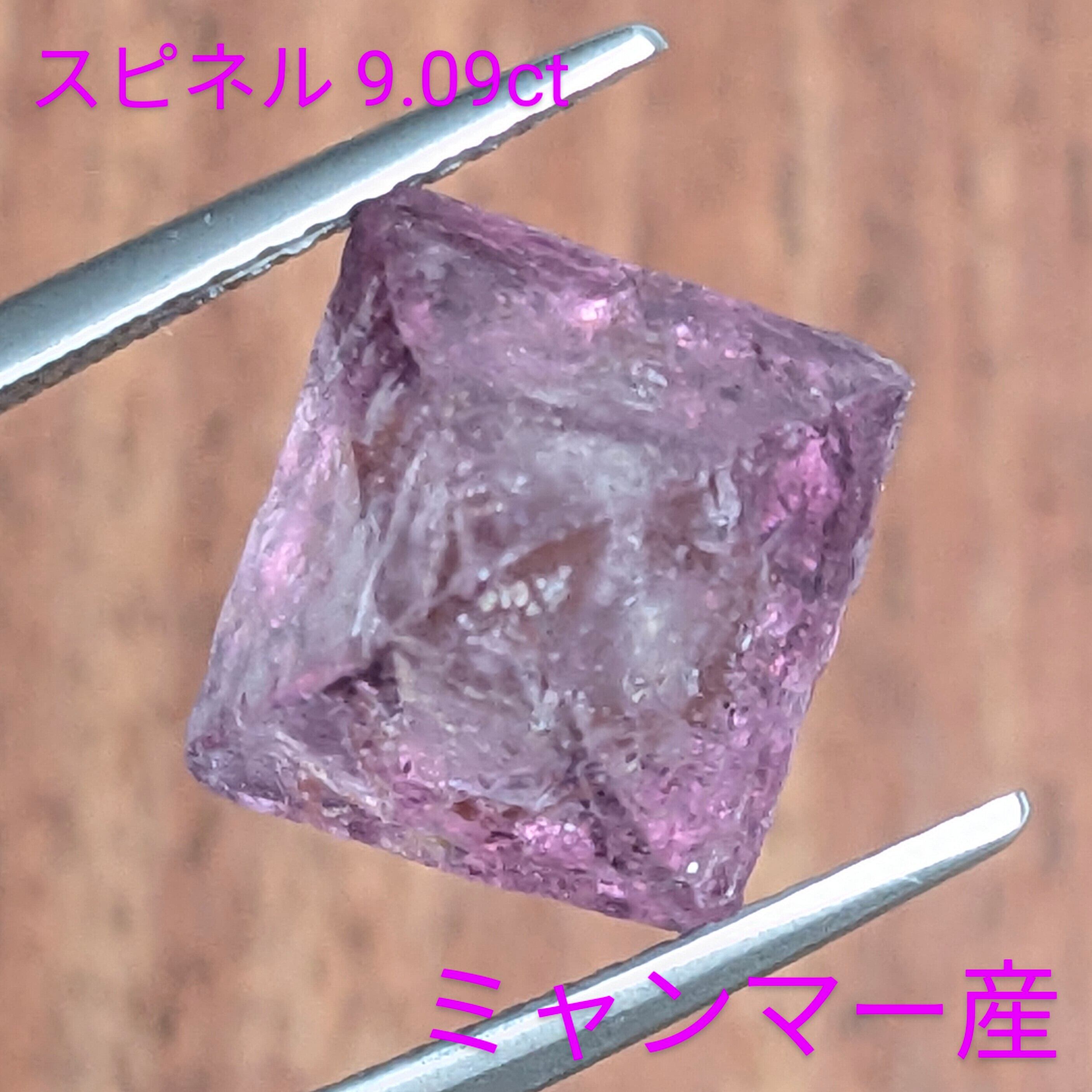 個人的には、原石の表面に刻まれた「蝕像(しょくぞう)=長年の間に地中で浸食された跡」すらもとても魅力だと思う1ピース。9ct越えの大きなスピネルの原石です。一か所角が欠けているように見える部分も、実際は欠けではなく浸食されて丸みを帯びて“生地足らず”となった箇所。過酷な地中の中で、でも自分自身の“結晶系”という自我を懸命に出しながら成長した証です。人間の生き様と、似通うものを感じますね。