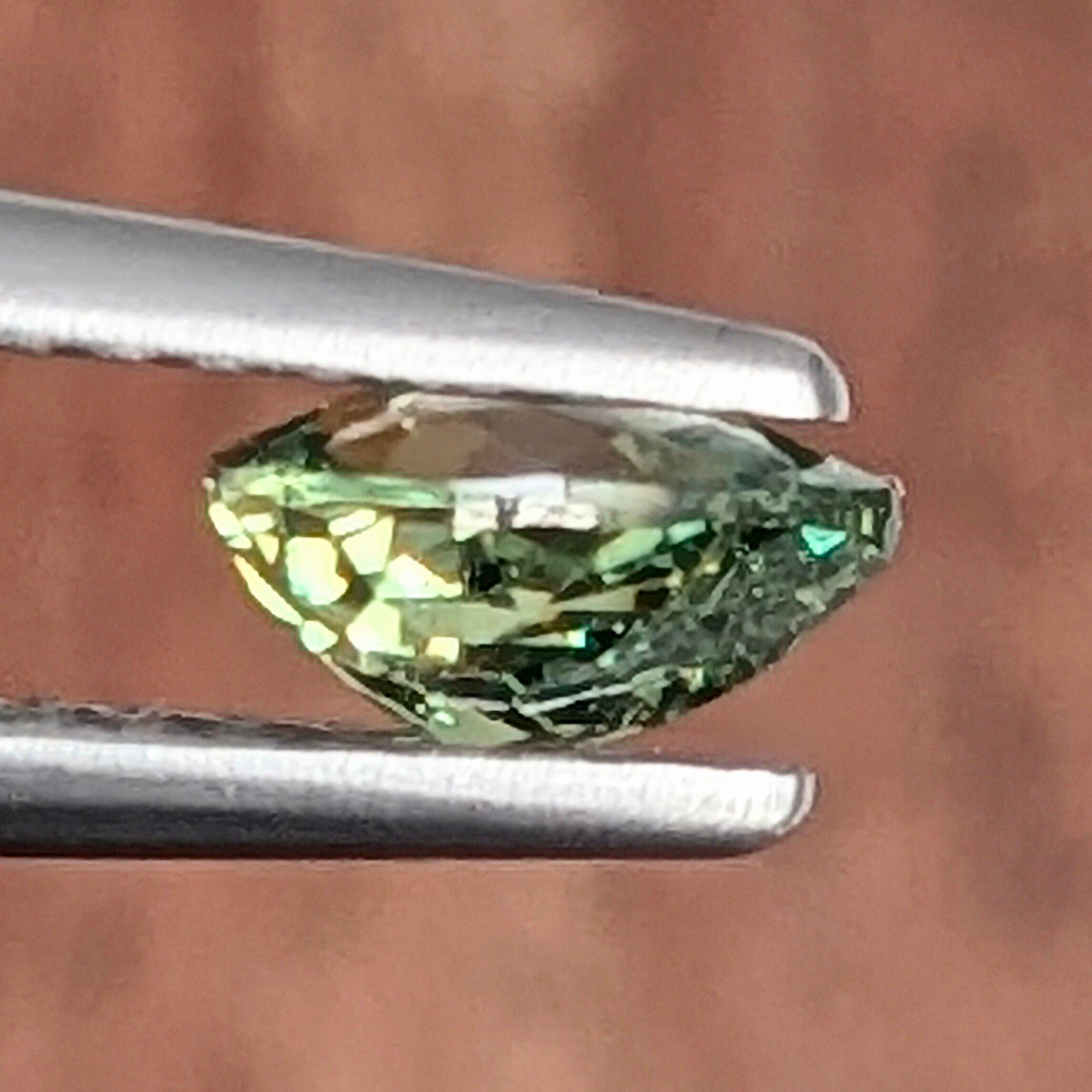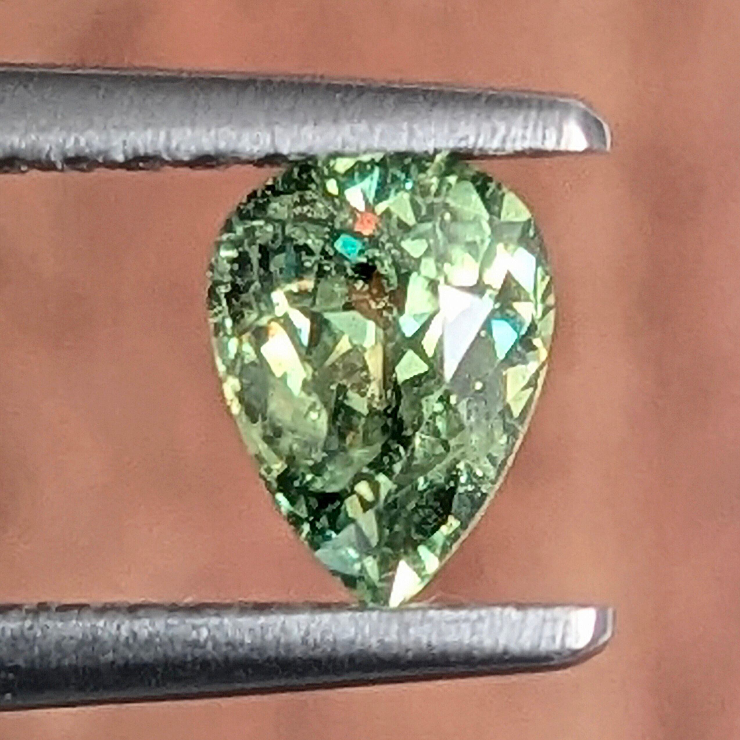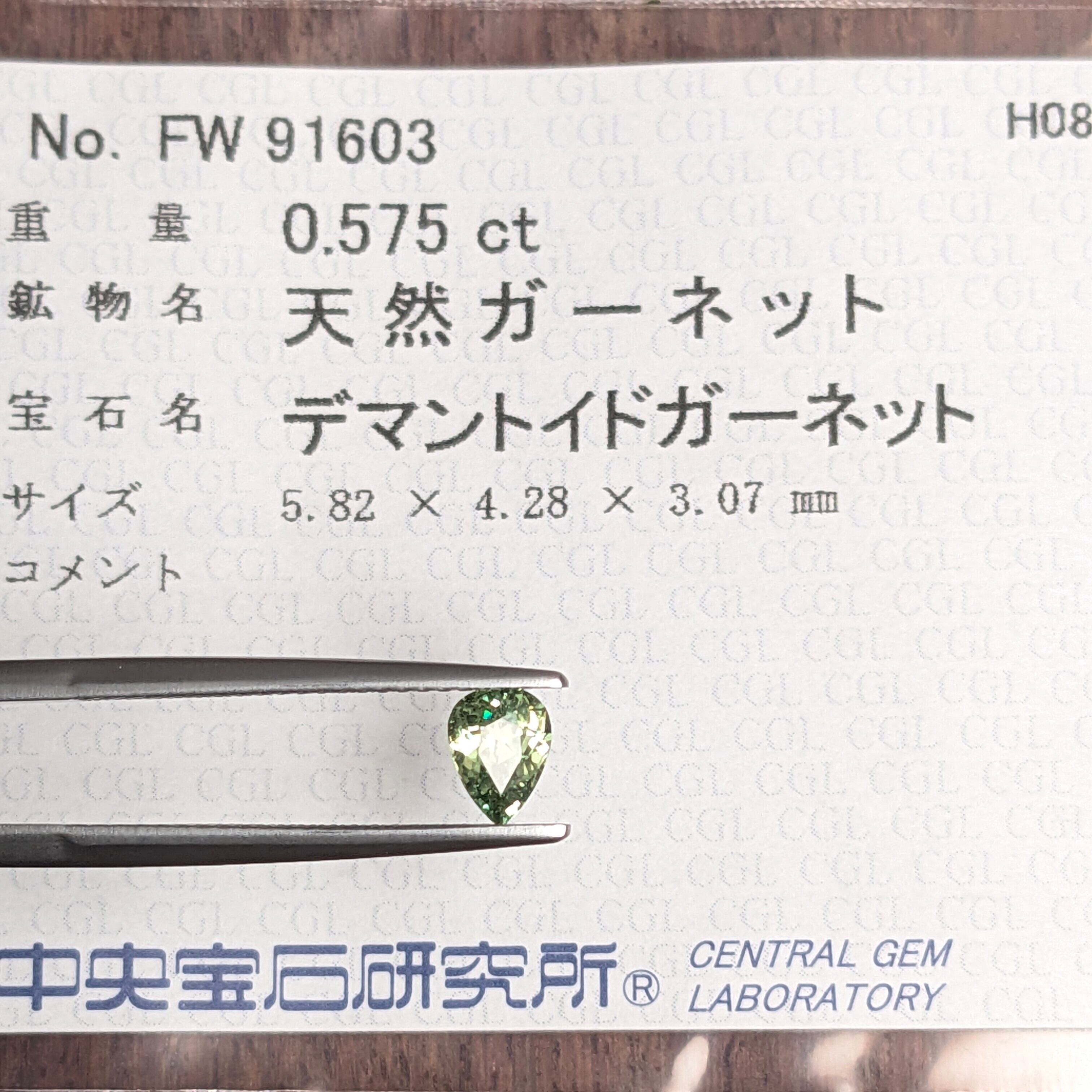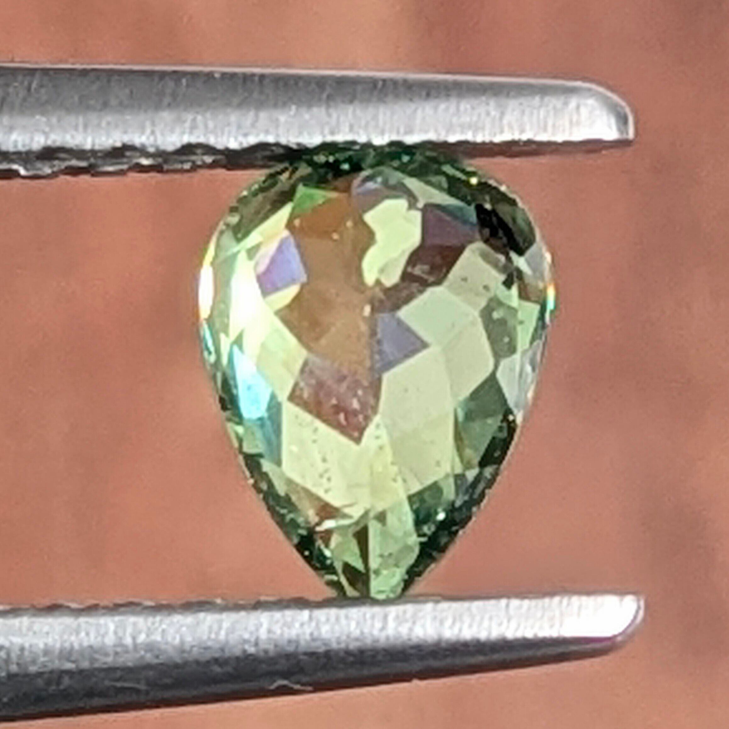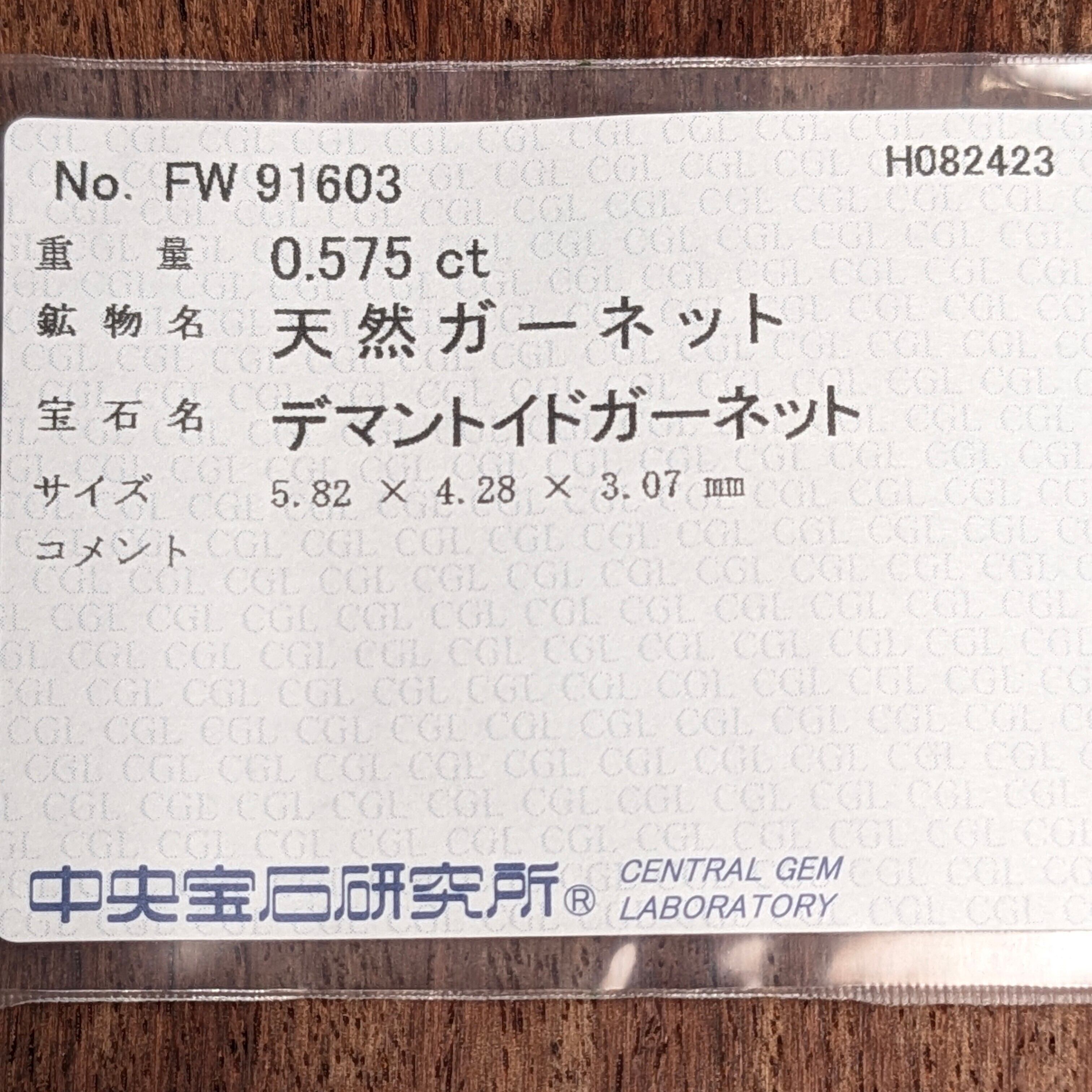 ホーステイルは入っていないですが、明るめのグリーンと肉眼でそれとわかる虹色のブリリアンスがとても美しい1粒。ナミビア産のデマントイドガーネットです。グリーン系の宝石の中で、最も輝きが強い宝石。ナミビア産のデマントイドは、色と輝き両方を存分に楽しめる優等生。朝露に濡れた、初夏の新芽のような生き生きとした美しい煌めきを存分にお楽しみください。