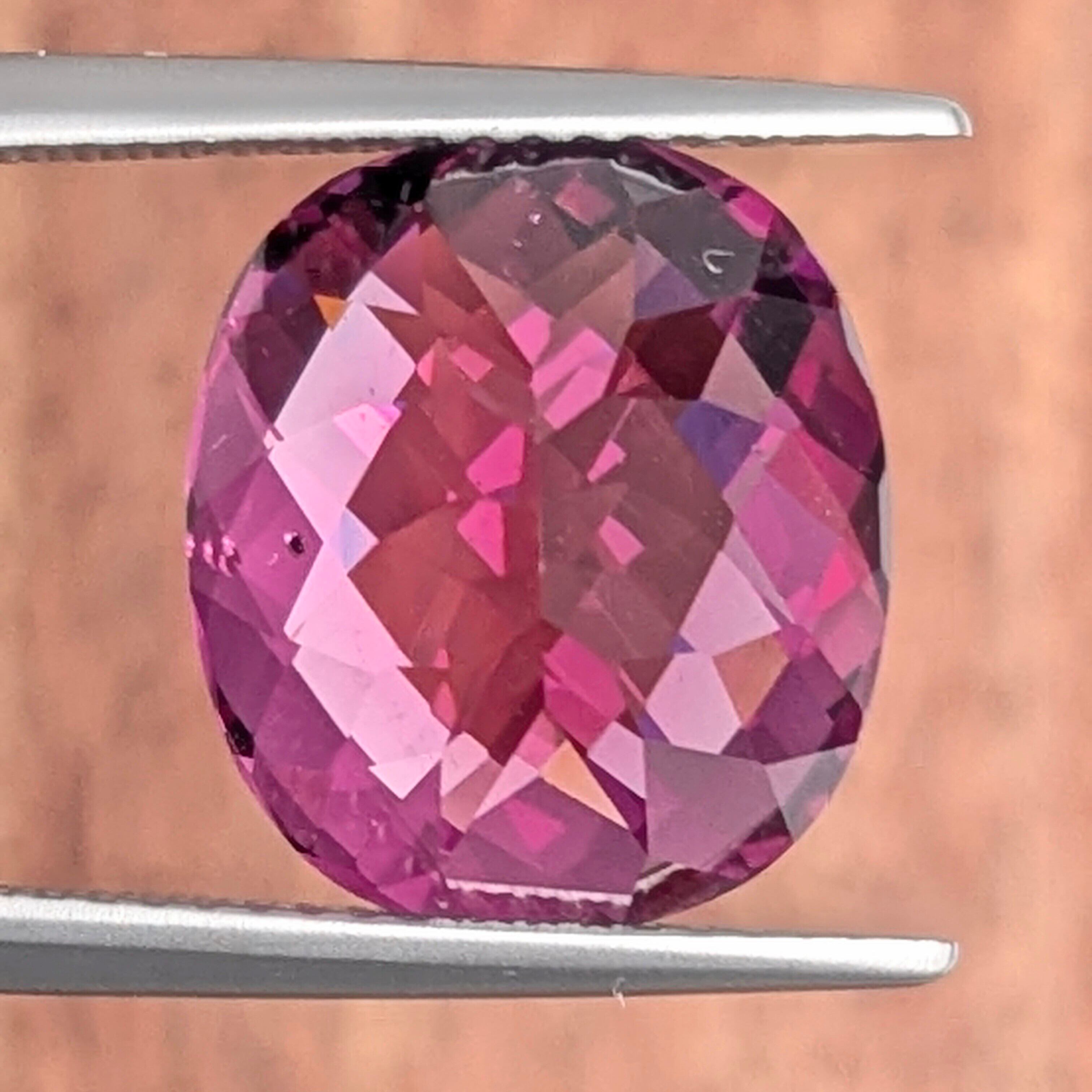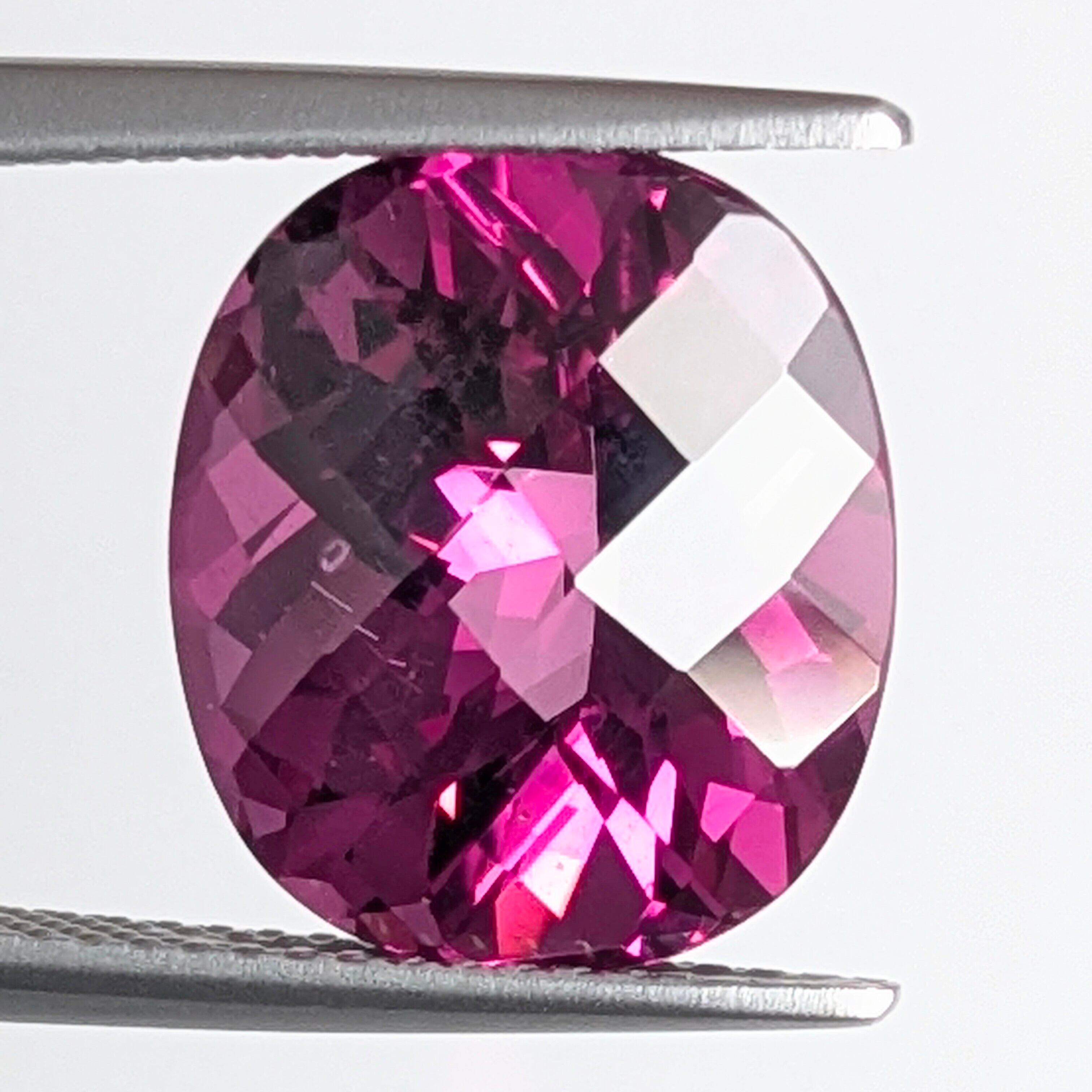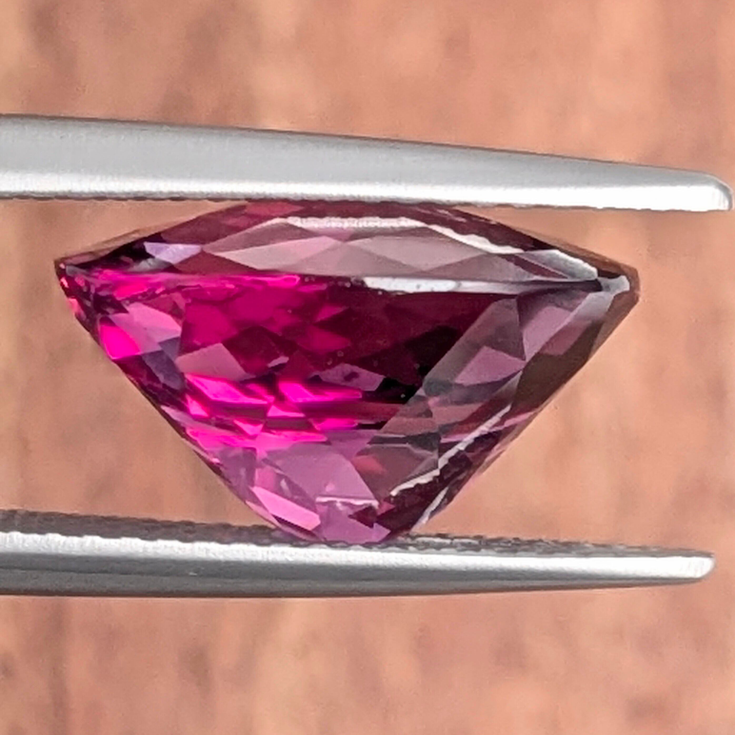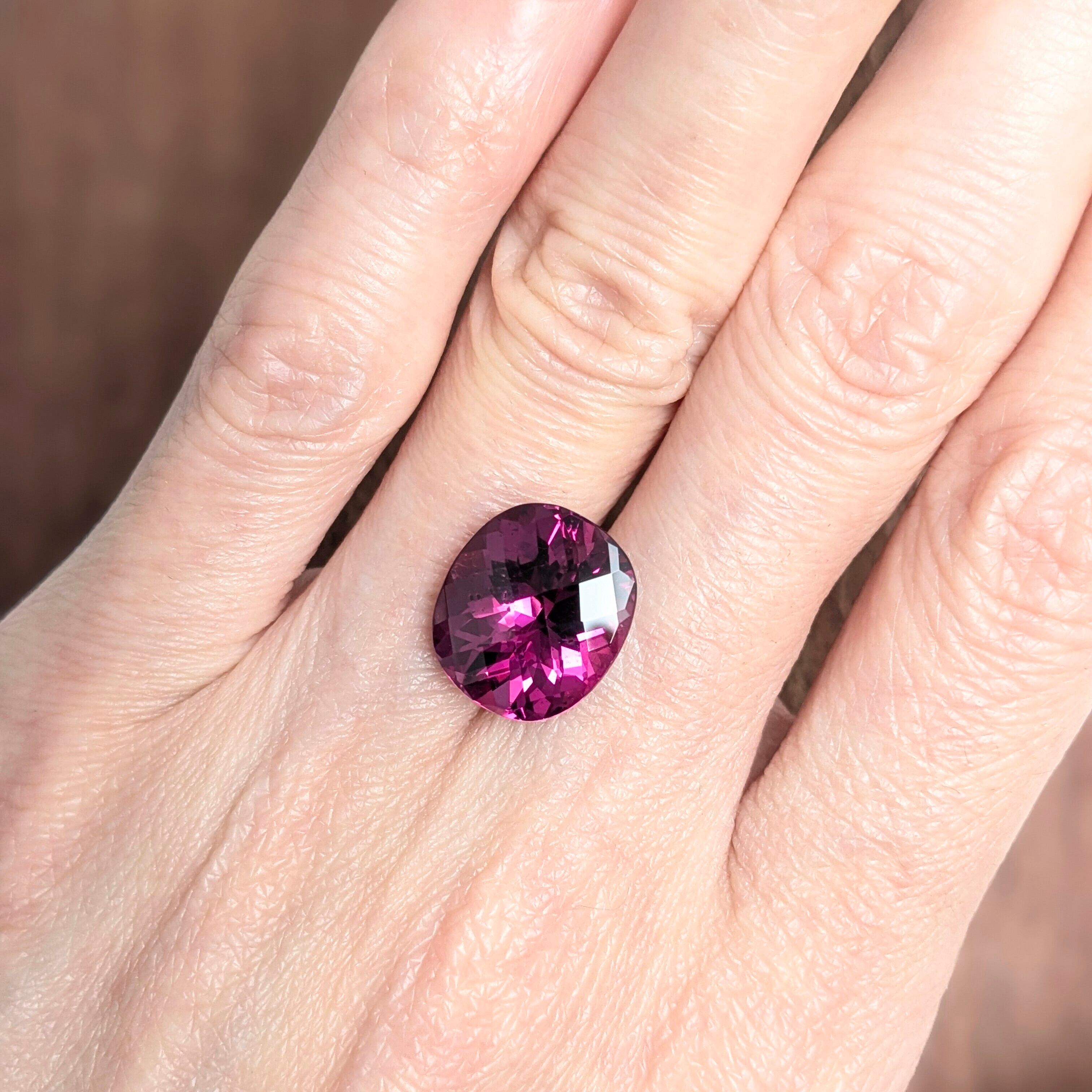 雅やかなチェスカットで眩い輝きを放つ、妖艶な赤紫色が印象的な1粒。色の美しさと透明度が秀逸です。ルーペで覗くと、その内部にはキラキラと虹色に反射する“シルク・インクルージョン”の存在が。肉眼で見えるようなものではありませんが、キレイにカットされた内部で一定の方向に伸びるその姿から、原石であった時の結晶の成長の名残が感じられるようです。8.52ctという圧巻の大きさ!贅沢な一粒です。