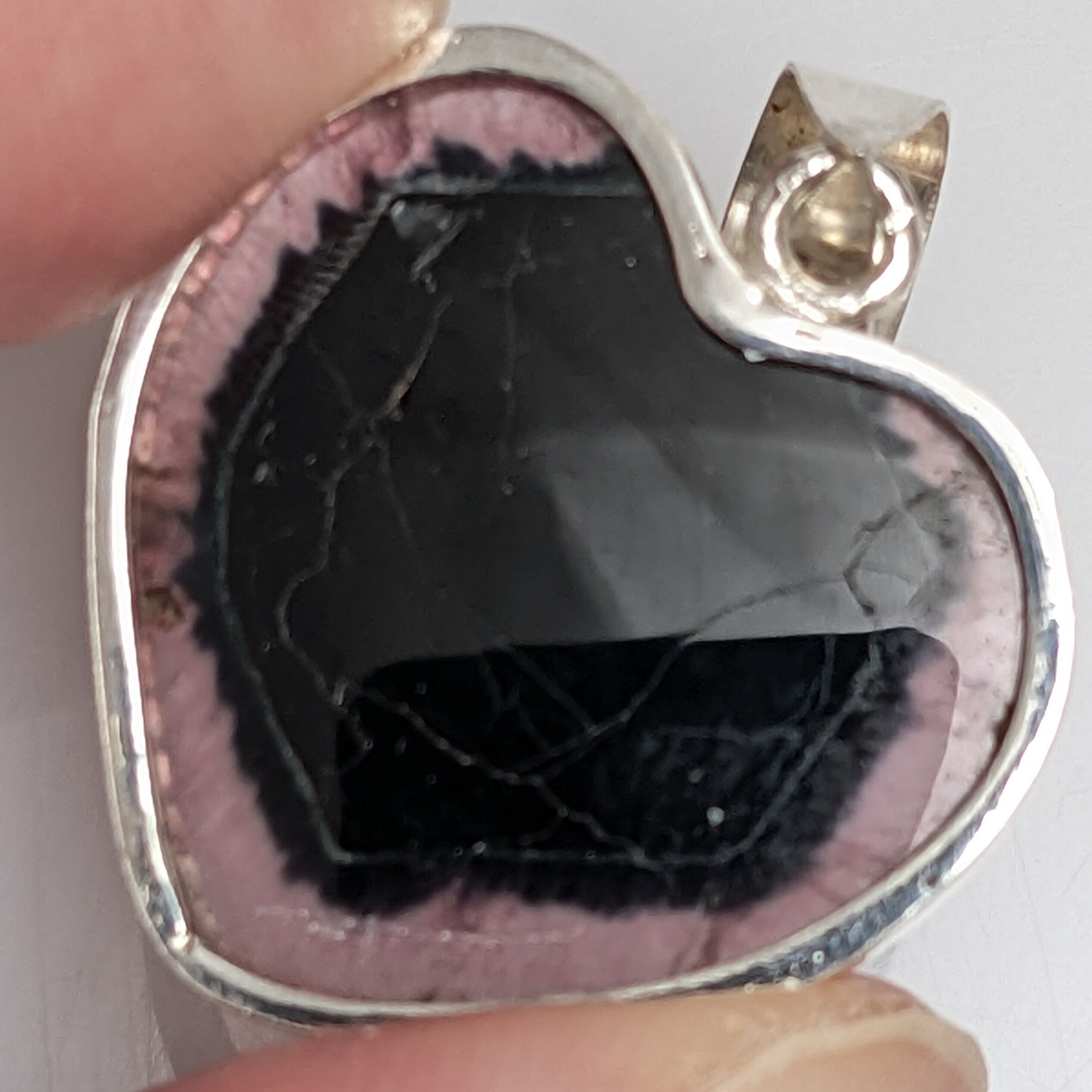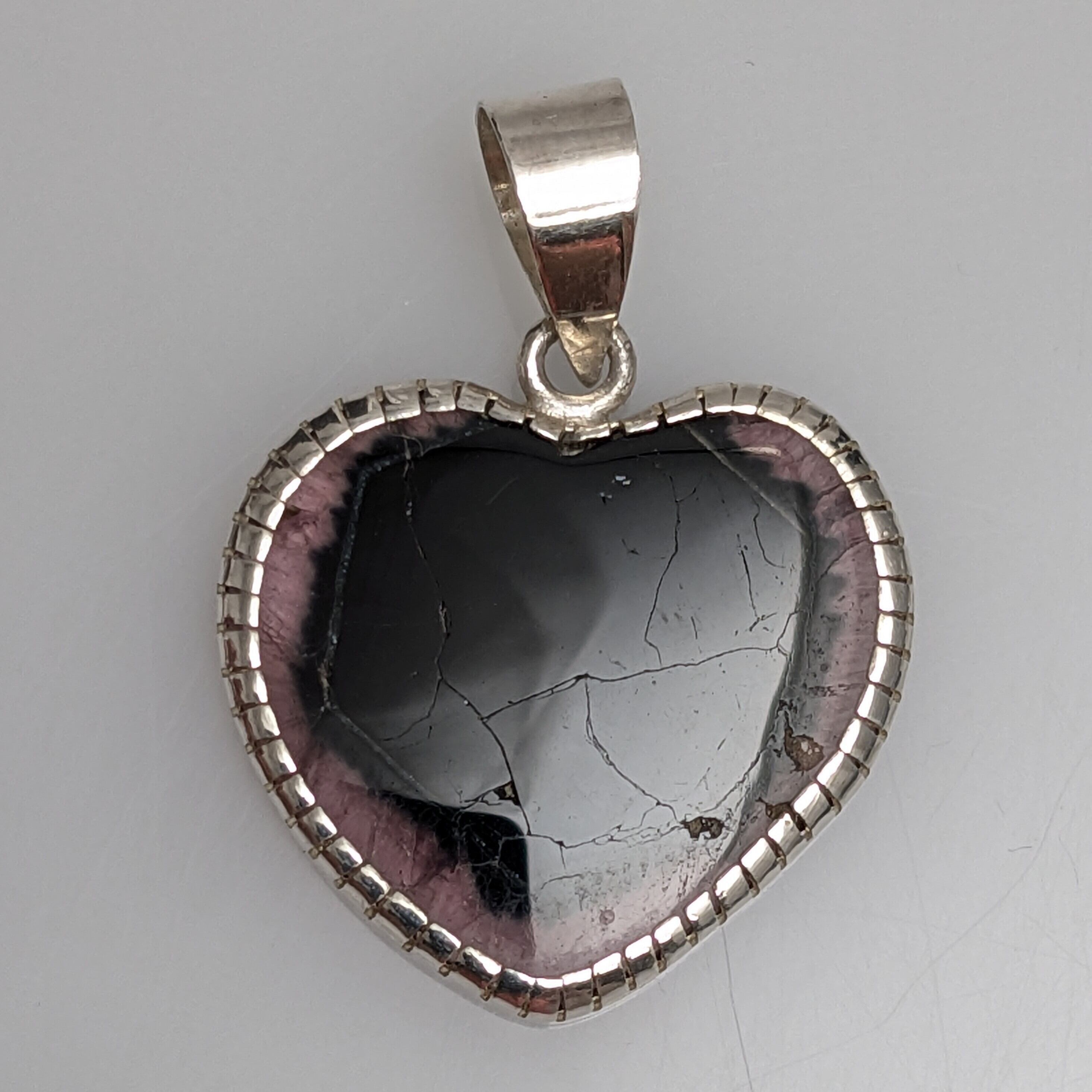 さりげなくハート型になっているトルマリンのタブレットです。外側はほんのりピンク色、中心部が濃いグリーン、そして結晶形に沿った形でその境目に淡いイエローのラインが入っています。このタイプの原石やタブレット型の結晶は、脈上に入った亀裂模様さえも魅力の一つです。