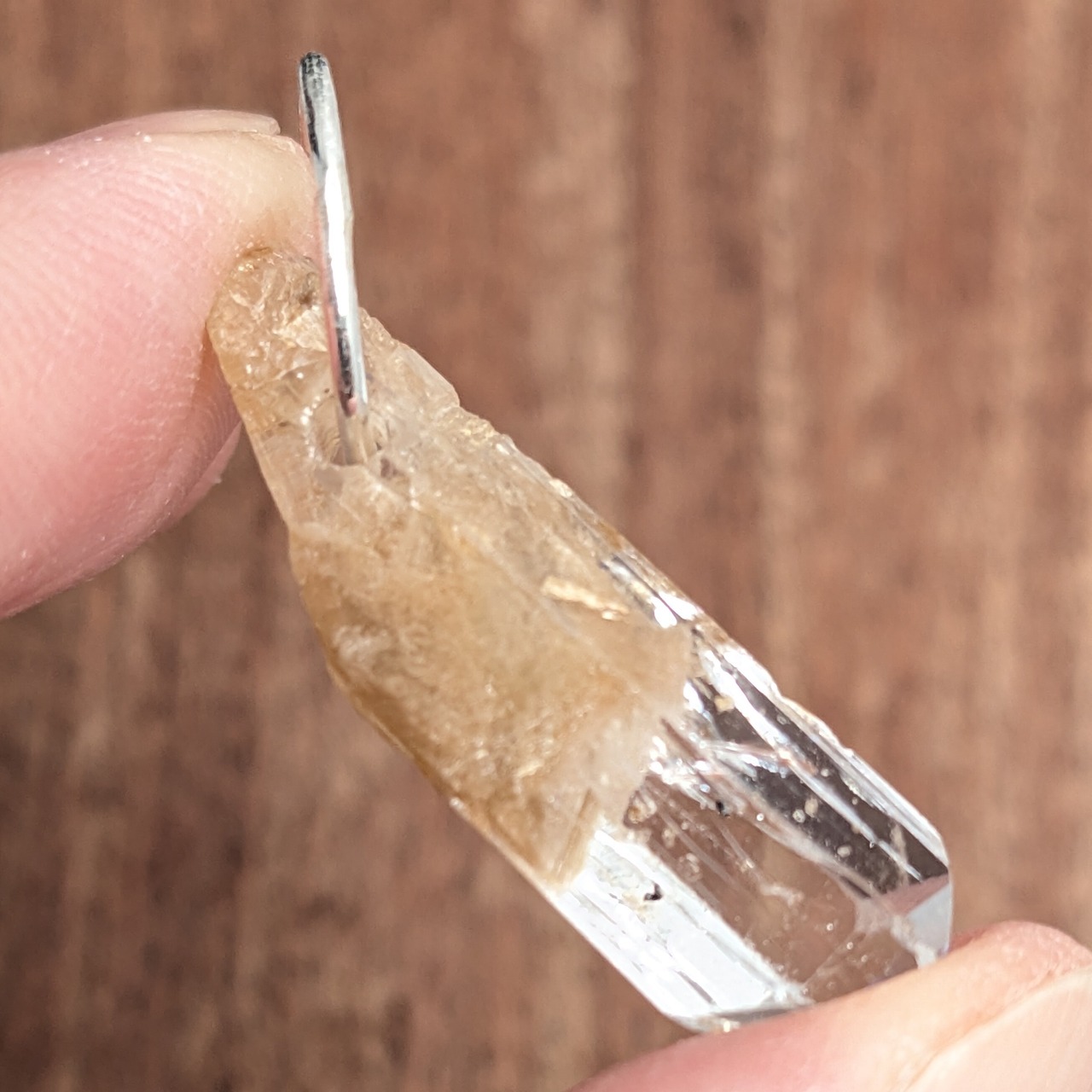 結構存在感のある大きめのチャームです。母岩感のあるブラウン味のある所と、透明感抜群のホワイトトパーズ部分のコントラストが印象的です。この結晶のポイントは、インクルージョンはあるけれど透明な部分は半端ではない透明感を感じるところ!トパーズ特有のテリ感をお楽しみください。