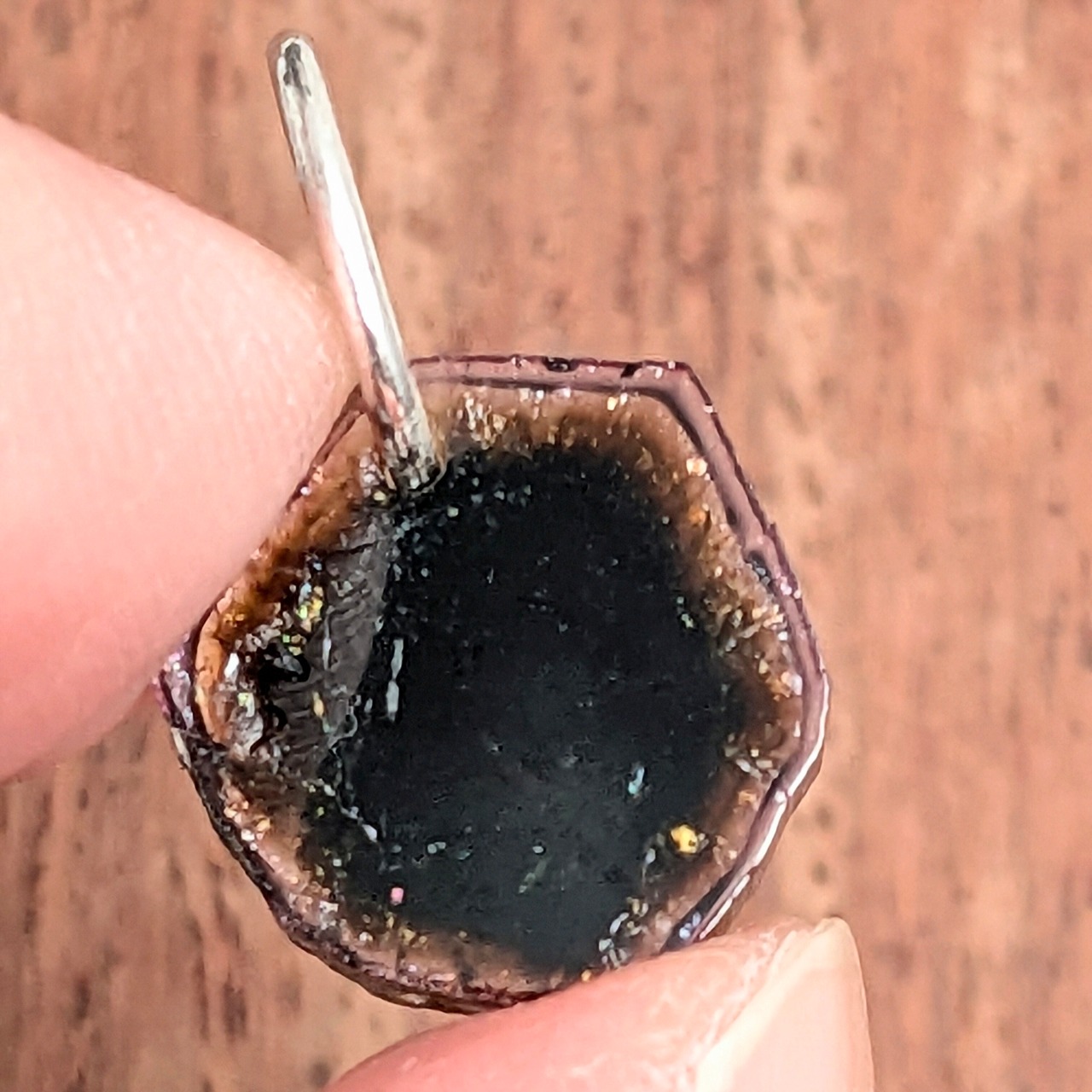 エンブレムを思わせるシェイプがクールな一品。中央がごくごく濃いグリーンで、その周りを淡いパープルの結晶が囲っているお品物です。中心から放射状に伸びており、まるでブラックホール誕生の瞬間の爆発を閉じ込めたような、深い深い深遠が見えます。あなたには、どのように見えるでしょうか・・・?