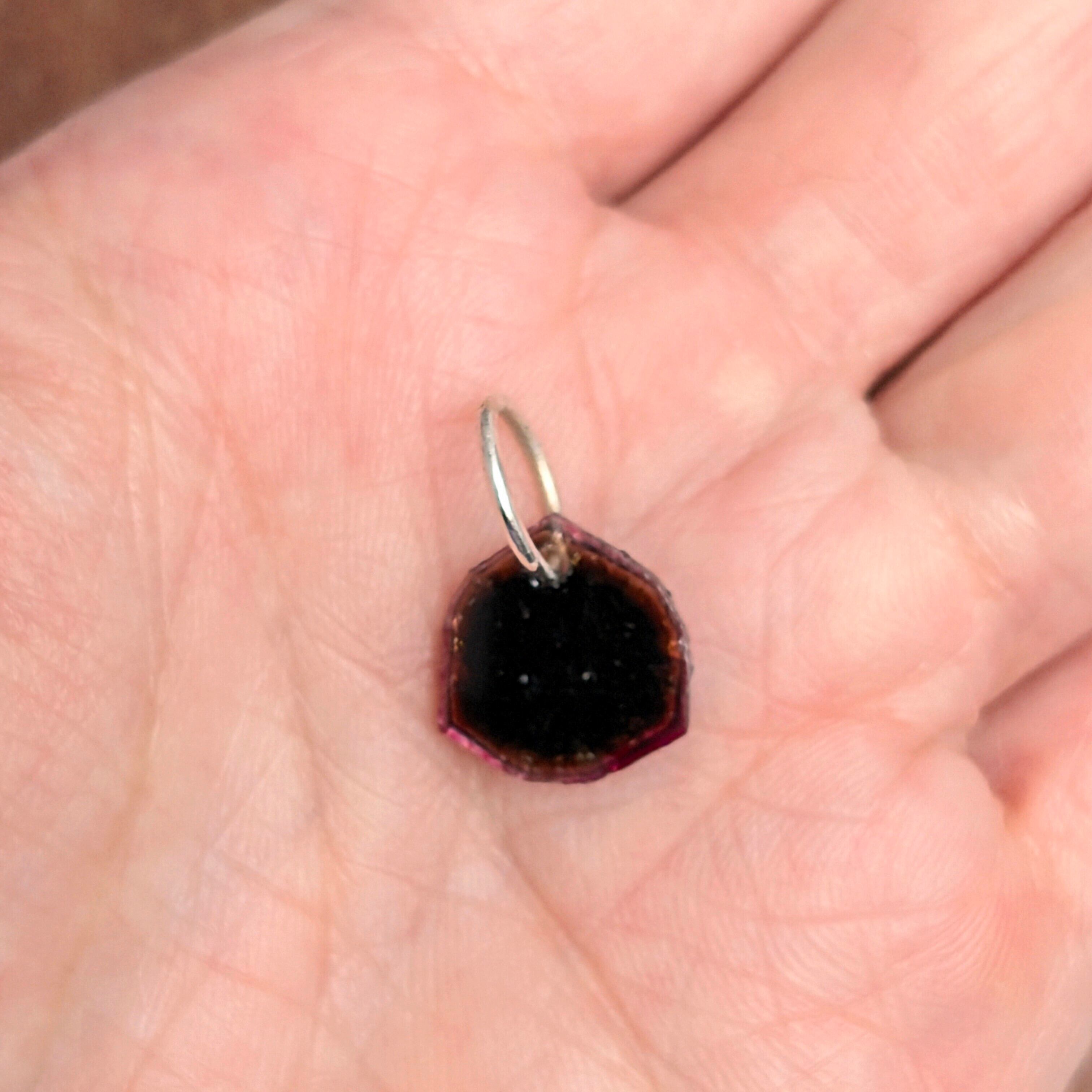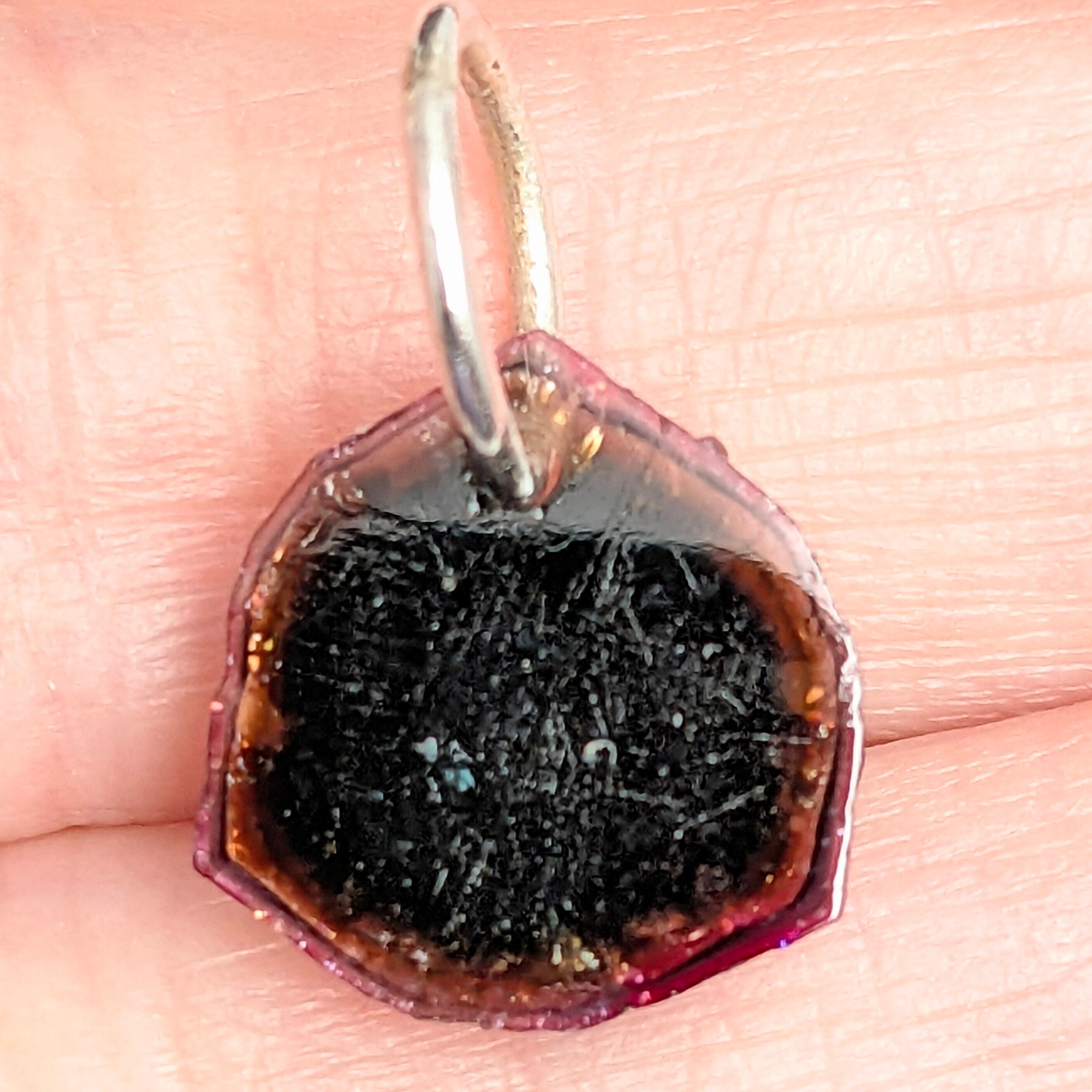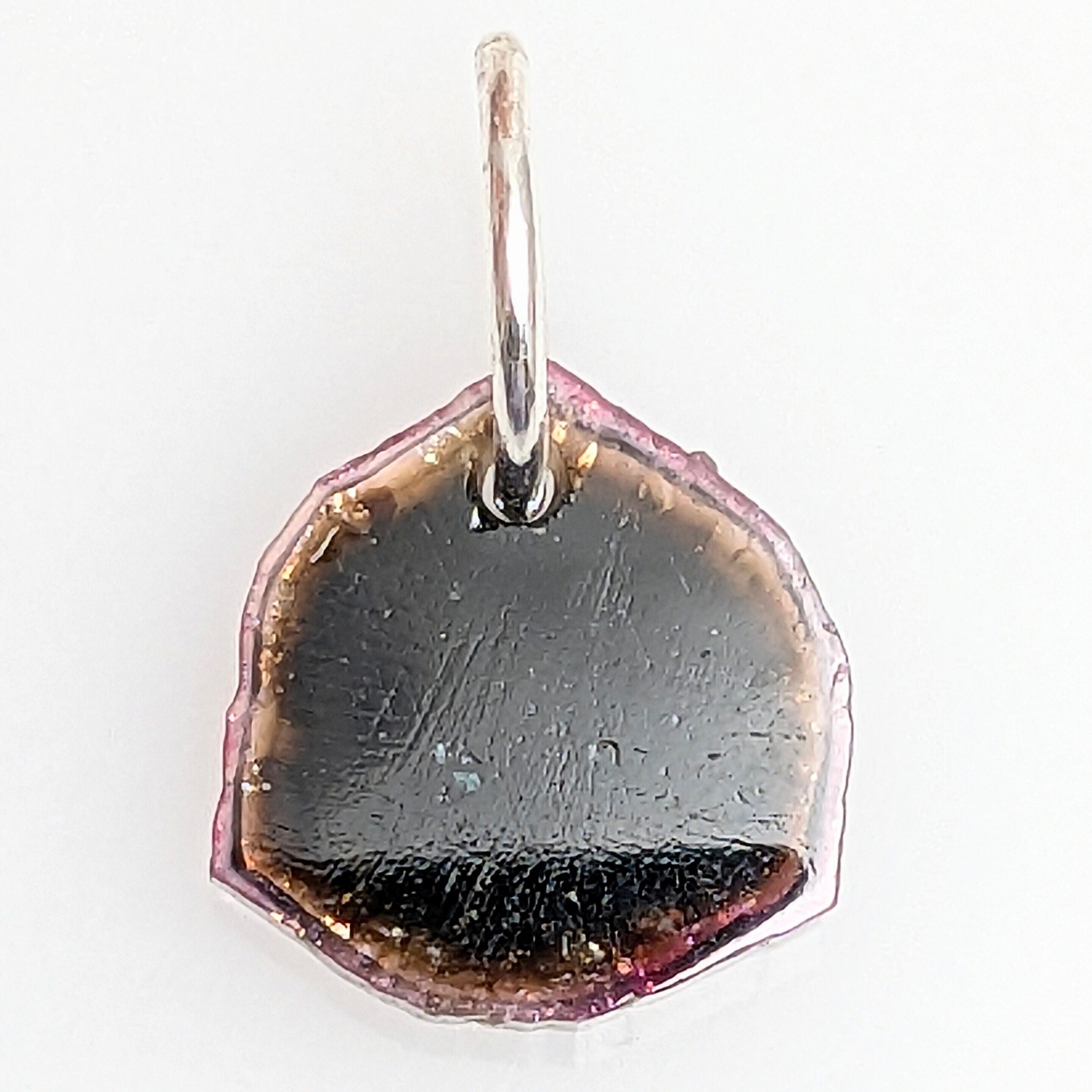 トルマリンの結晶形である「三方晶系」の特徴が良く出たピースが使用されたチャーム。丸みを帯びた三角形の外形が、その特徴です。中央部の濃緑色から外側のパープル系の色合いに向けて徐々に色合いが変化している点が面白い。結晶を輪切りにしたタブレット型の一品です。
