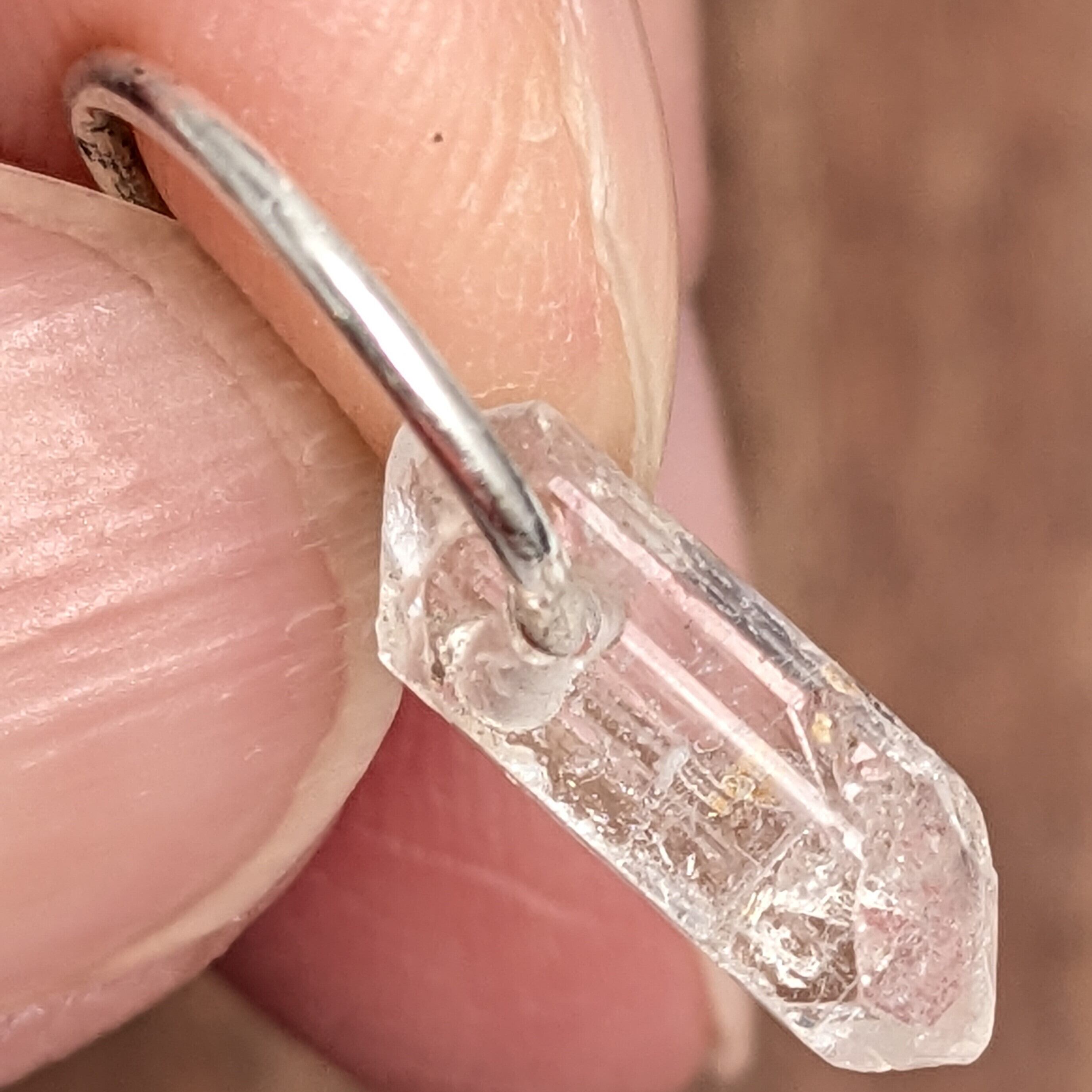 光をあてなくても、その透明度が感じられる美しい原石結晶。内包物はもちろん入っていますが、それが透かし見えることすらもこの透明度の高さを表しているように感じられます。原石表面の艶感も加わって、さりげなくも存在感のあるチャームに。フープ状のピアスにアクセントで通しでも面白いです。