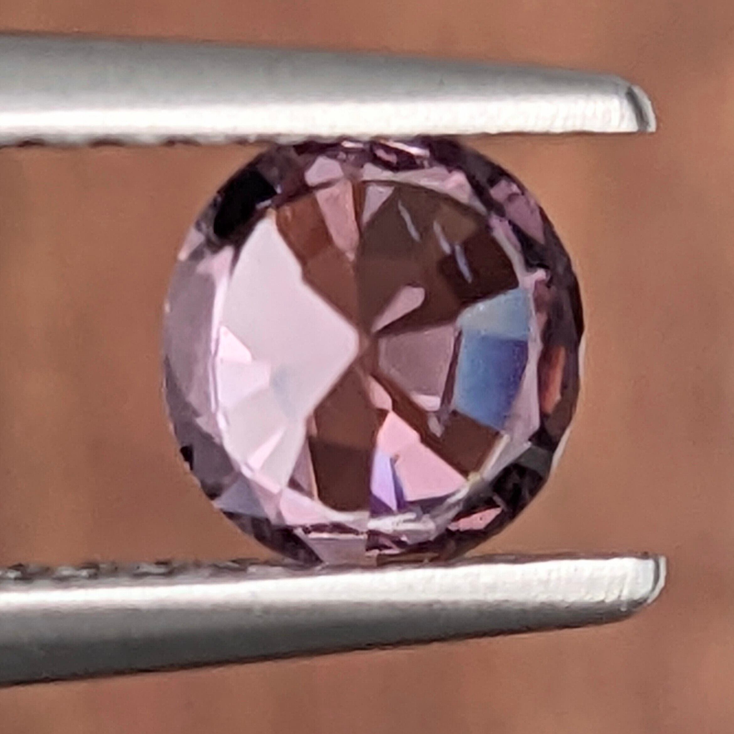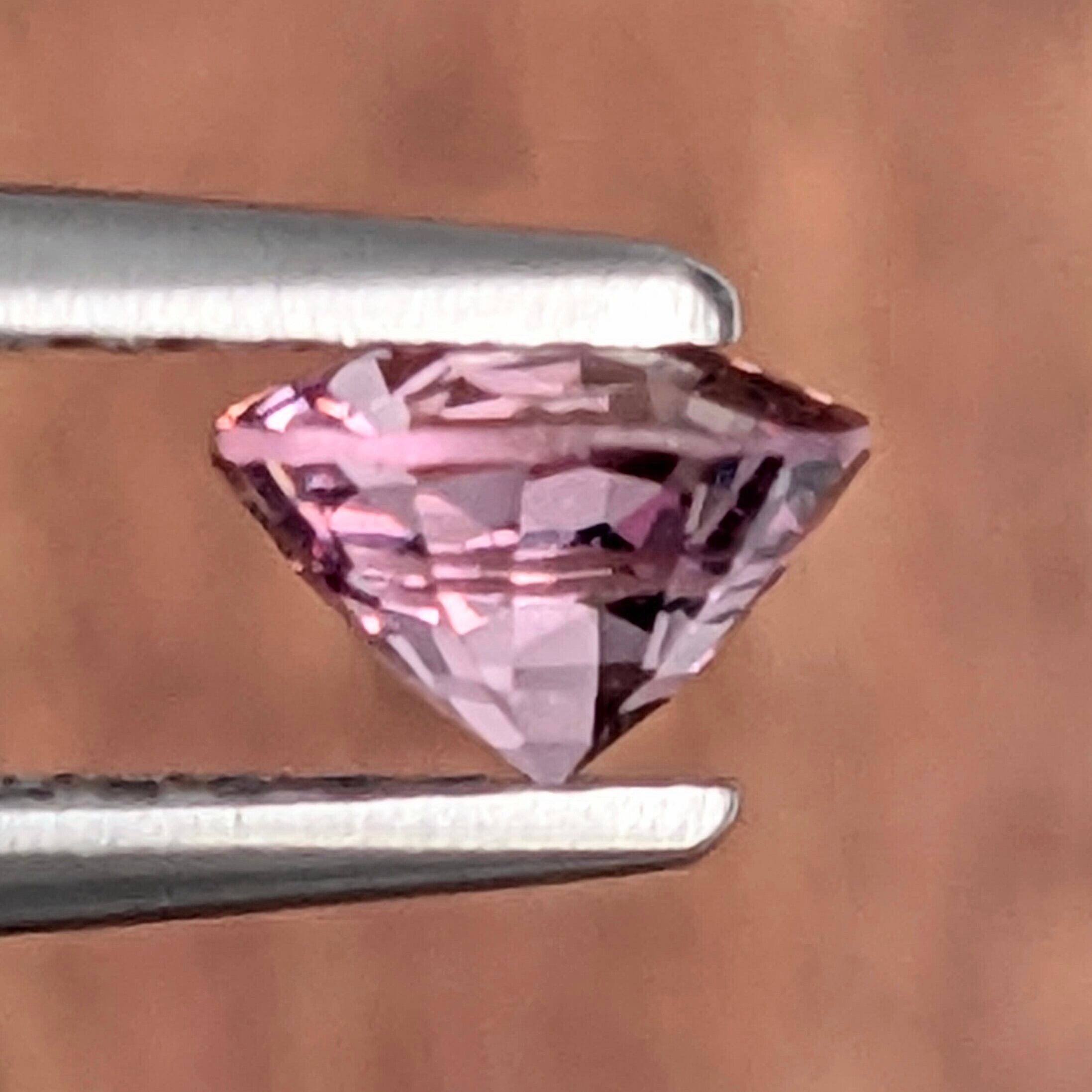 何色と言っていいのか・・・?ピンク系ではあるけれど、若干バイオレット味もあるような不思議な色合いのスピネル。少しでも光が変わると見え方が変わりそうな繊細な色味ですが、実際はスピネルの力強い硬度から生み出される強い輝きで物陰においてもその存在感は変わりません。失敗しない宝石の買い方は、「ちょっと暗い所で光にあてないで見てみる」。それでも美しい輝きを放つものが、本物の“宝石”です。