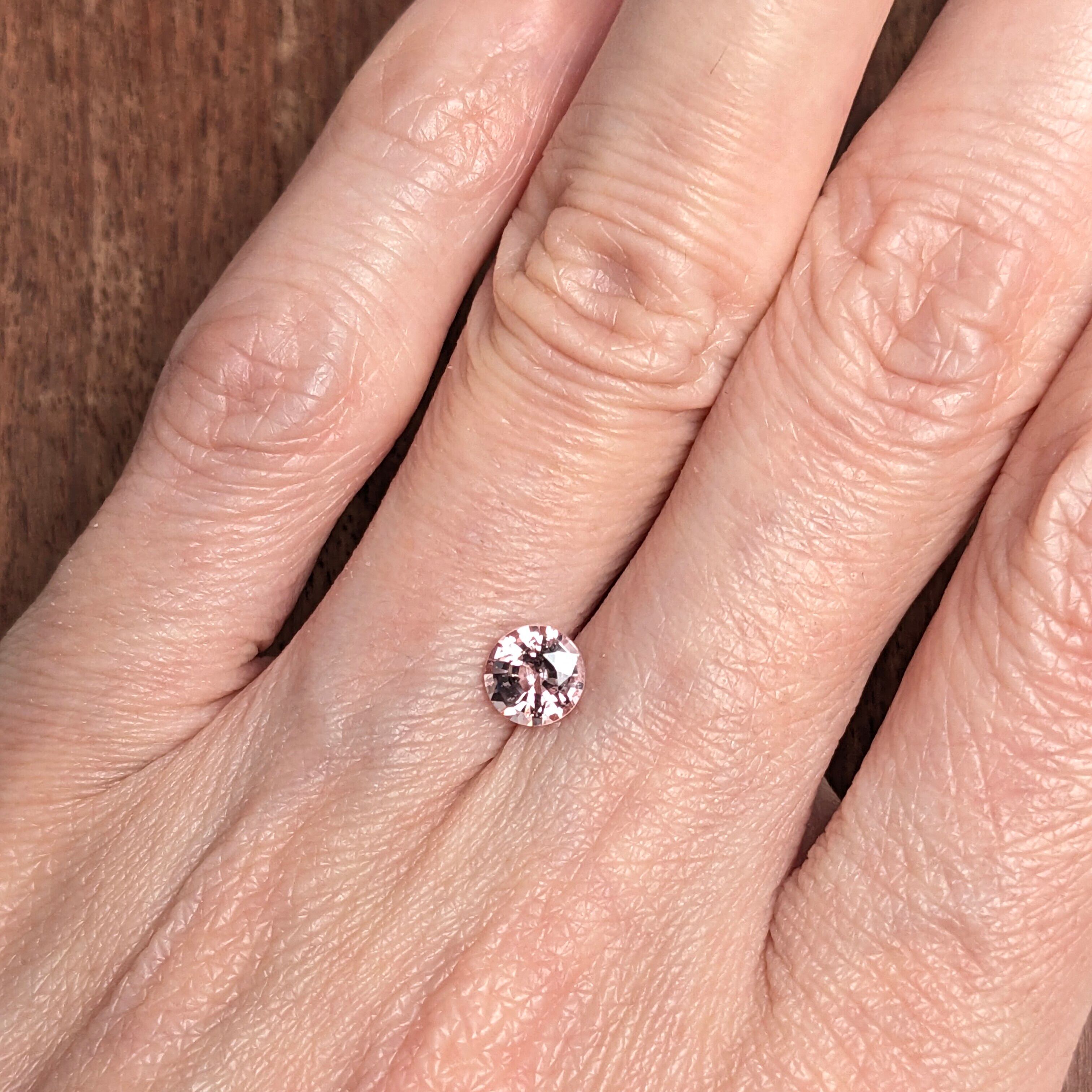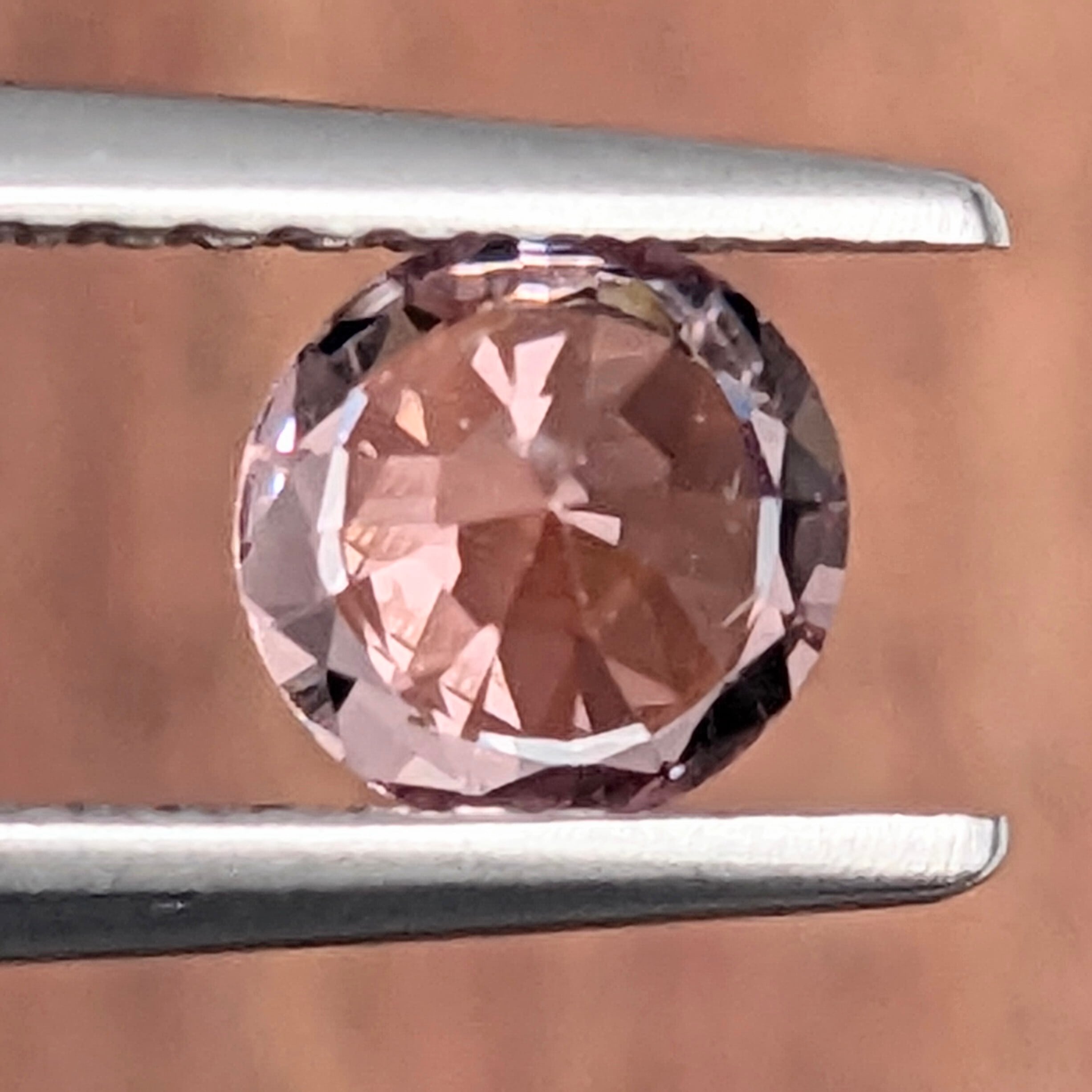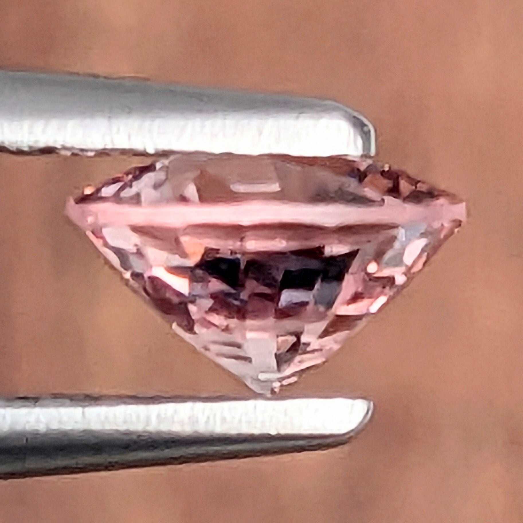 その淡い中間色とは対照的に、高い硬度から生み出されるテリの良い強い輝きが魅惑的な一粒。色合いは、ちょうどオレンジ色とピンク色の間のような、なんとも表現しがたい色合いです(でも恐らく、ピンク寄り)。インクルージョンはパビリオン面の下部の方に透明系のフェザーがありますが、肉眼での透明度や使用時、加工時の耐久性に問題があるようなものではありません。色の美しさをお楽しみください。