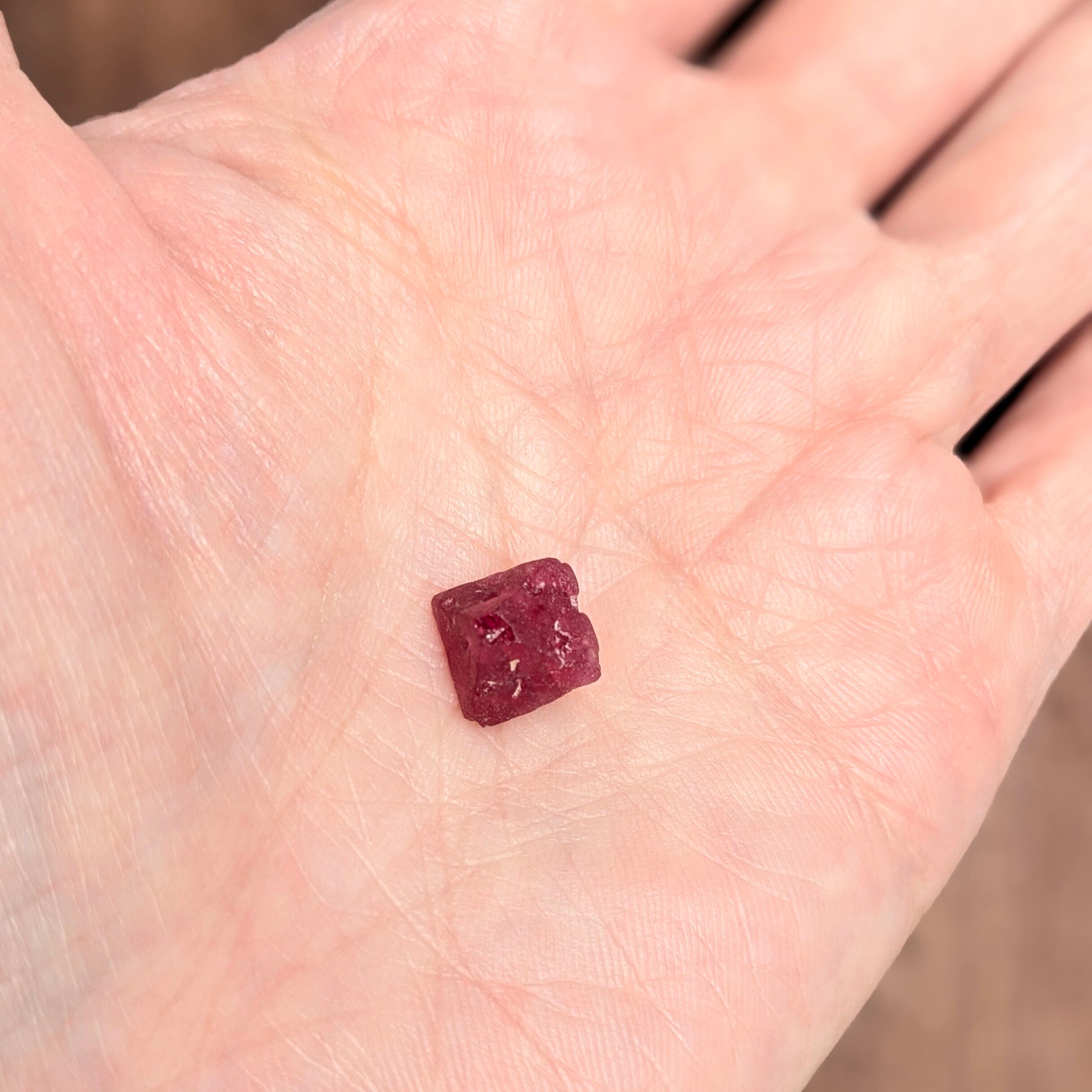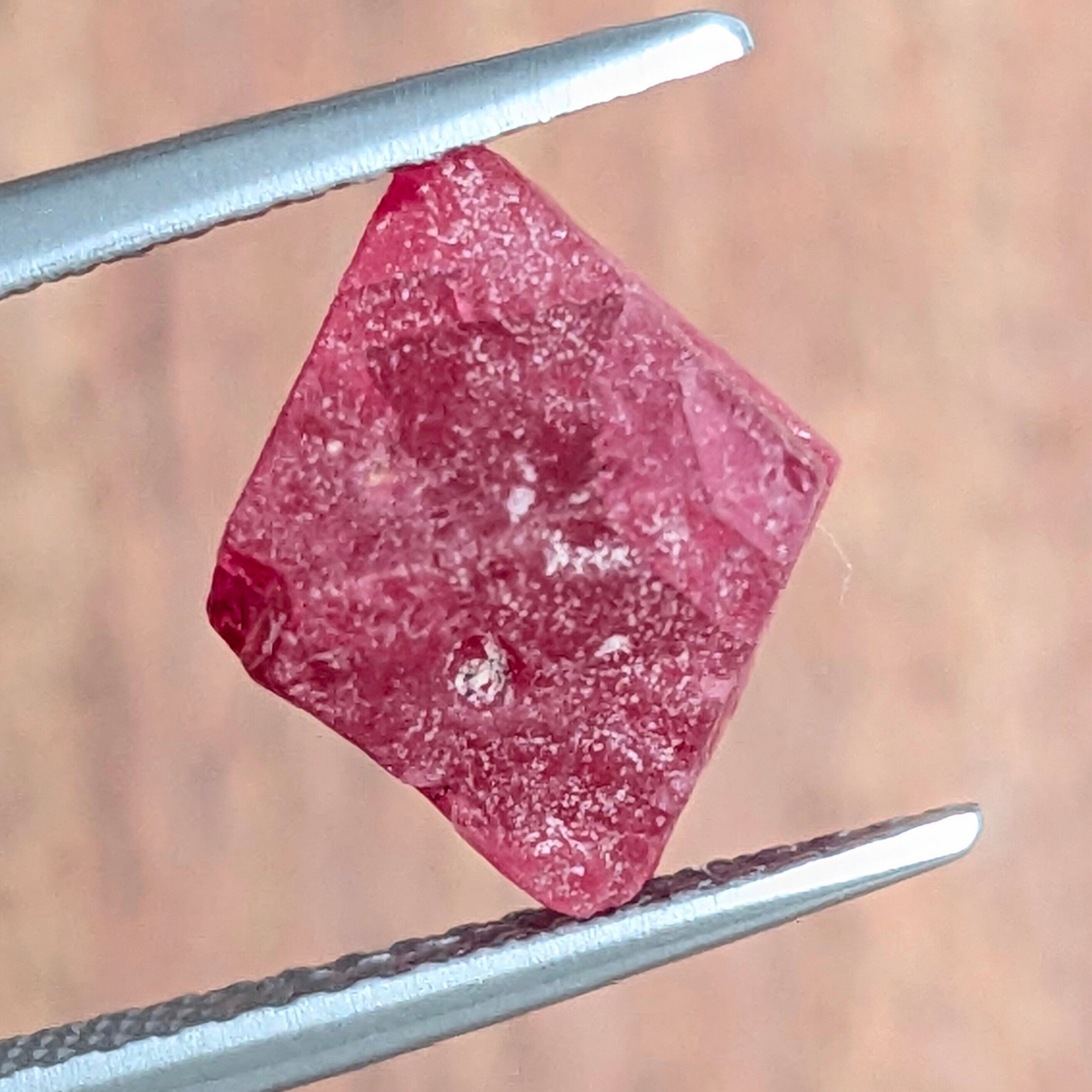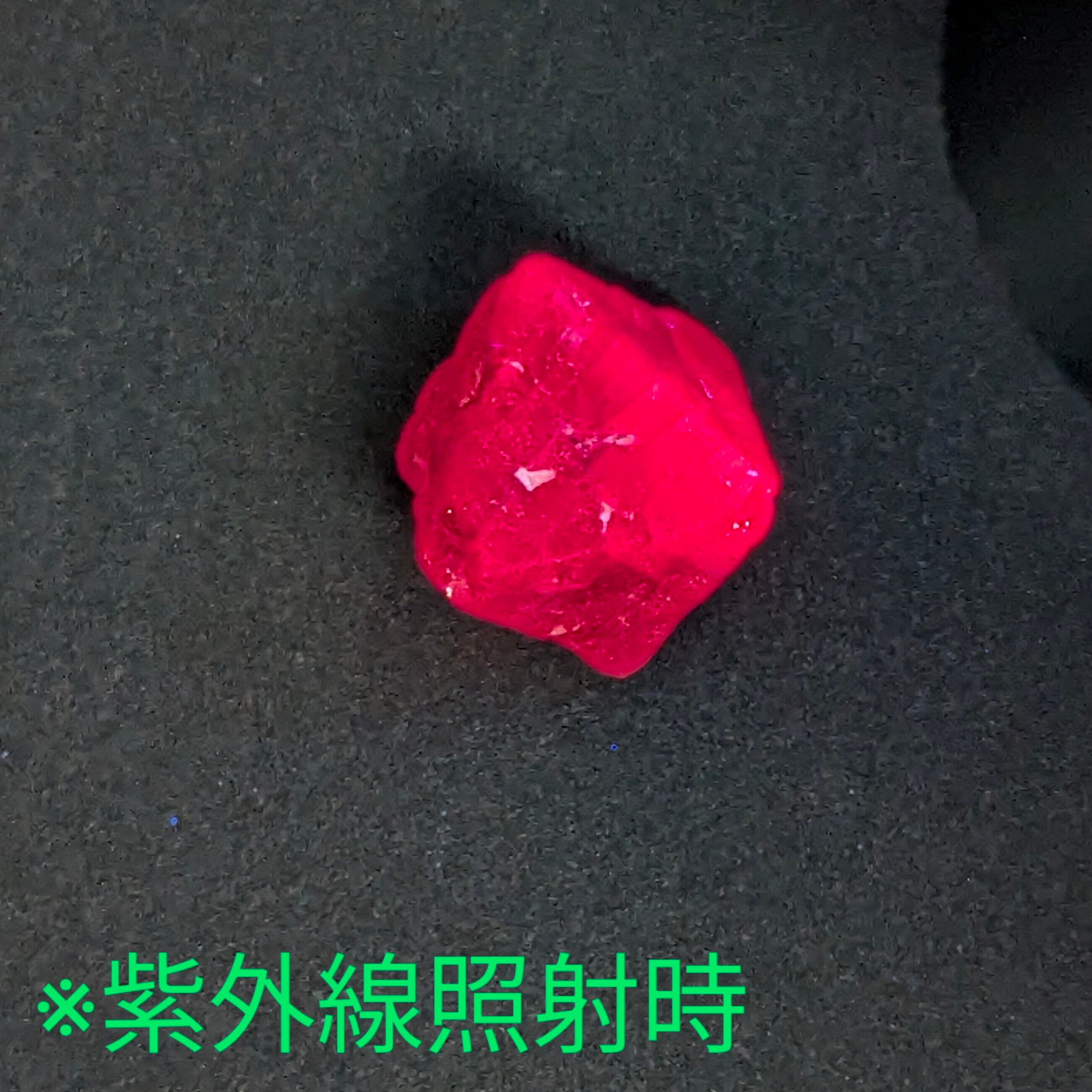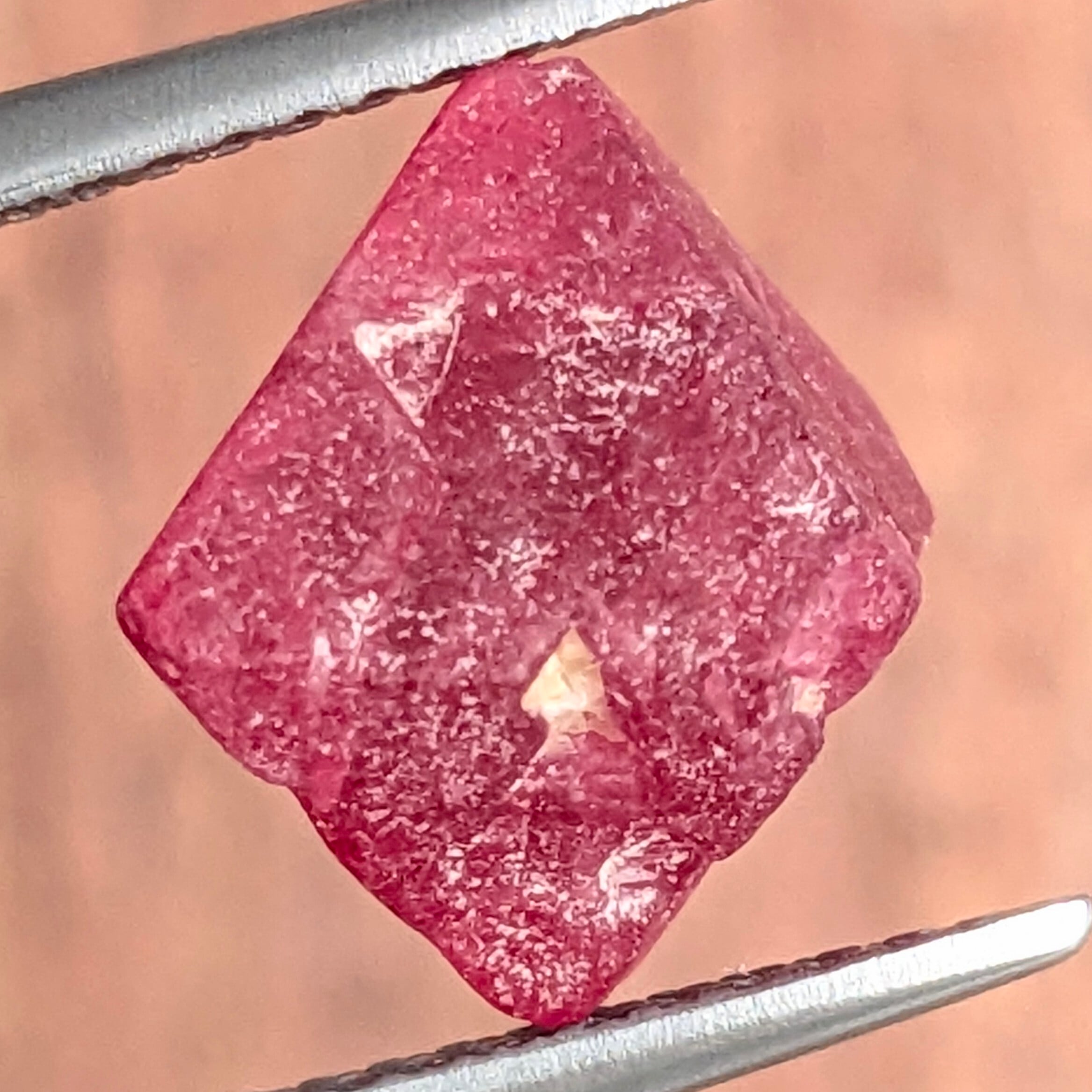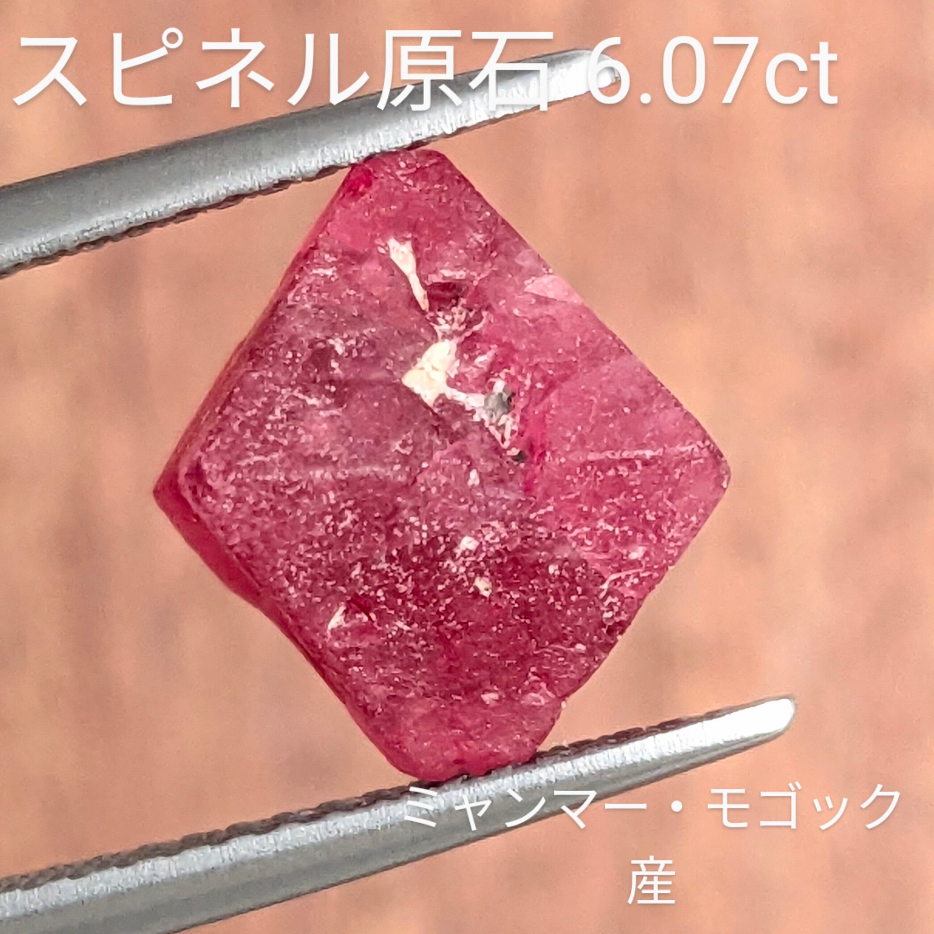 八面体のスピネルならではの、綺麗な結晶形をした原石。表面はちょっとマットですが、色は綺麗に発色している1ピースです。10倍のルーペで拡大してみると、表面の蝕像(しょくぞう=熱水や酸によって生じた凸凹模様)から、私たちの手元に来るまでに如何に過酷な環境をかいくぐってきたのかを想像することができます。一筋縄ではいかないのは、宝石が成長するのも私たちの人生も同じなのかもしれません。これからは、出会ったあなたと共にこの宝石は歩んでいくことでしょう。
