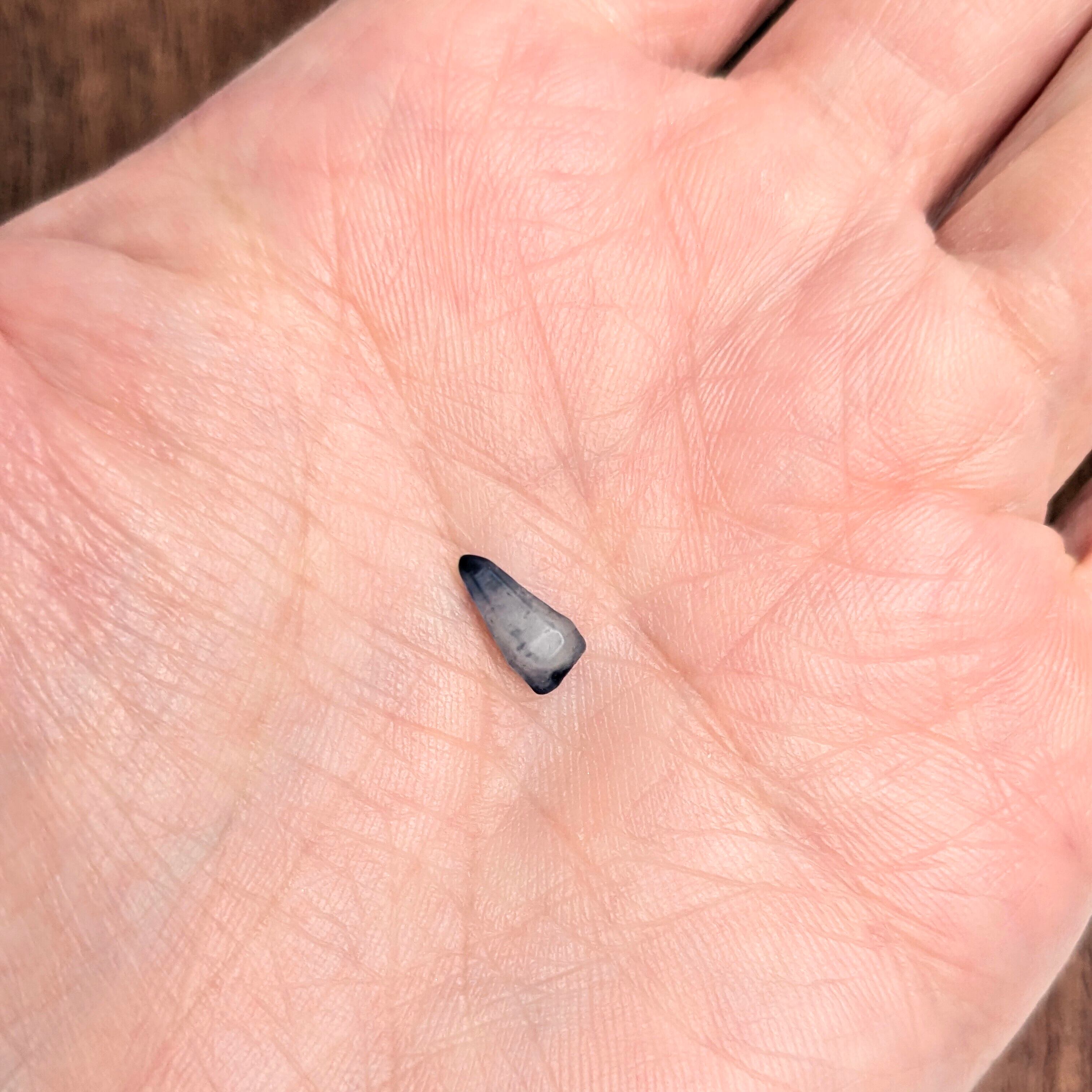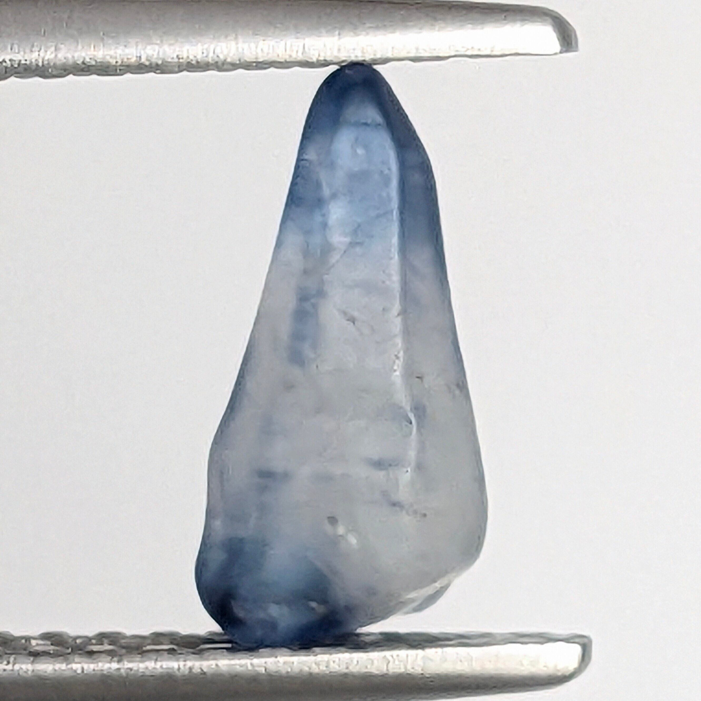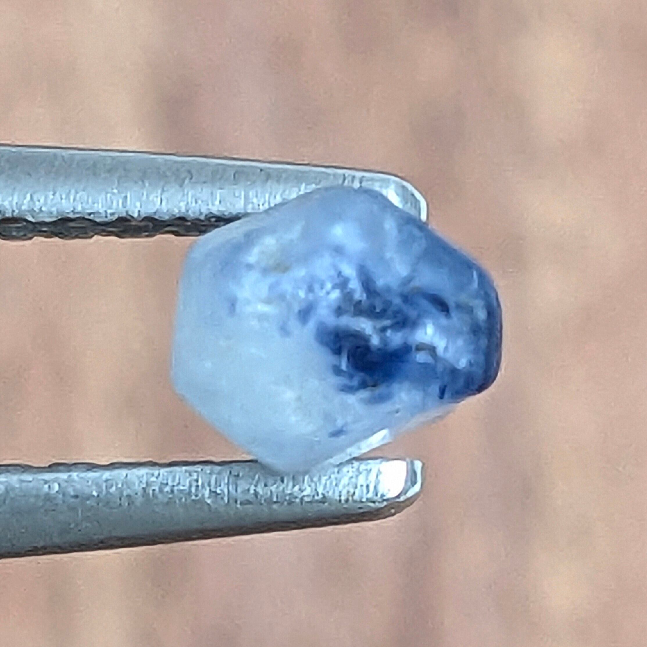 宝石を語るときに、見た目の美しさよりも専門的なことを話すことは極力避けたいのですが、こちらの原石に関してはそこの部分をクローズアップしないと本当の意味での面白さが伝わりません。サファイアが属する「コランダム」という鉱物は“六方晶系”と言い、結晶の断面が“ 六角形”になっている点がポイントです。このピースのブルーの色ムラも、その性質に倣って成長の際に色付いたもの。木における“年輪”にあたるものが、サファイアにおける“色ムラ”になってその姿を現すのです。