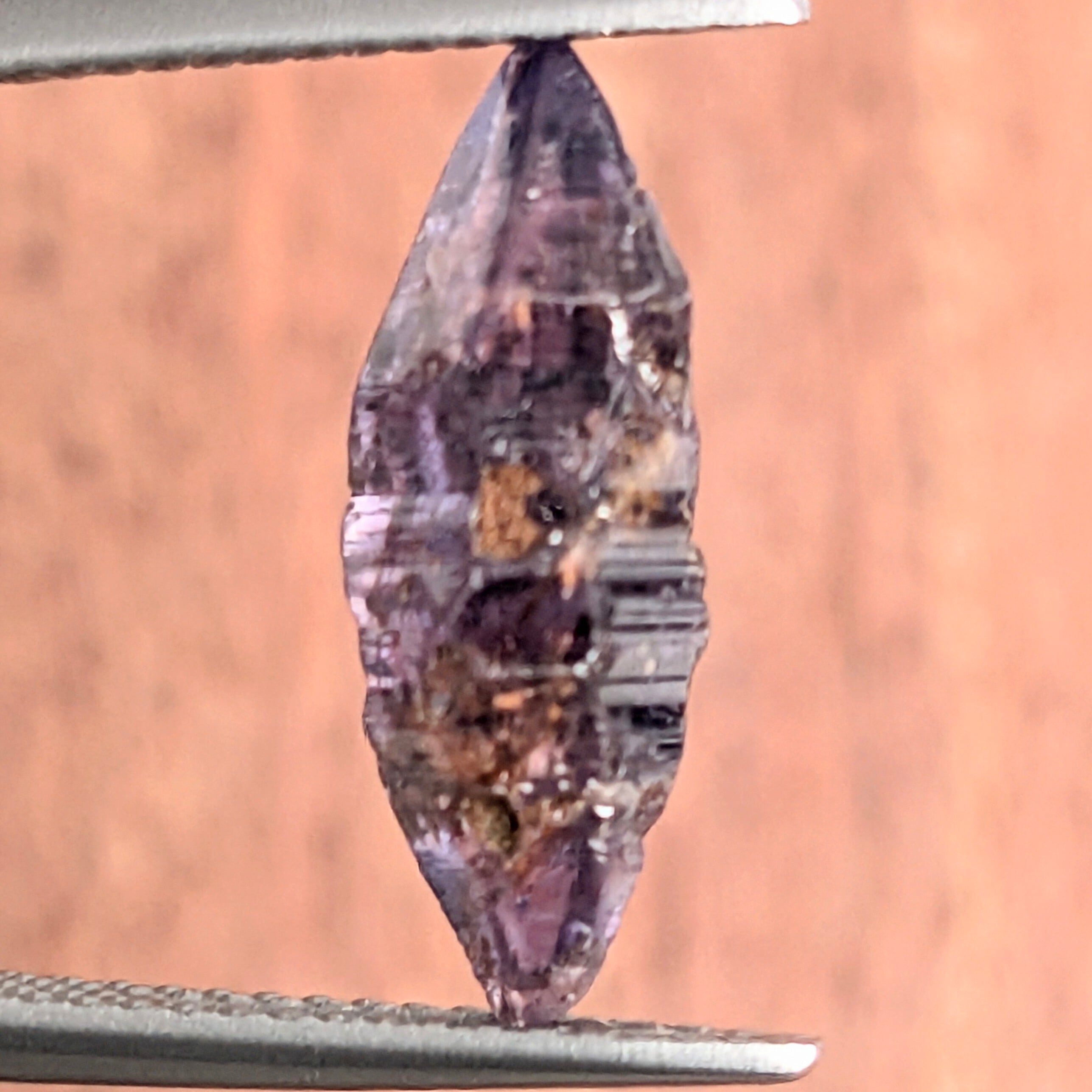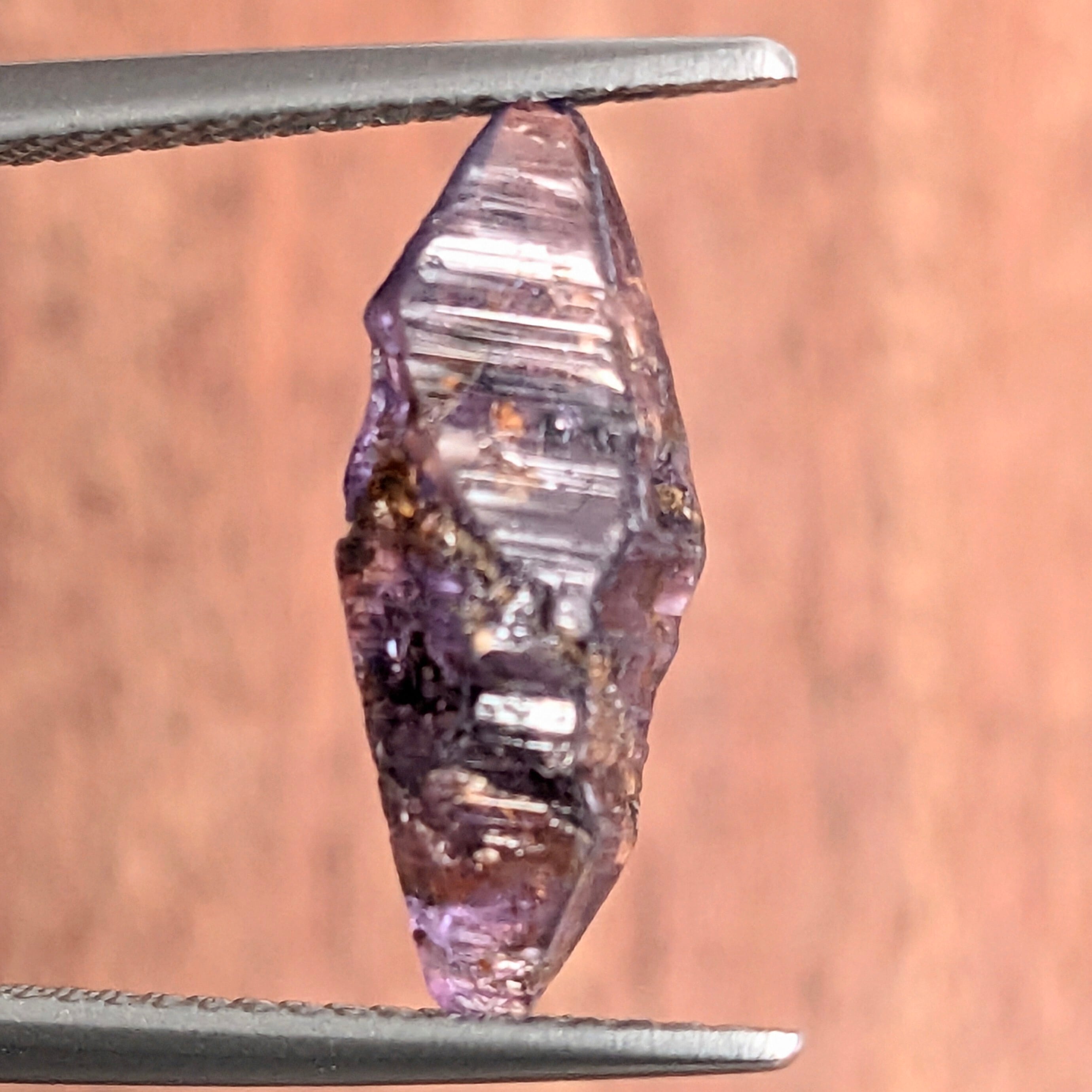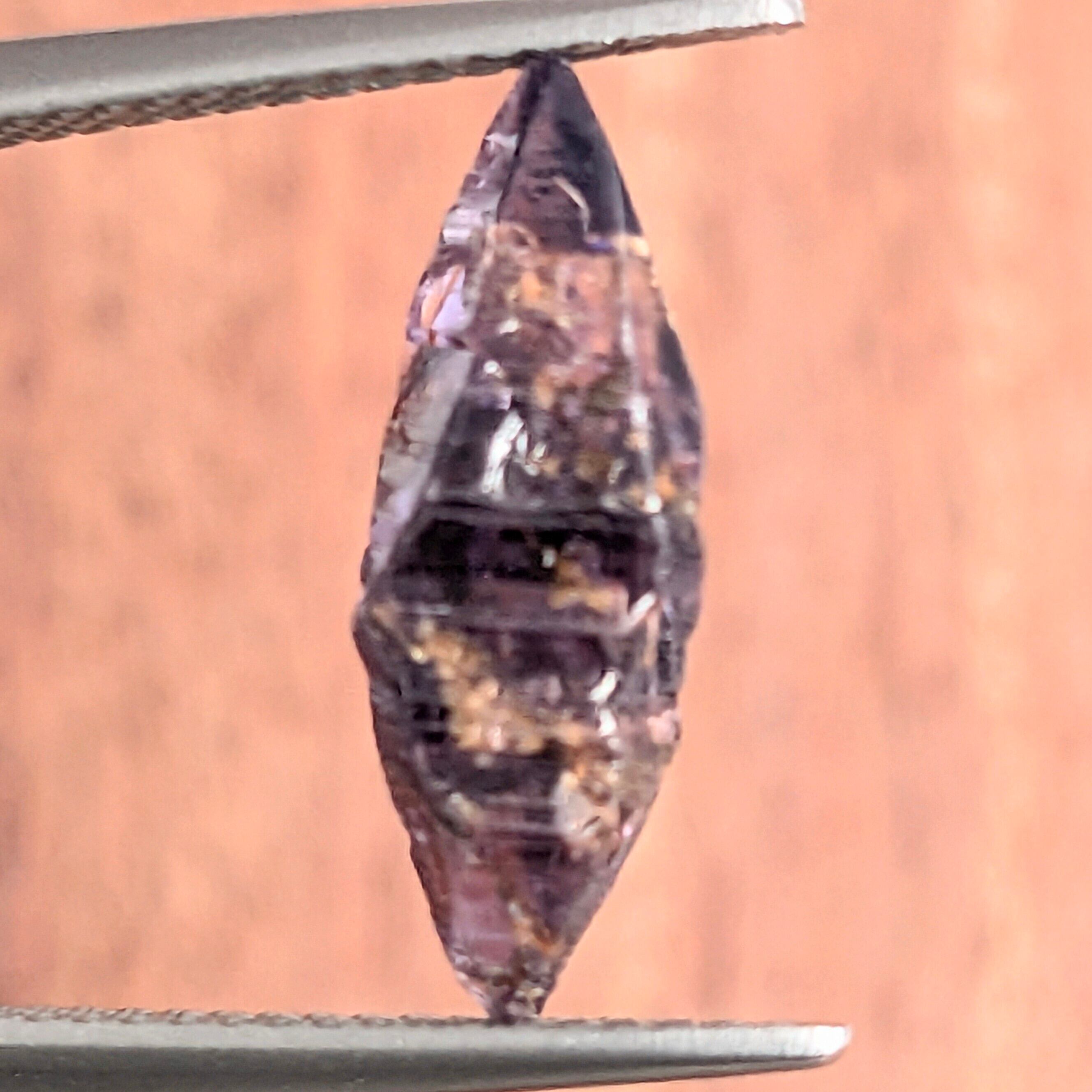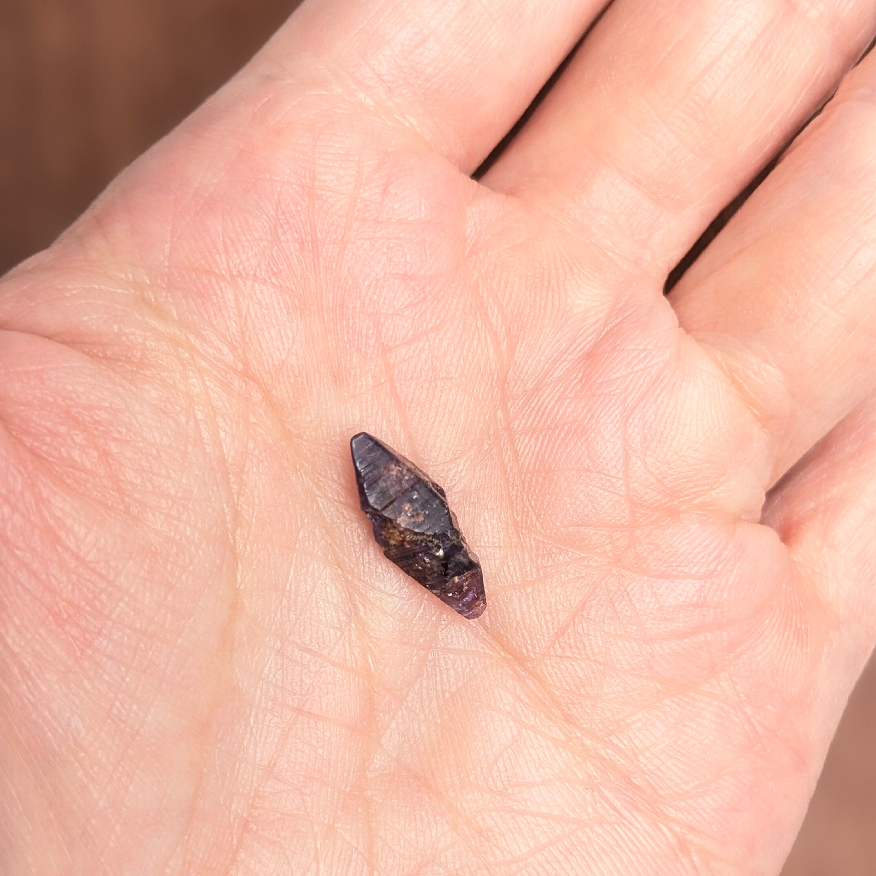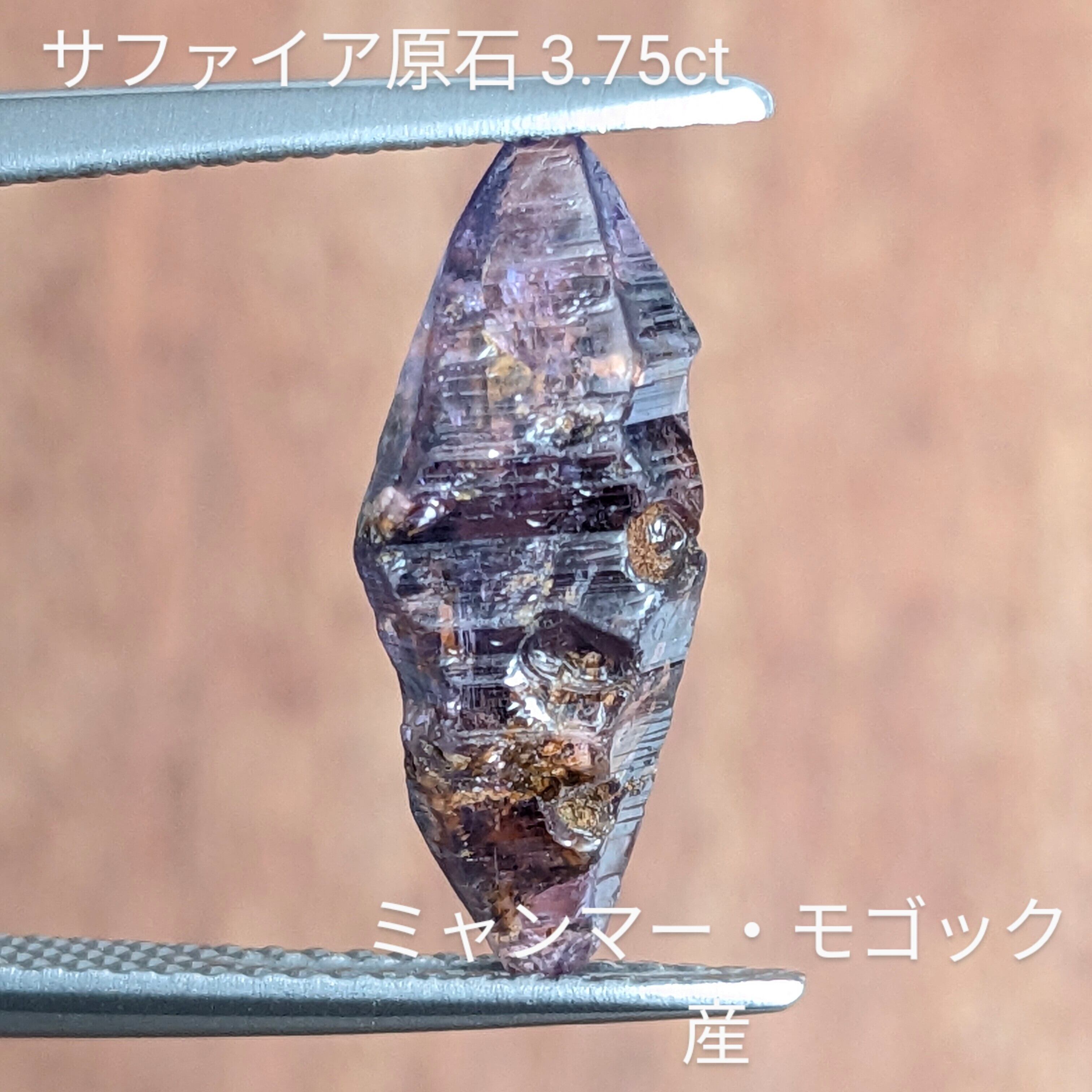 見事に美しい両錘形をしたサファイア原石です。写真だとちょっと暗く見えますが、実物はもう少し艶があり、透明感も感じられるパープルといった色合いです。結晶面に対して横に入っている線は、“条線”と呼ばれる結晶する際にに伴う成長線。サファイアが属する「三方晶系」という結晶形の特徴をすべて備えた、“原石好き”には見逃せない1ピース。光に透かすと、ブルーやパープルの色ムラが私たちの目を楽しませてくれます。
