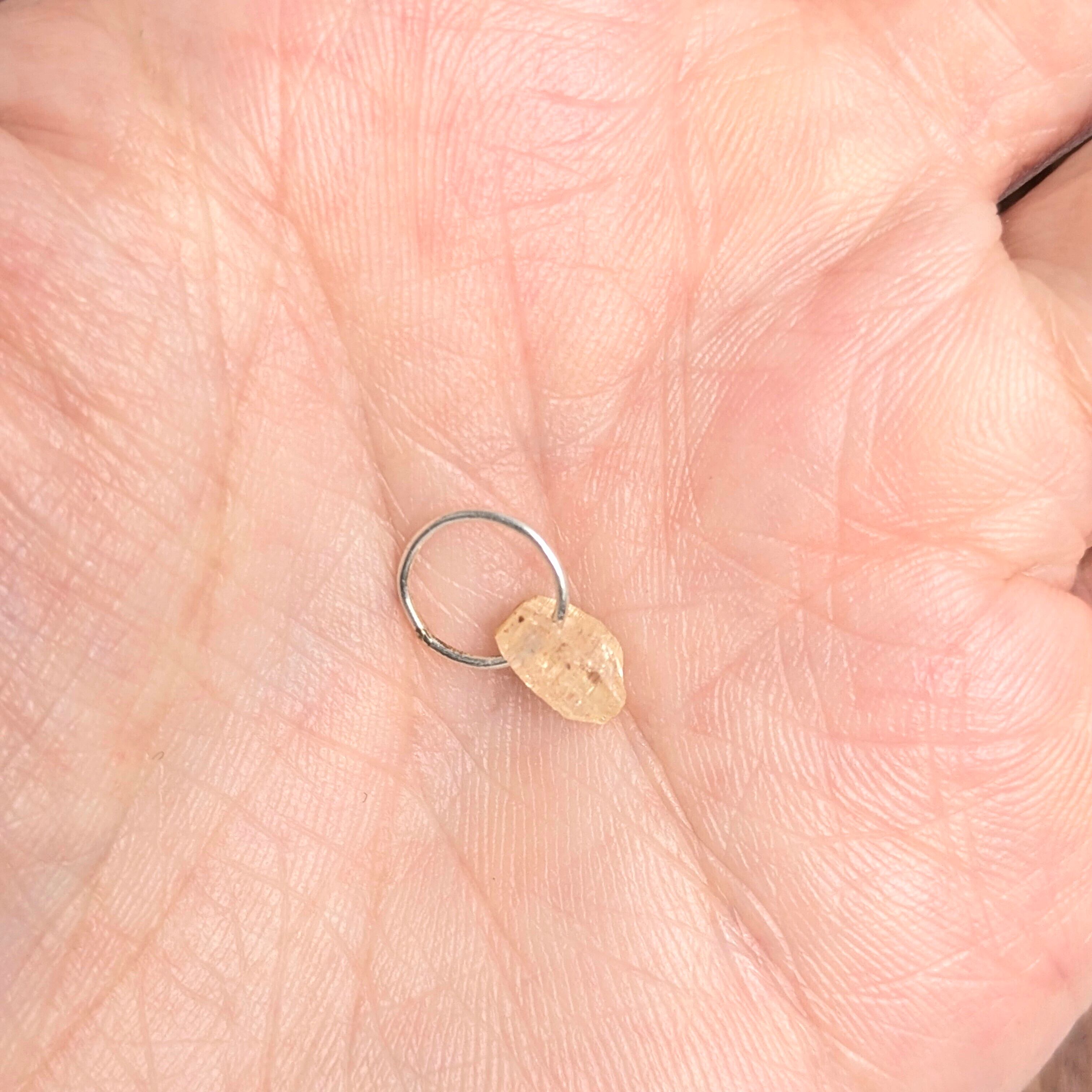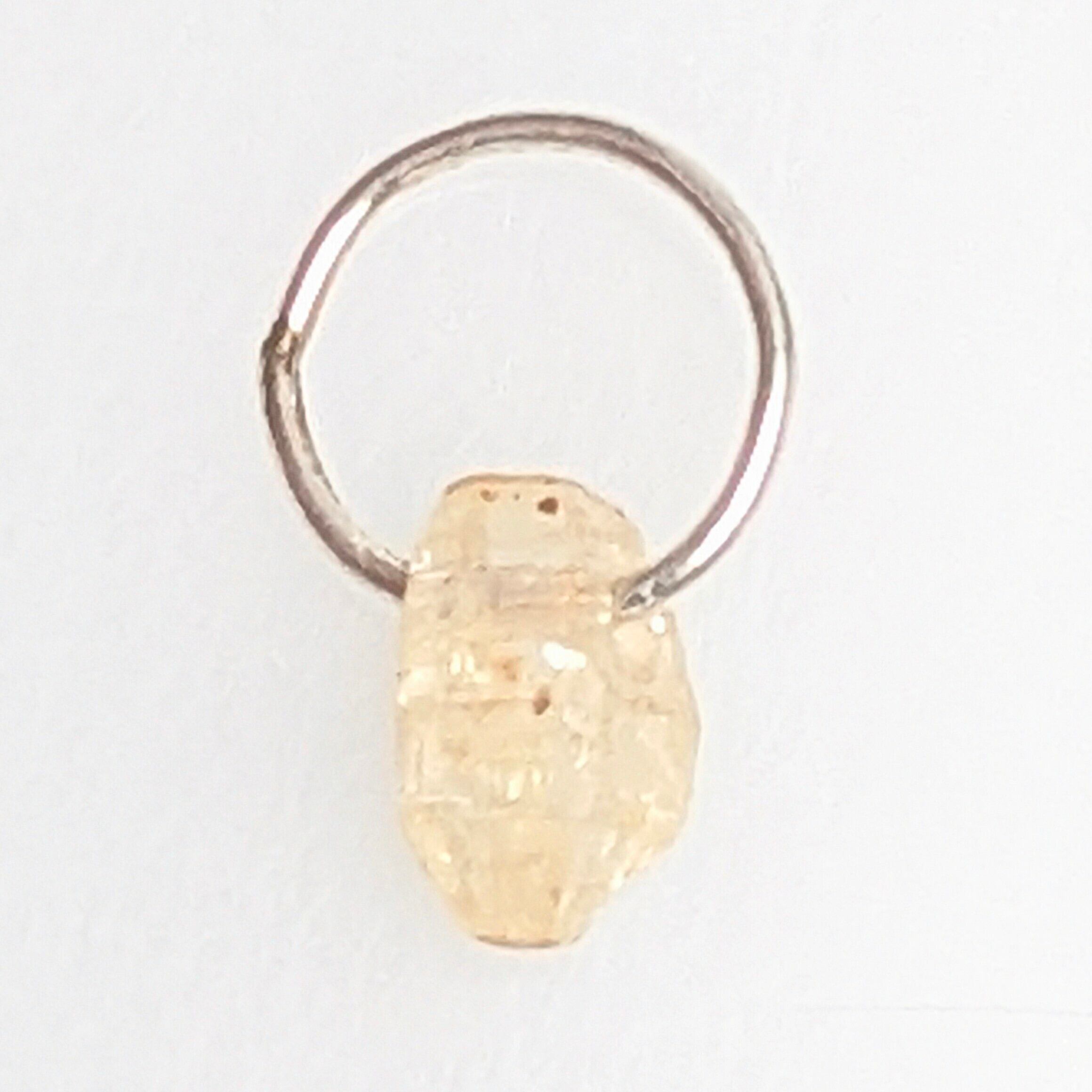 若干イエロー味を帯びておりますが、ほぼ純粋な“コランダム”と呼んでしまっていいと思います。カラーレスのサファイア原石です。サファイアはモース硬度9と非常に硬く、そのことが原石表面のまだ未研磨の「テリ、ツヤ」からも推測することができます。すりガラス状に濁った原石も多いですが、今回ご紹介のチャームに使用したのはその「艶めき感」が印象的な一粒。結晶形も肉眼で楽しむことができる、鉱物好きにもたまらない1品です。