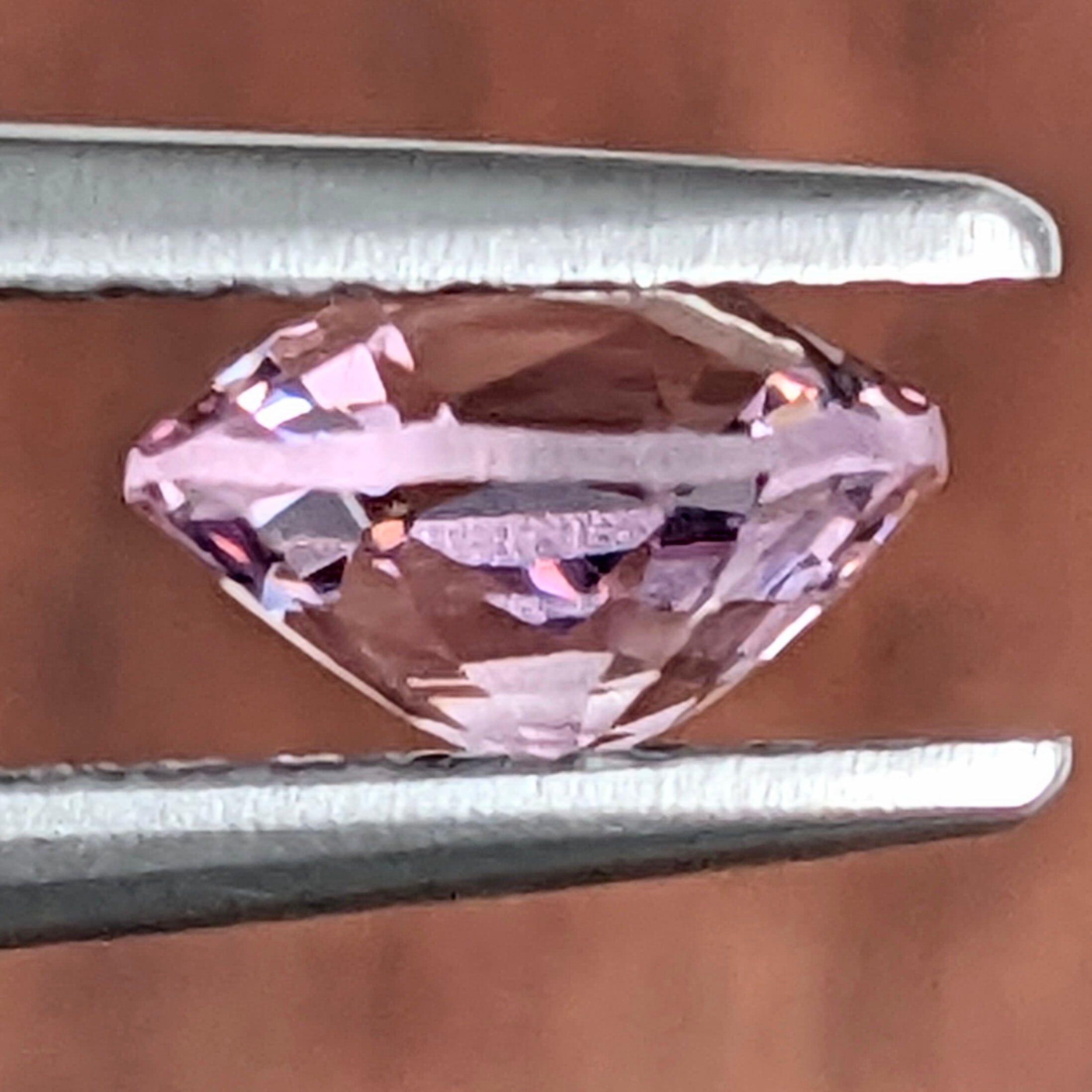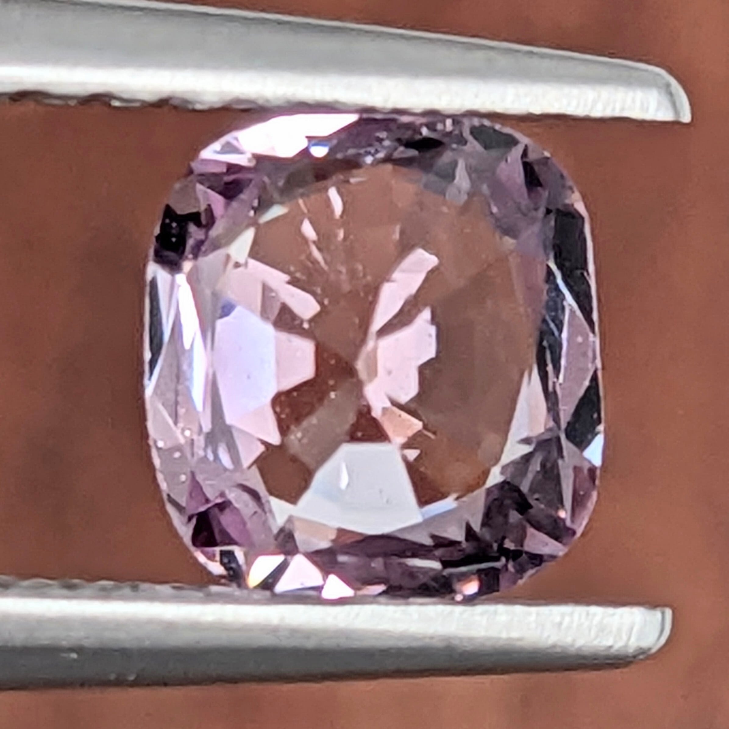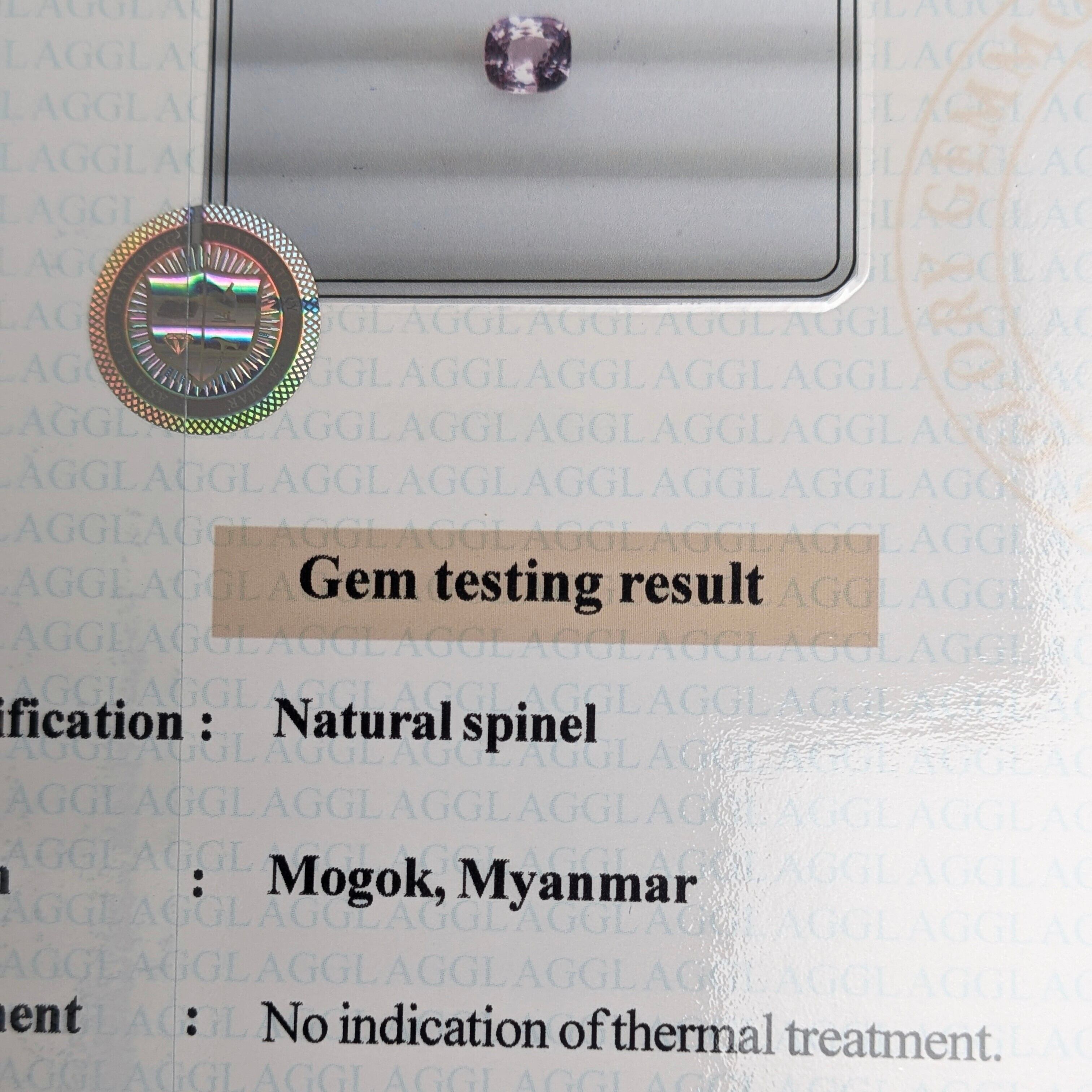 ほとんどインクルージョンのない、とても輝きと色合いが美しい1粒。朝露を透かして見たスミレの花のような、新鮮な美しさが魅力的です。スピネルの分散度(白色光を7色の成分に分散させる値)は「0.020」。ダイヤモンドの「0.044」の値と比べると半分くらいですが、硬度の高さから生み出される“テリ”によって、補って余りある輝きを楽しめます。今回は、とても可憐な色合いでお届けいたします。
