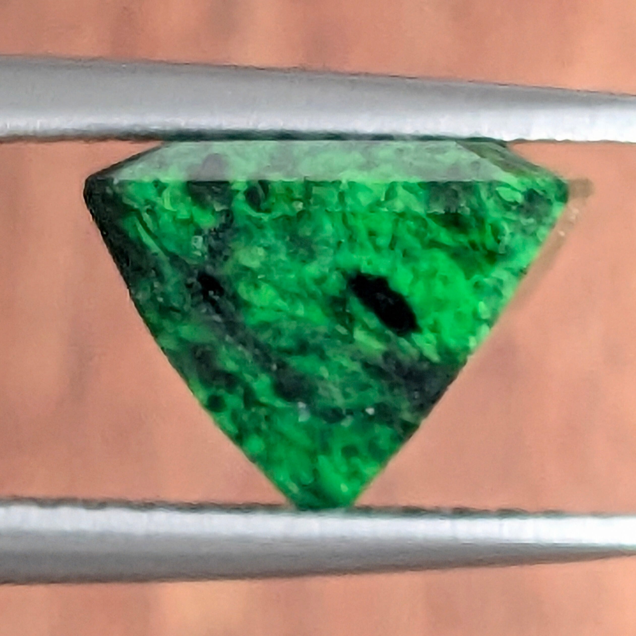 なかなか目にすることのない、覚めるように鮮やかなグリーンが印象的な「マウシットシット」。一見不透明な結晶に見えますが、実はよくよく拡大してみると大元の基盤は透明なのが所々で確認できます。子供のころに、思い思いに絵の具を絞り出し、それを筆を洗うバケツでくるくると溶かしこんだような、流紋形の模様がとても個性的です。一個一個の、違った雰囲気をお楽しみください。