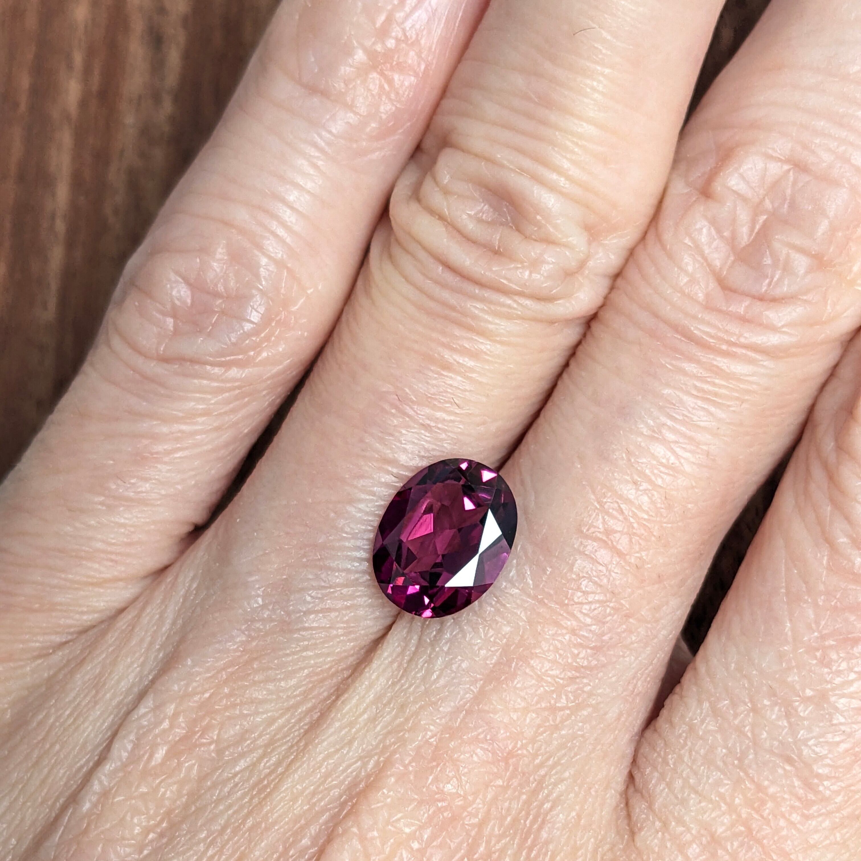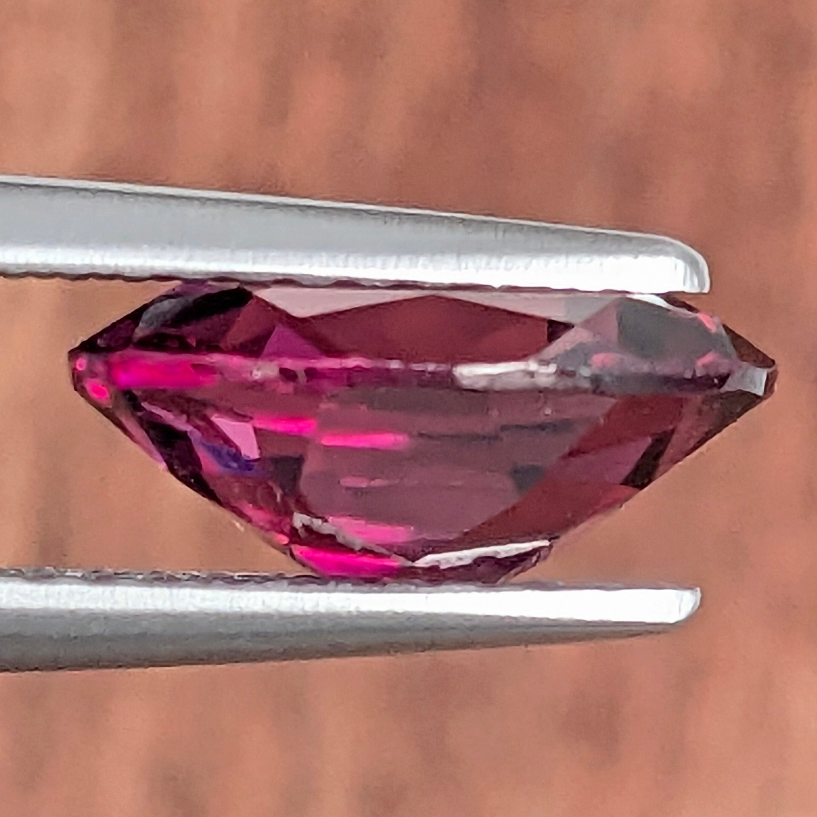 今回のこのロードライト・ガーネットの輝きを見ていて、“夏”という季節的なものもあると思いますが「夜空に花咲く、赤色の花火のようだな!」と心がときめき、花火の赤色の原因を調べたら“硝酸もしくは炭酸ストロンチウム”というとても科学的な答えが出てきたので、「謎は謎のままでもいいのかもしれない・・・」とそっと心にしまいました。そんな美しいロードライトガーネット自体も含まれる「Mn(マンガン)」や「Fe(鉄)」という元素が色因になっています。とても美しいワイン色の1ピースをご紹介いたします。