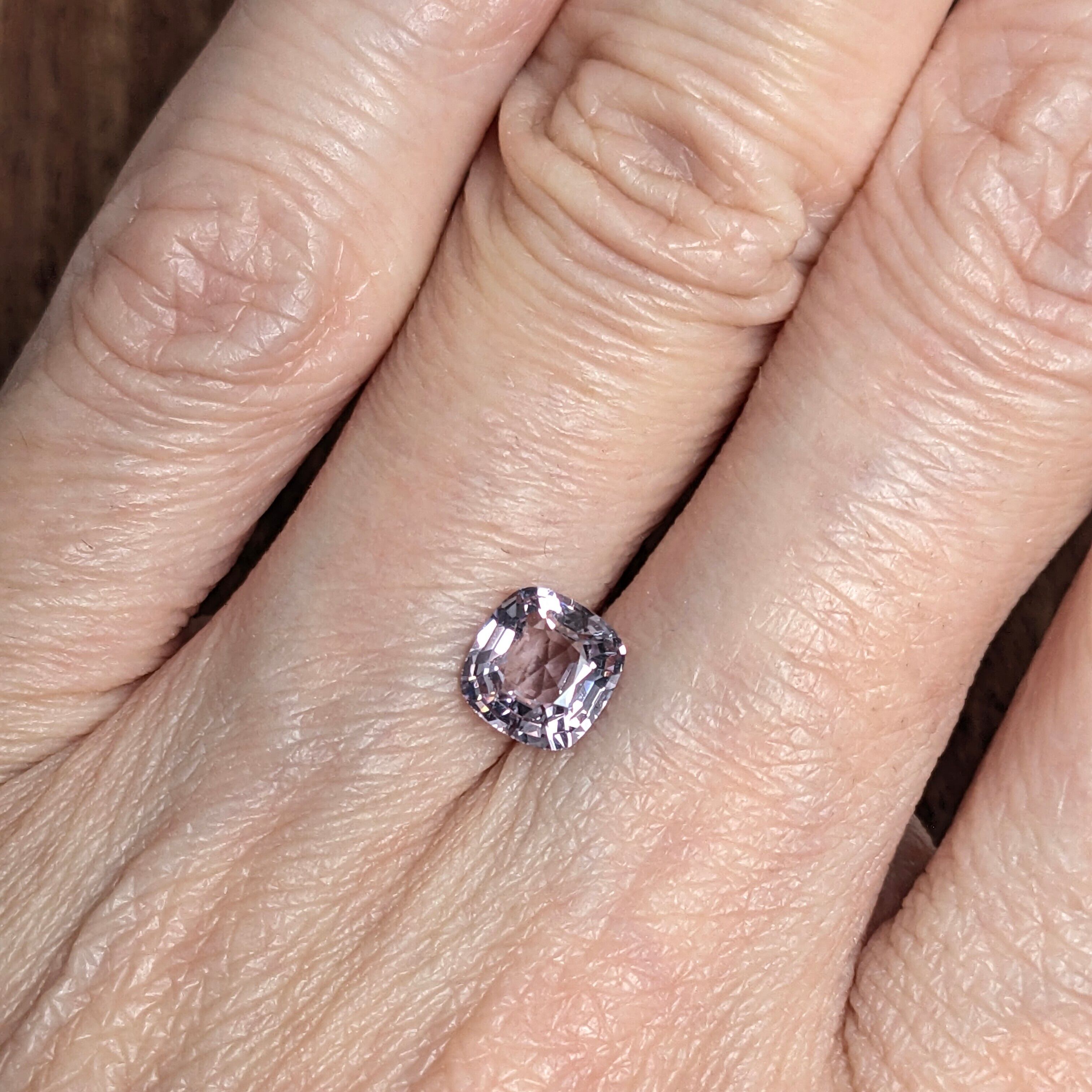 きっと、人の思い出の中にある「夕焼けの色」というのは、地域によっても世代によっても違うものだと思います。個人的には“追憶の中の夕焼け色”と呼んでいるこの「グレー味を帯びたパープル」のスピネル。いつものように、インクルージョンの確認のためにルーペで覗いてみました。するとそこには、夕焼けを背に群れで寝床へ渡る鳥たちの陰影が・・・!この正体はインクルージョンですが、まさに「ハッ・・・!」と記憶を呼び起こさせる、風情のある石です。「インクルージョンは、物語を刻む」、まさにそう感じる1ピースです。