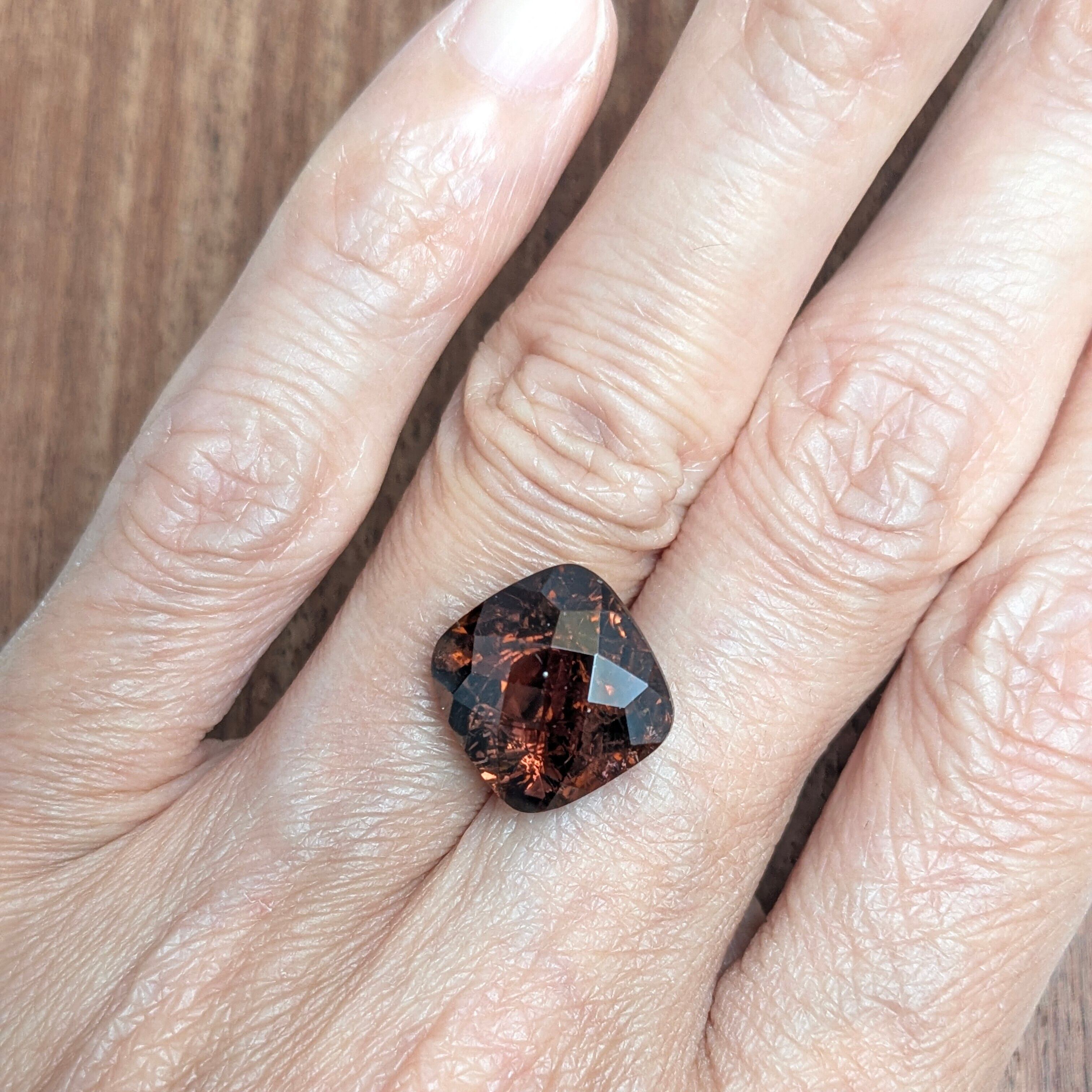 “チェスカット”が施された、とても表情豊かな輝きのトルマリン。7.76ctというボリュームで登場です。その色合いは、一見赤味の強いブラウンに見え、その輝きはまるで極上のウィスキーを思わせます。内部には、これまた泡を思わせる煌めくインクルージョンが漂い、一つ一つがランダムに反射する光によって、カットにプラスアルファの躍動感を添えてくれています。なかなか雄々しい1粒。丸ごとすべて受け入れてくれるあなたをお待ちしています。