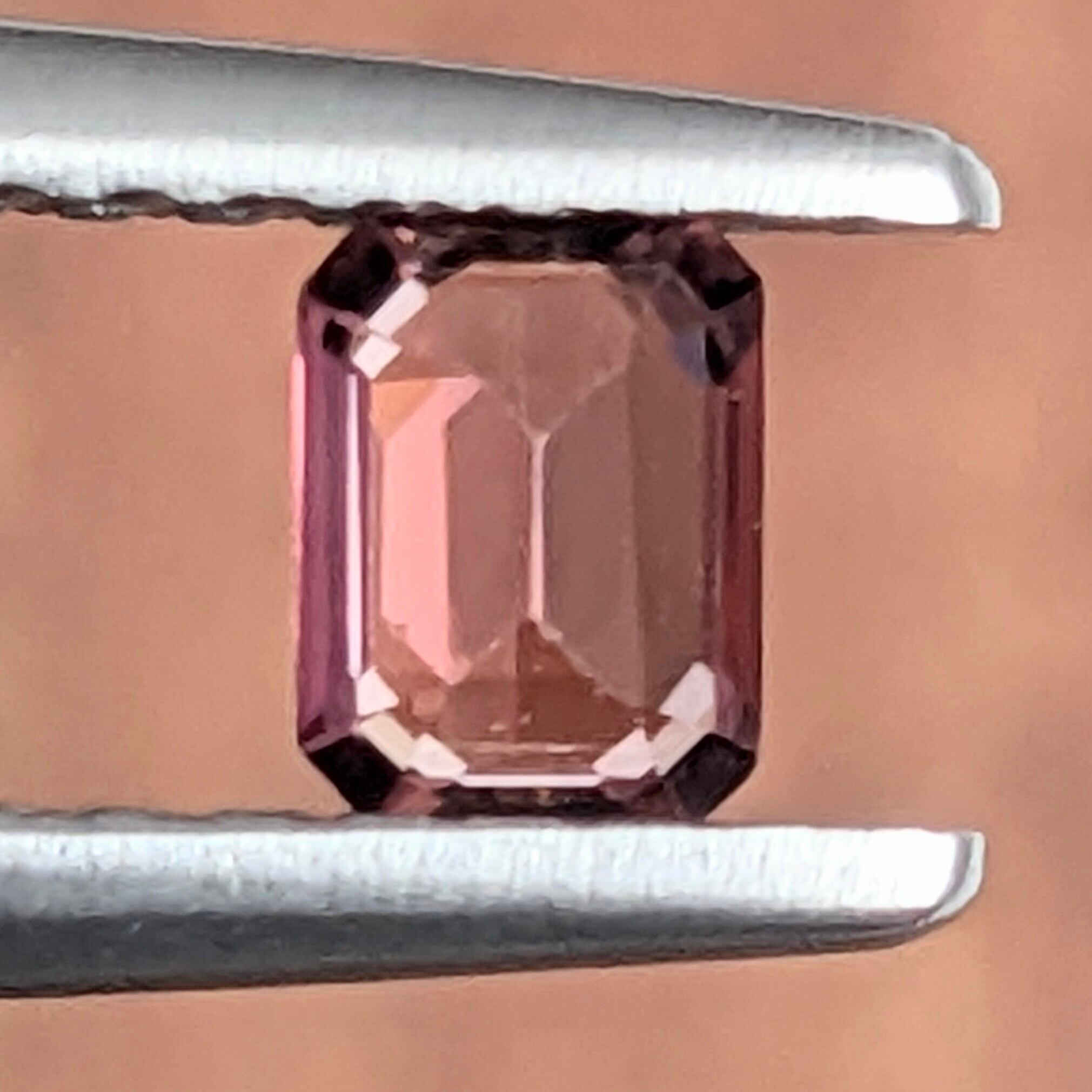 「暖色系の宝石で、エメラルドカットにされているものって意外とあまり見たことないな・・・」というのが第一印象。この系統のピンク色は、どうしても果物系を想像してしまいますが、直線的なエメラルドカットにされているとまた新鮮で違った印象を受けます。肌馴染みの良い、オレンジをかんだピンク色。どことなく大人っぽくて、でも柔らかな印象で、どんなシチュエーションでも活躍してくれそうな、万能の美しさを感じます。