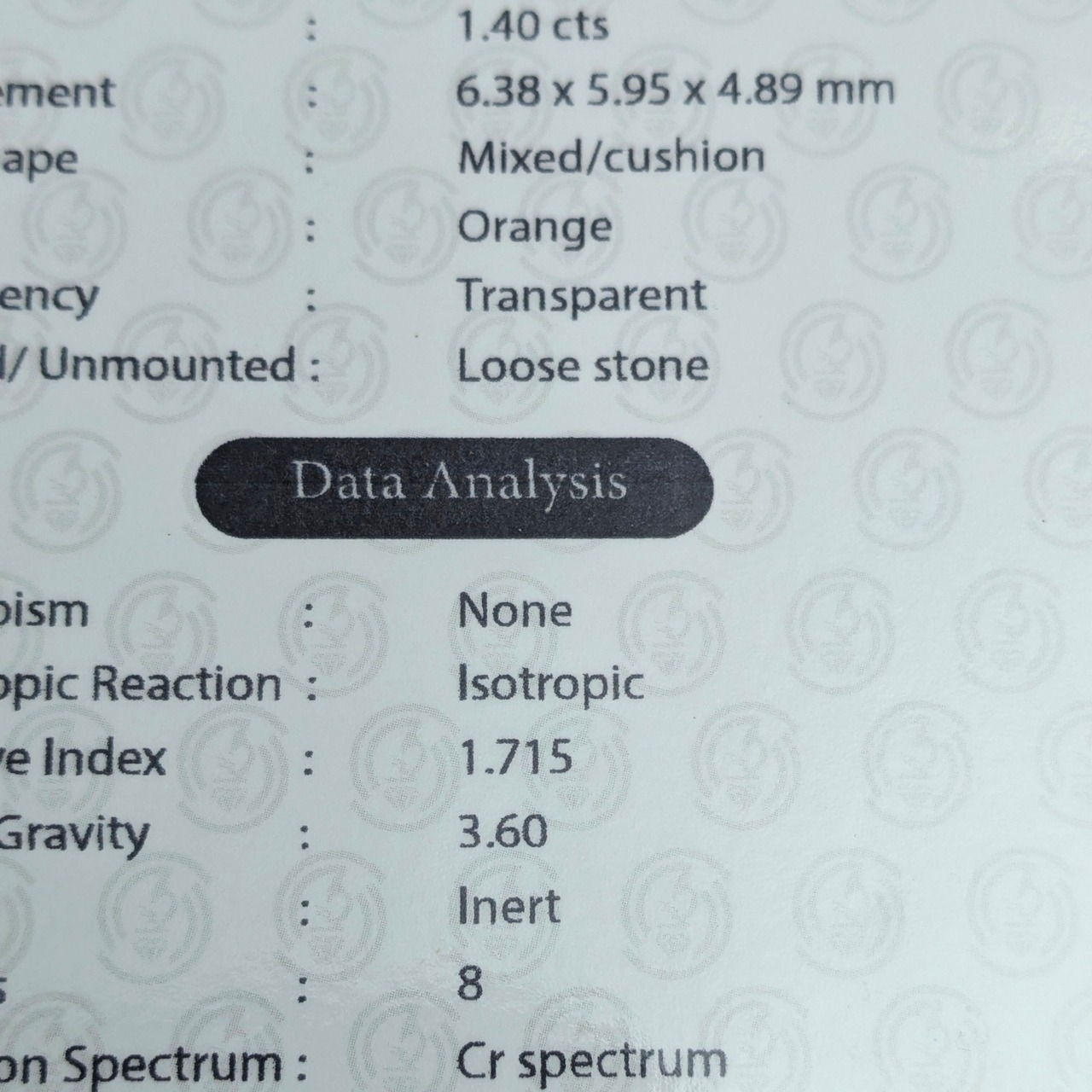 画像ですと限りなく赤色に見えますが、鑑別書上では“オレンジ”とされているスピネルです。若干色が落ち着いたトーンで、ちょっと大人びた雰囲気が素敵な印象の1粒。ちょっと大きめのフェザーが入っていますが、基本的には白濁したようなものではないので、肉眼でわずかに“表情がついて見えるかな”といった印象で、美しさをそこまで妨げるようなものではありません。角度によっては、煌めきにアクセントを添えてくれています。