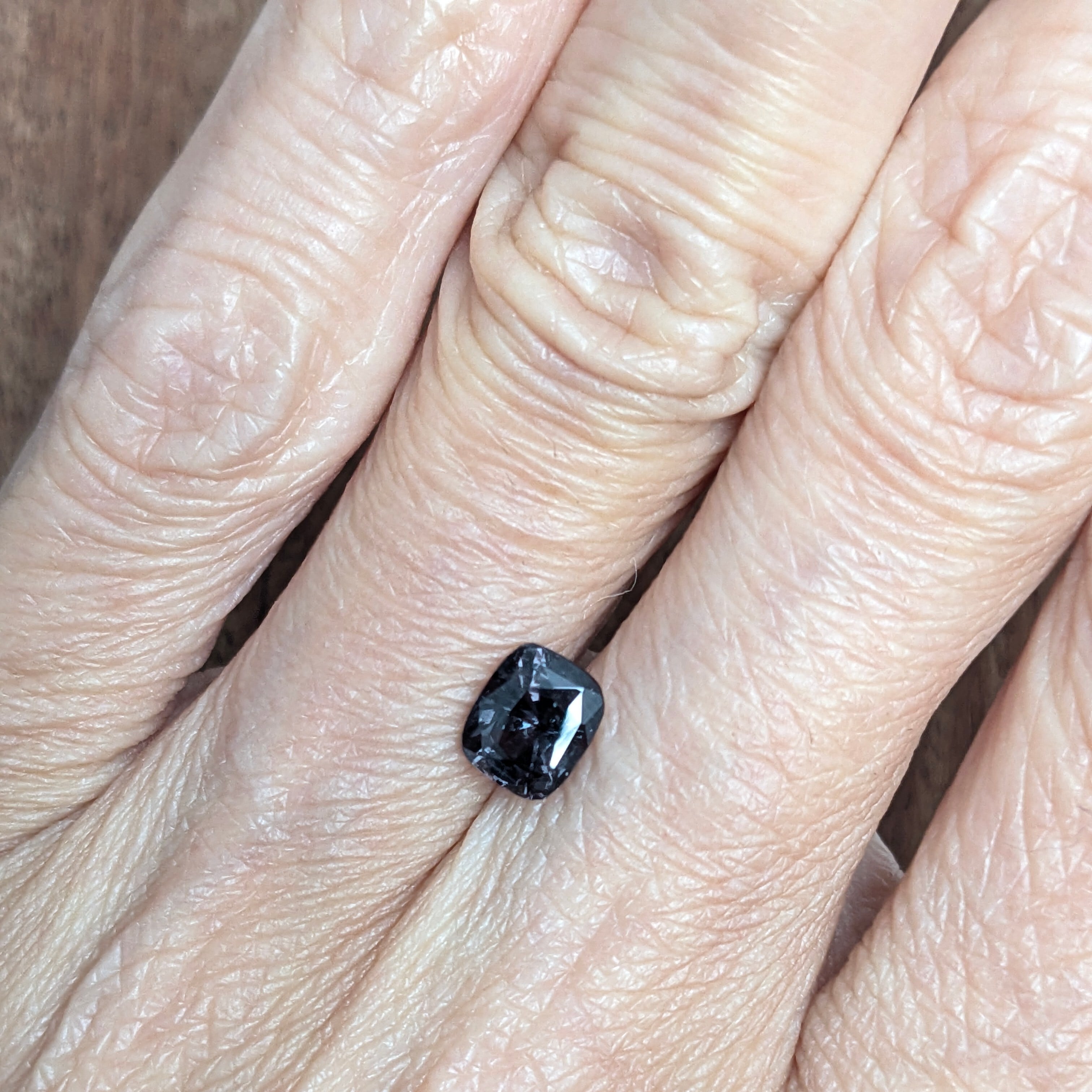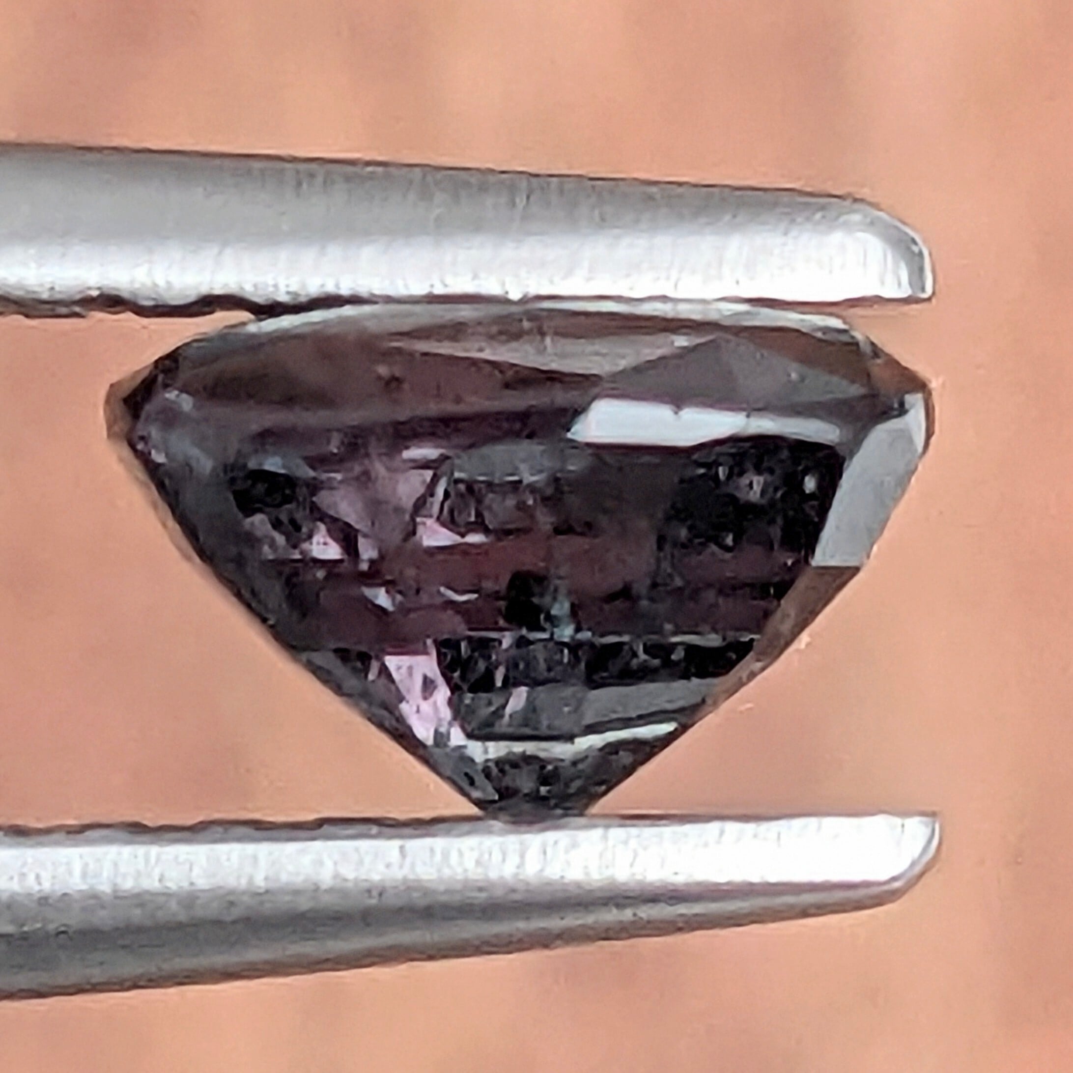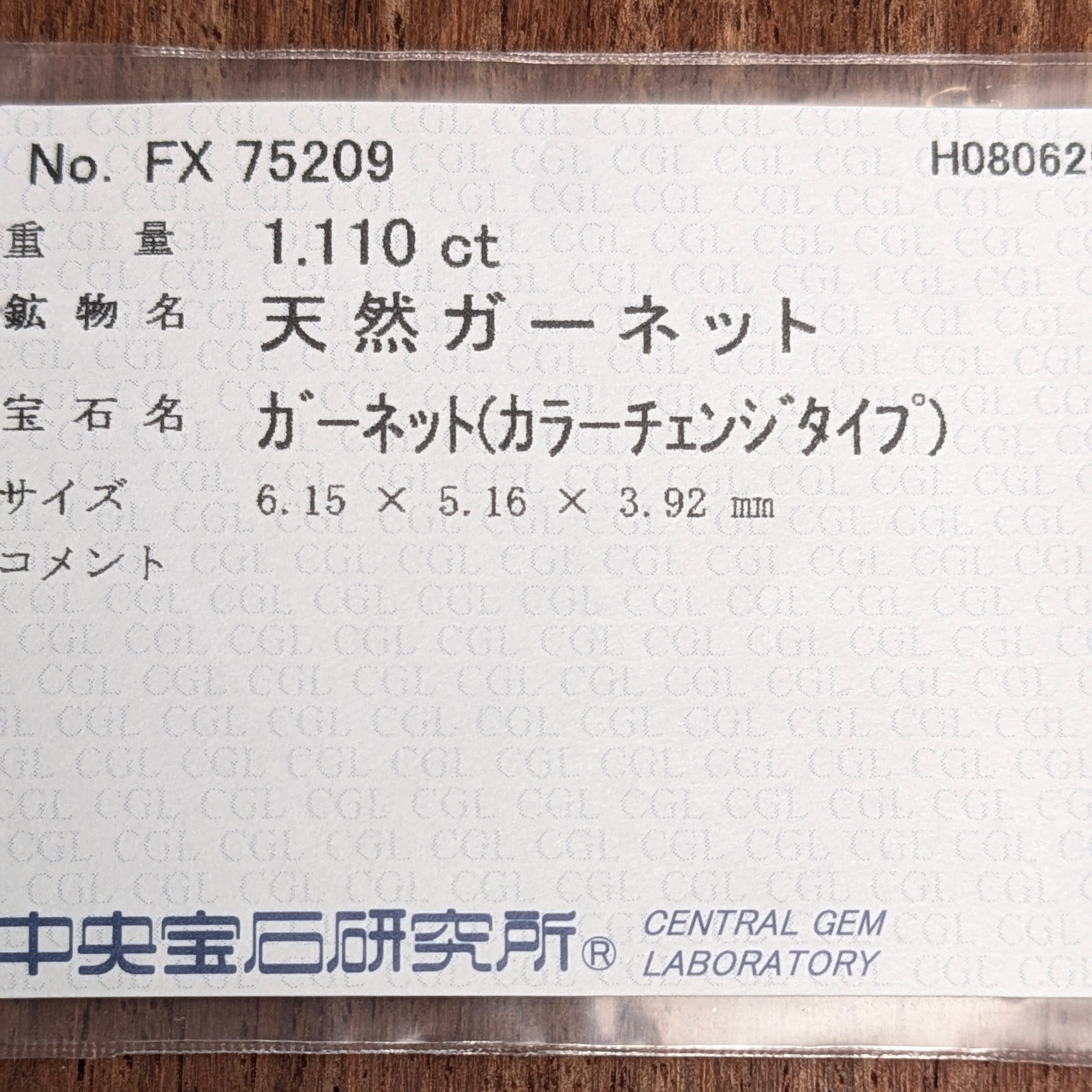なかなかうまく光を捉えられていなくて申し訳ないのですが、光源によってその色を変える「カラーチェンジ・タイプ」のガーネットです。通常光下では複雑に混ざり合った暗い色をしていますが、蛍光灯下で“ブルー味を帯びたグリーン”、白熱光下で“パープル”に鮮やかにその姿を変化させる1ピース。現代のLEDの下だと、この二つの色が混ざり合ったような複雑な輝きを放ちます。純粋な光に当たった時にだけ、二面の真の姿を現すとてもデリケートな美しさです。