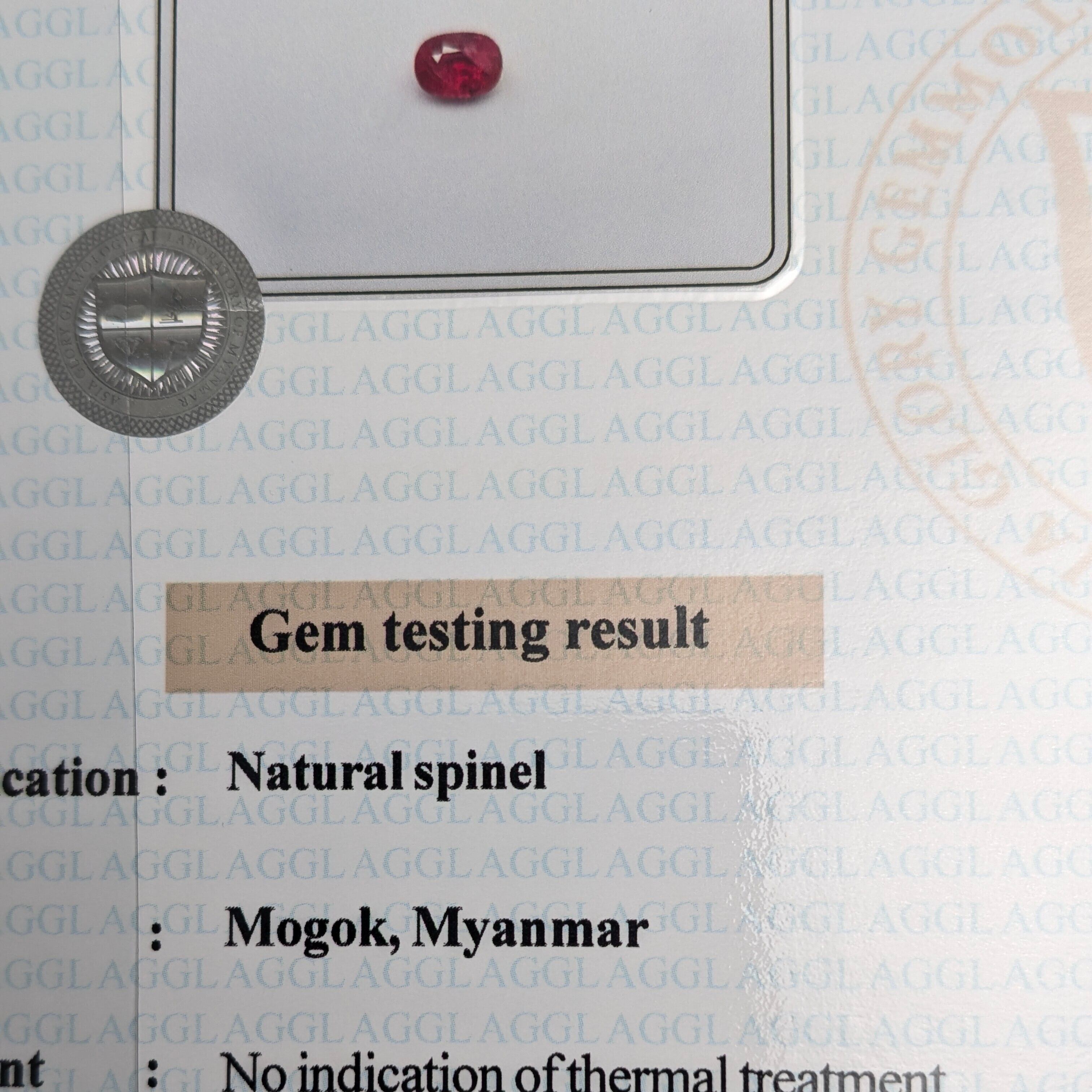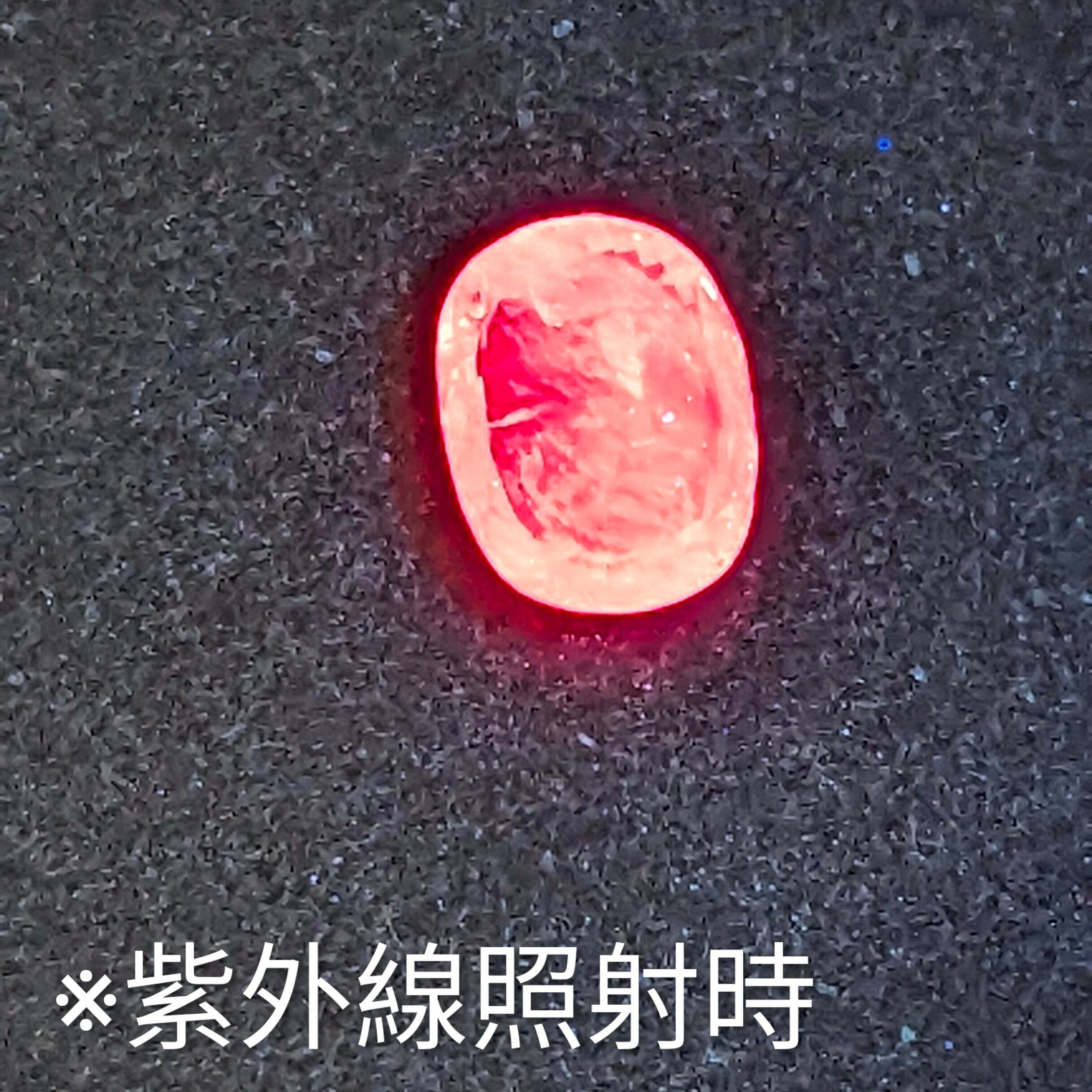 なかなか画像で捉えにくいのですが、そこはかとなく“発光感”を感じるレッドスピネル。インクルージョンは多めですが、それがかえって石の内部で光を乱反射させて“内部に電灯が灯っているように”見えているのかもしれません。赤色の紫外線蛍光も強めではありますが、光に当たっていなくてもボワッと美しい赤色が発光しているように見えます。この石に関しては、何にしてもとにかく「色が美しい」。是非、あなたの目でお確かめいただきたい1ピースです。