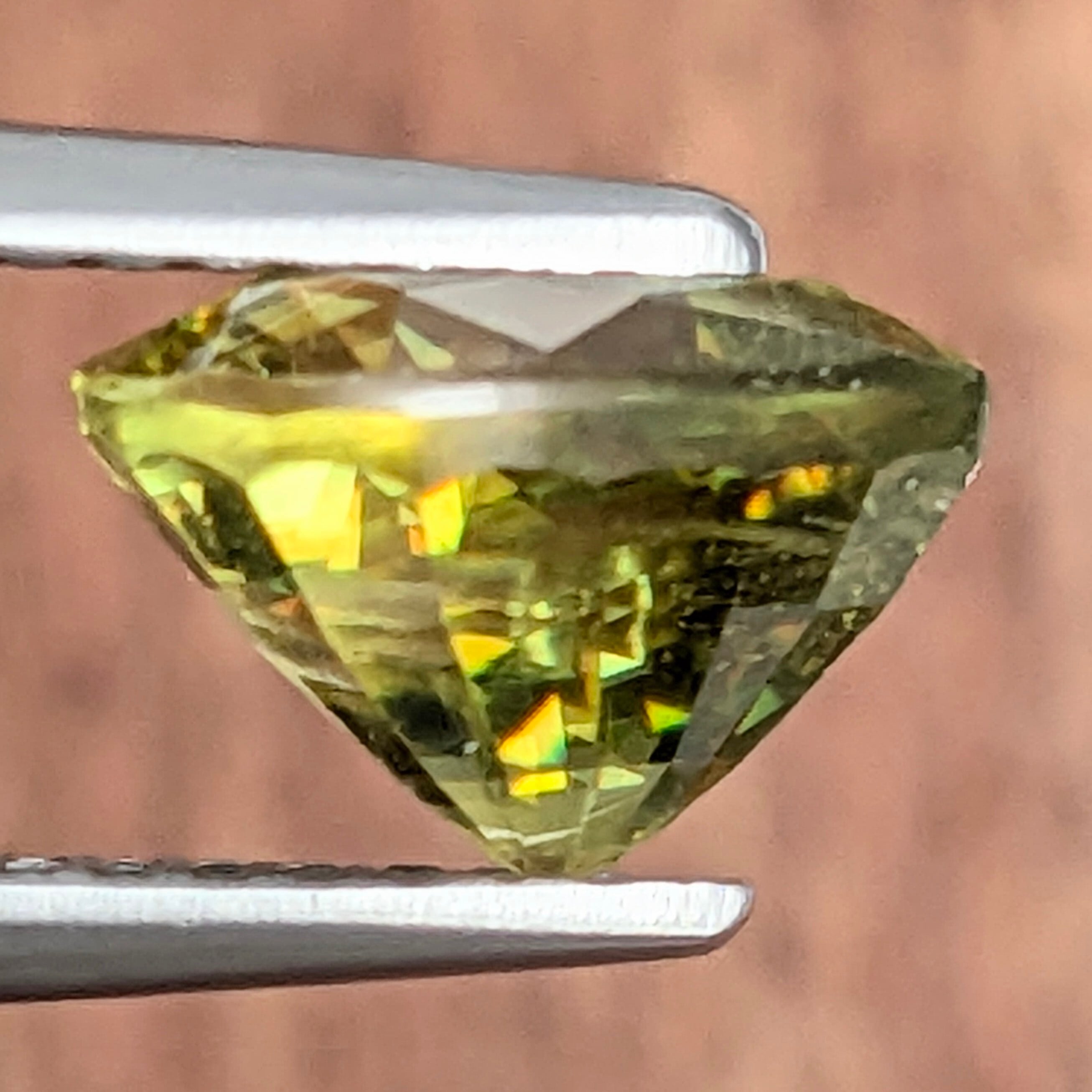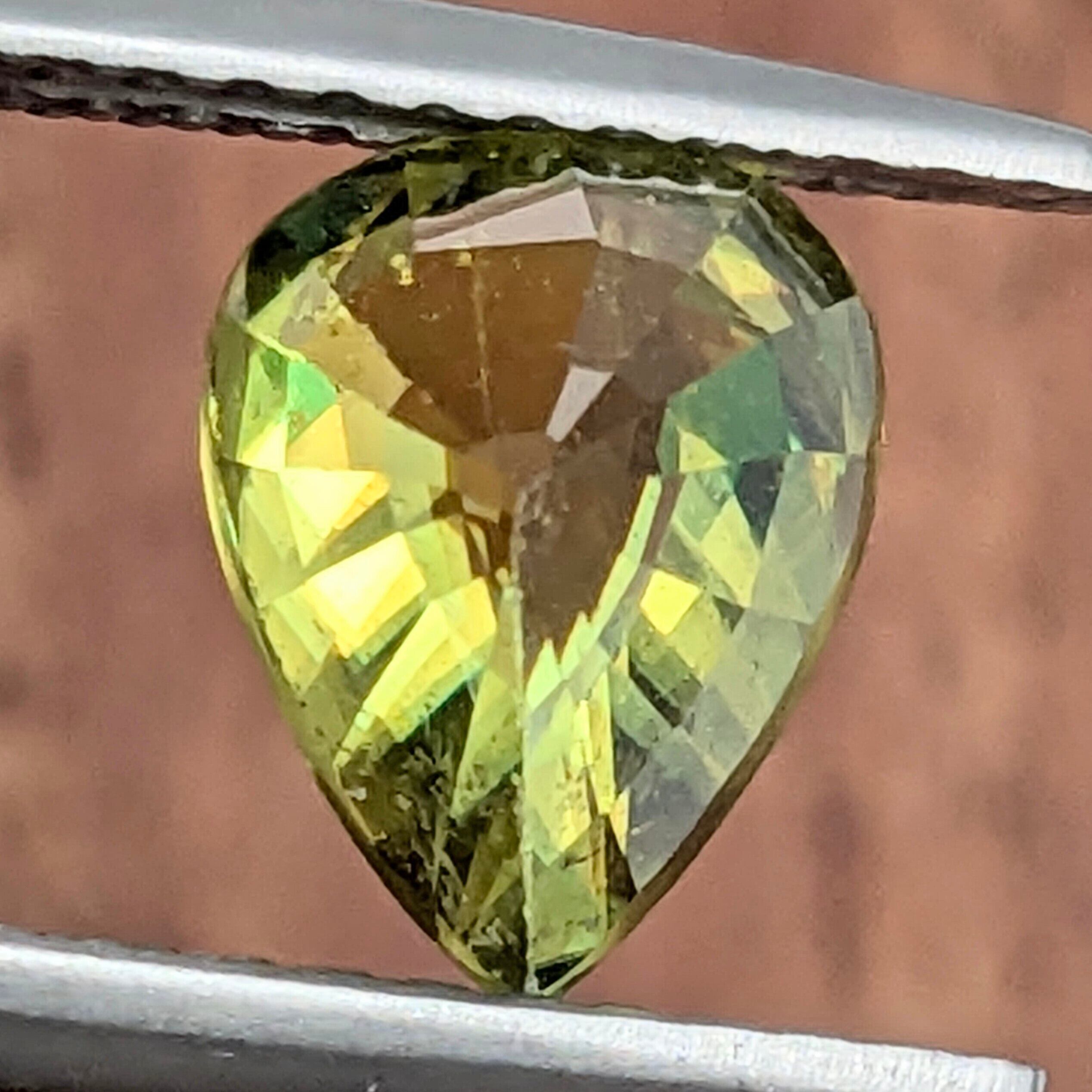 グリーンを基調として、非常に虹色のファイアが強く出ている美しい1ピースです。厚さが厚めにカットされていることで、正面からもサイドからも虹の7色がスパークしているように鮮やかに楽しむことができます。その輝く様は、まるで大自然の中で光の妖精たちが思い思いに飛び回って遊んでいるように眩しい情景。ただクリアなだけではなく、しっかりとインクルージョンも抱いていながら輝きが強い稀有な宝石。天然である特徴も一緒に、ご堪能ください。