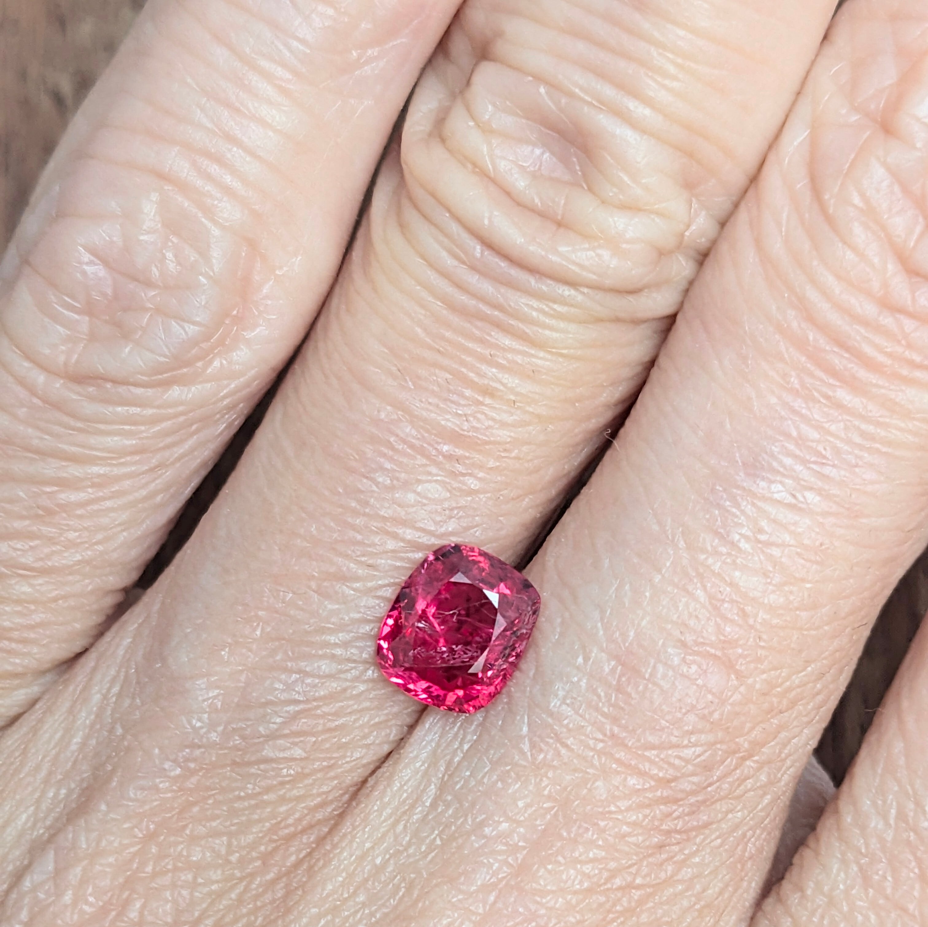 目を見張るほど、とても美しいピンキッシュレッドのスピネルです。インクルージョンはそこそこ入っていますが、それを補って余りあるほどの鮮やかな輝きと煌めき!ラズベリーを思わせる瑞々しい色合いに、ついウットリとしてしまいます。この赤色の原因は、ルビーと同じ「Cr(クロム)」がわずかに含まれていることによって生じます。ルビーと違う点は、単屈折性のため「どの方向から見ても安定した色」という点。粒が大きくなればなるほど、その意味の大きさに気づかされます。