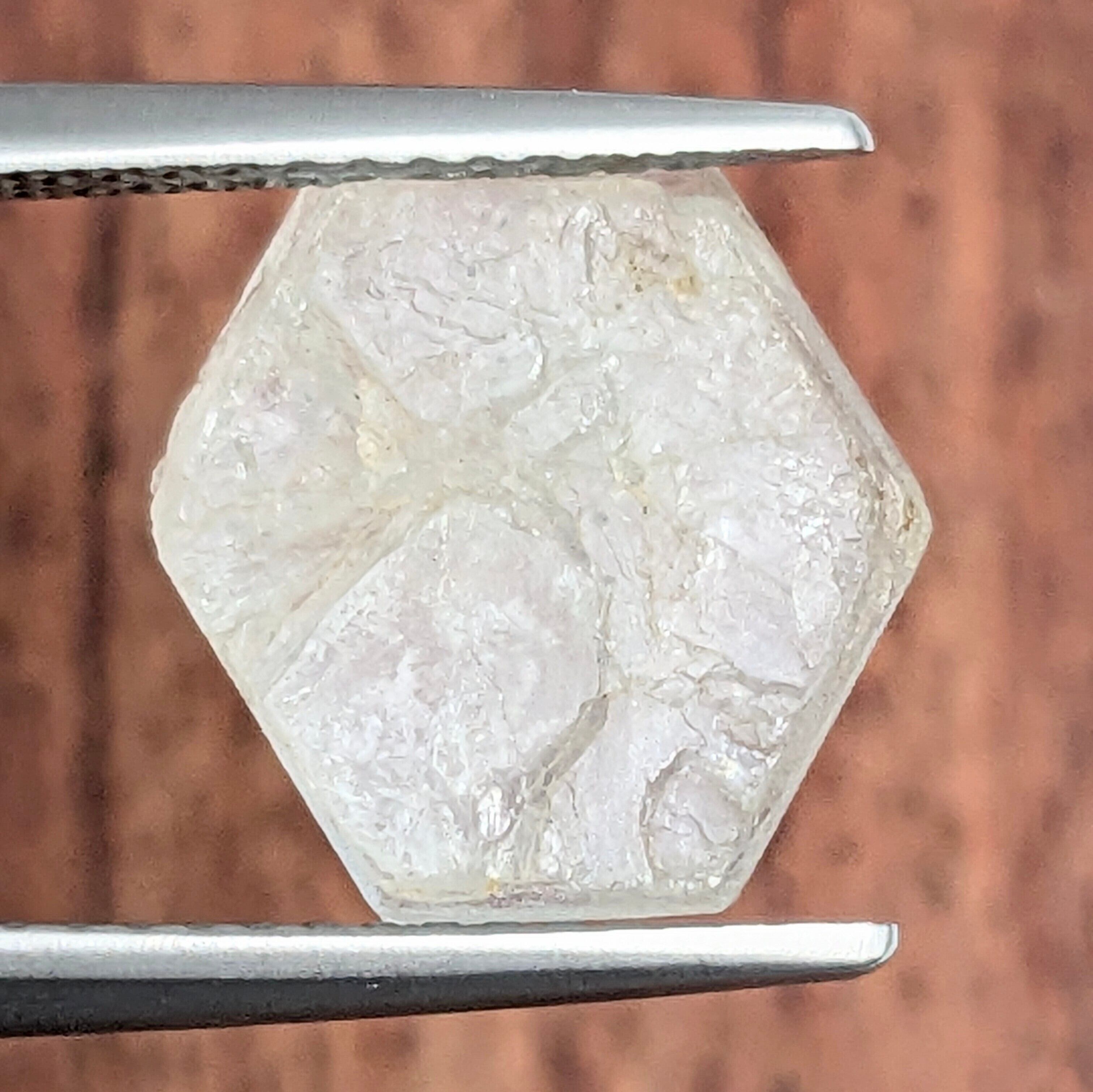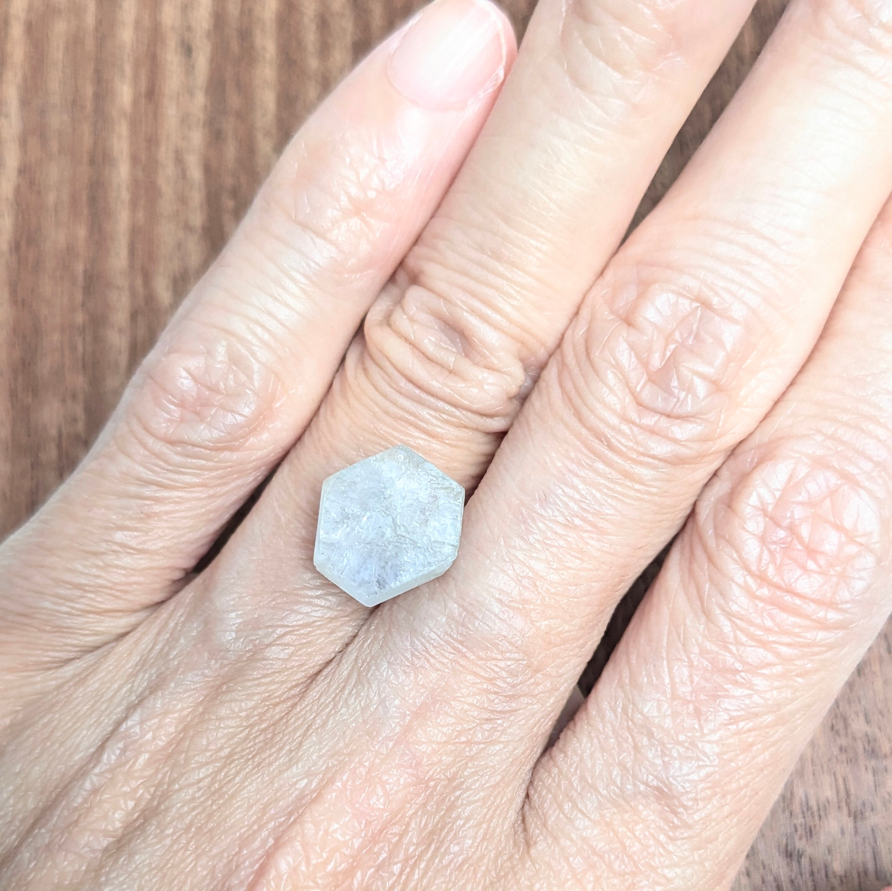 まるで、過去を振り返る魔法の窓ガラスのような、美しいすりガラス状のサファイアの原石。原石とはいえ、ご覧の通り透明感も感じられます。表面の光沢はガラスよりも強い“亜金剛光沢”で、そこはかとなく金属質にも感じられる強い“テリ”が特徴的です。断面は美しい六角形、短いですが柱面にあたる高さの部分は蝕像(しょくぞう)を伴い、「コランダム」という鉱物の特徴をよく持っています。純粋なコランダムは、この様な無色。何にも侵されていない、純粋な美しさです。