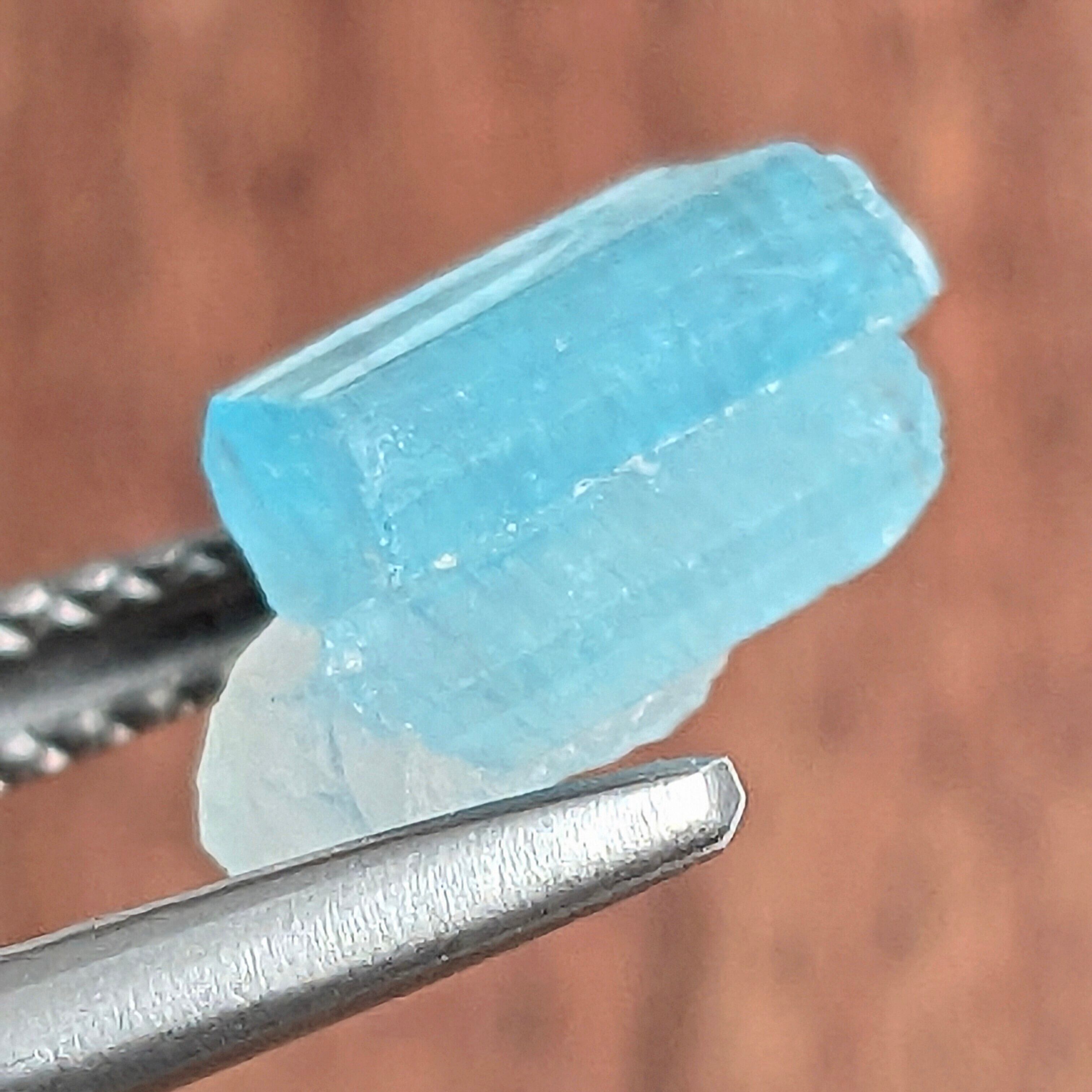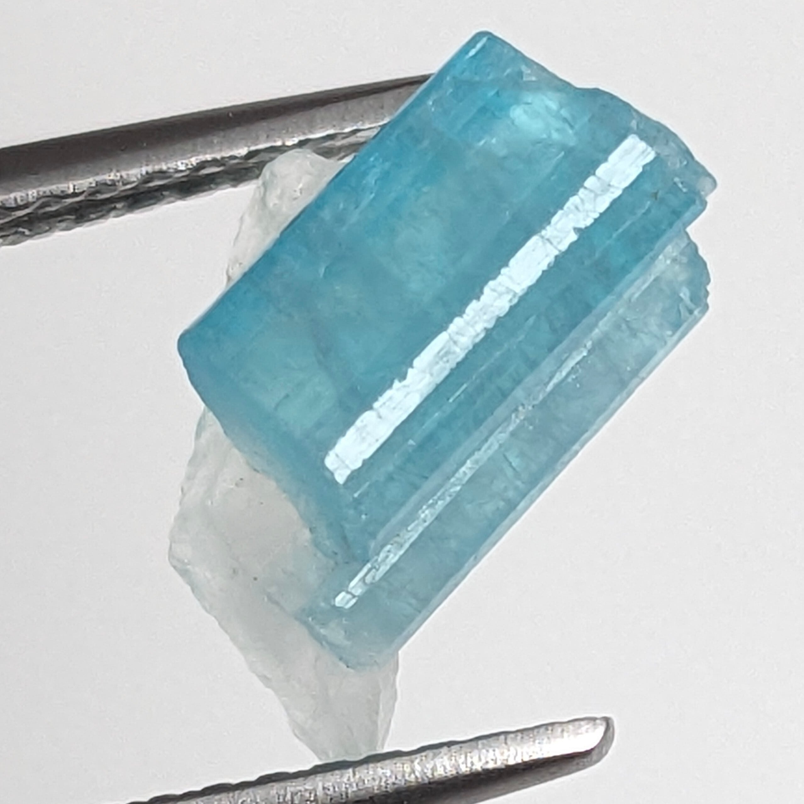 見事なネオンブルーの柱状結晶を保った、パライバトルマリンの原石です。よくよく見ると、太い結晶と細めの結晶の連晶になっていることが分かります。トルマリンの原石表面の特徴は、柱面に平行な縦線があることですが、今回の原石は比較的表面がスムーズで、艶感もたっぷり楽しめます。そして、何よりもこのネオンブルーと半透明の石英とのコントラストの美しさ・・・!肉眼で結晶の形を十分に楽しめるサイズがあります。コレクターには見逃せない一品です☆