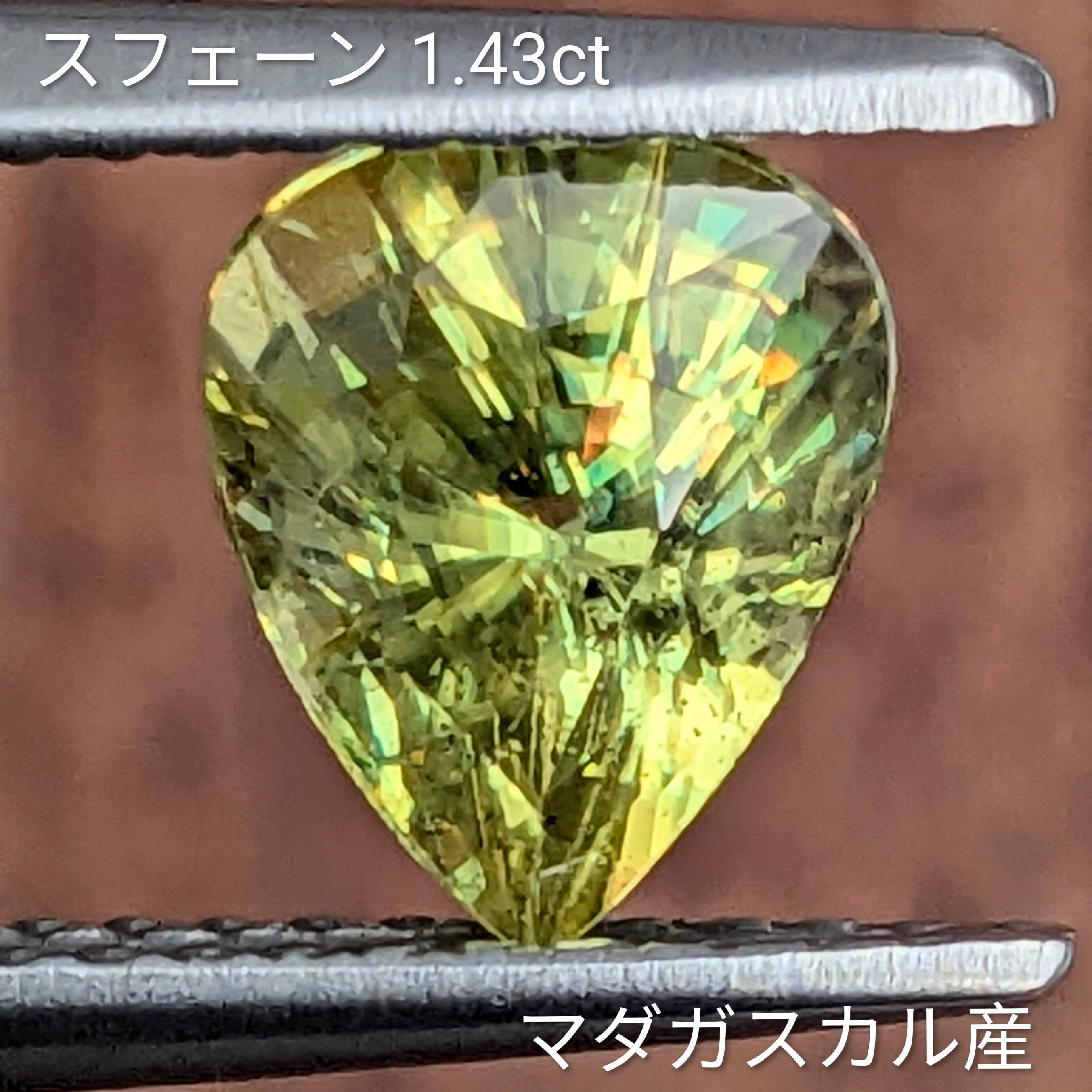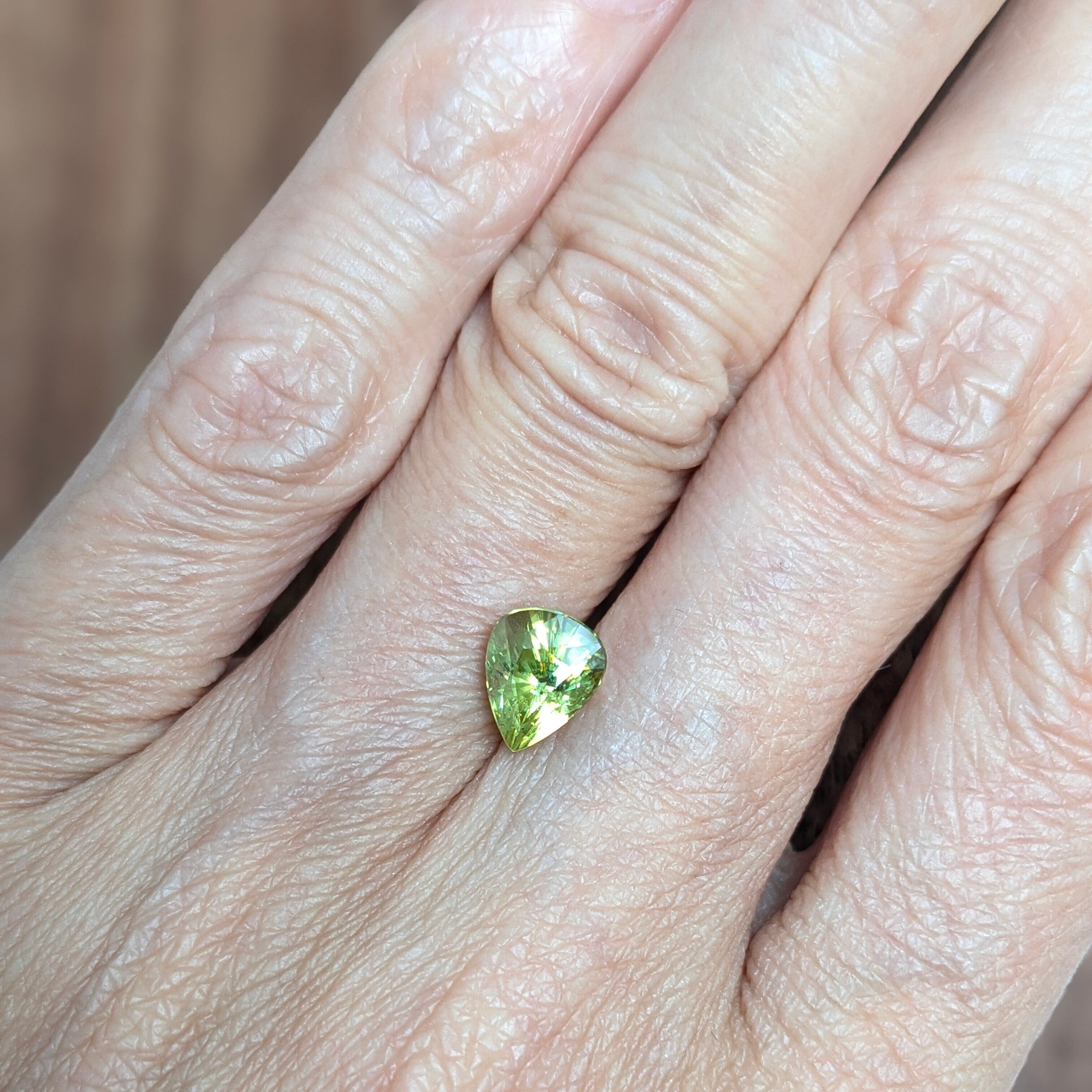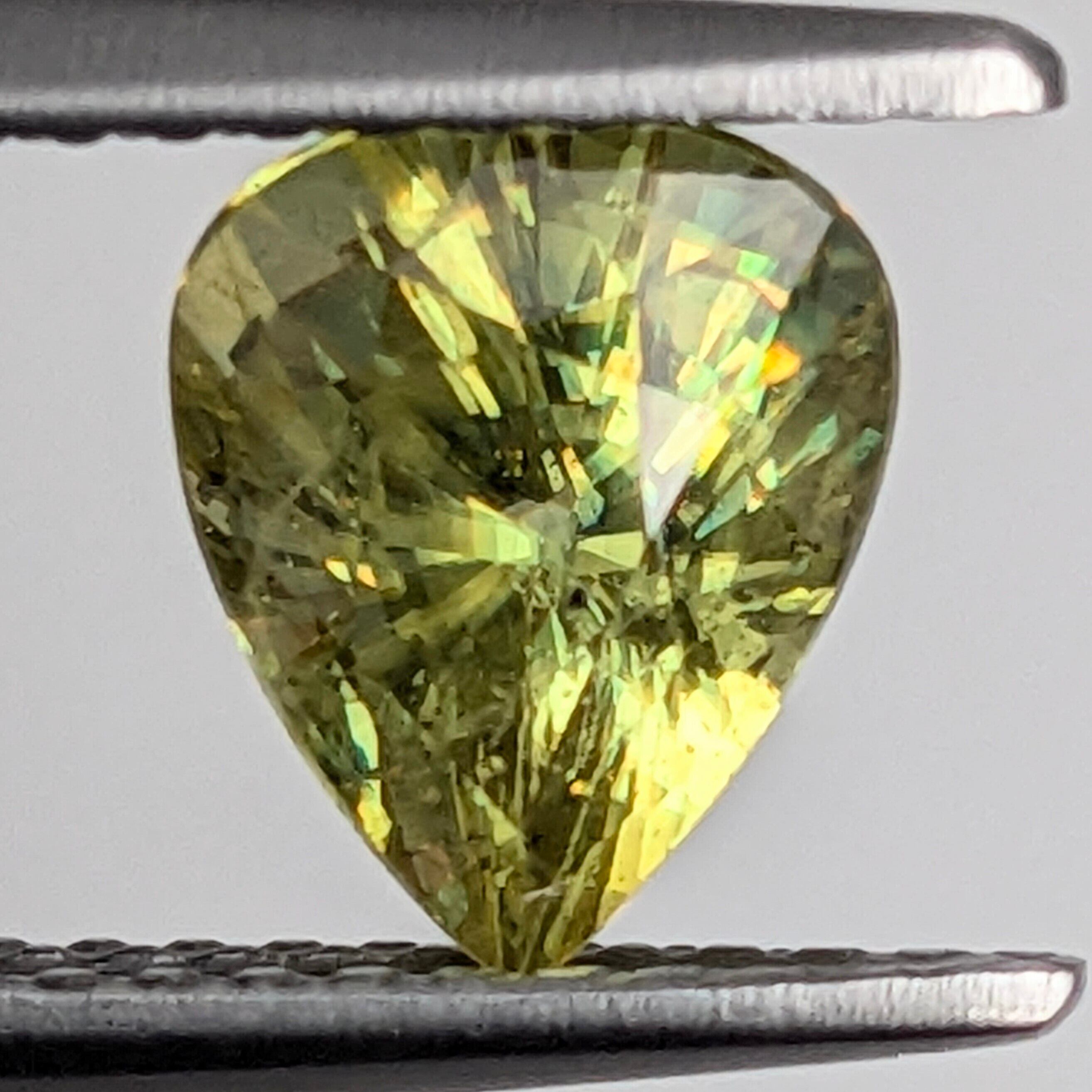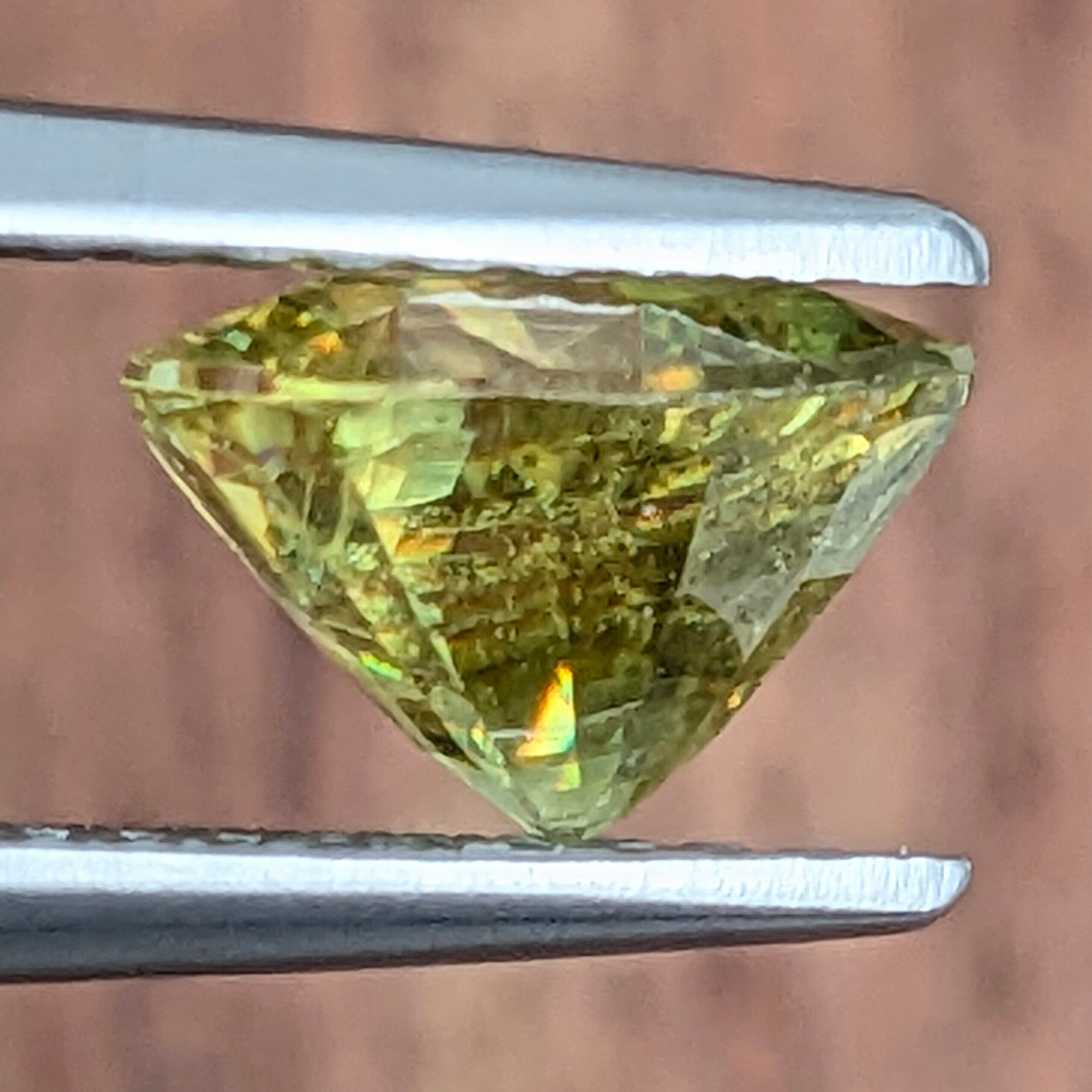 写真も動画も滲んでいるように見えますが、これこそがこの「スフェーン」の最大の特徴!石の内部に入った白色光が2方向に分かれて進むために、このように向こう側が“二重に”見えます。なおかつ、白色光がそれぞれの色成分の光に分かれることで、空にかかる虹の七色が宝石の内部で、まるでスパークしたように煌めきます。今回は地色が鮮やかな黄緑色。眩しい初夏の日差しのような、ウキウキとした輝きがとっても美しい1ピースです。