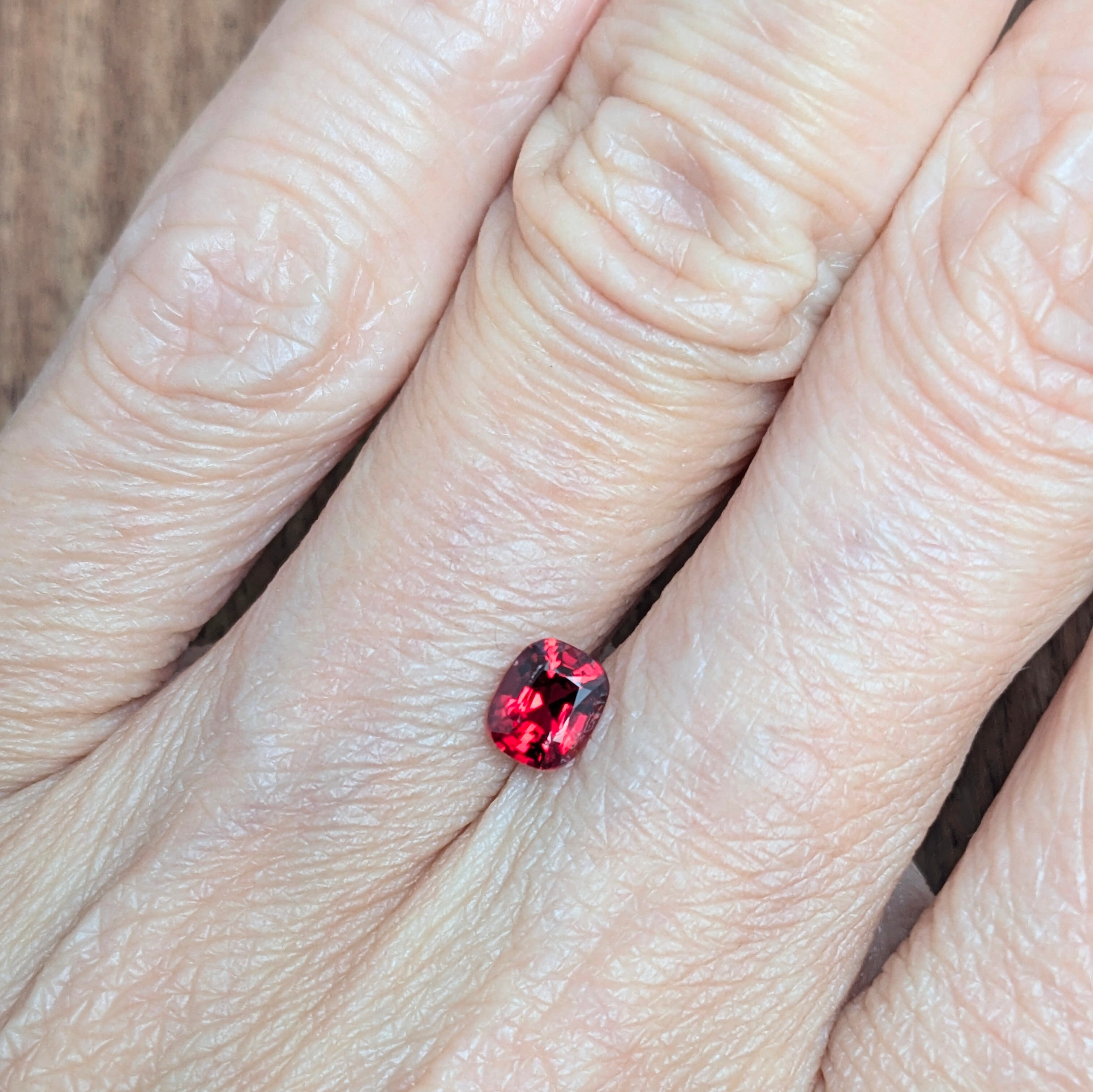 クラウン部(石の上面)にわずかに“生地足らず(原石の名残り)”がみられますが、肉眼での輝きに影響はありません。純粋で鮮やかな赤色に目が釘付けになる1ピース。スピネルは“硬度8”ととても硬いので、日常使いのジュエリーに適している点も嬉しいポイントです。ワンポイントにも最適なこの鮮やかな色は、ルビーと同じ「Cr(クロム)」が色の原因。赤色の鮮やかな紫外線蛍光も持つ個体なので、太陽の下で、よりその色と輝きをご堪能いただけます。