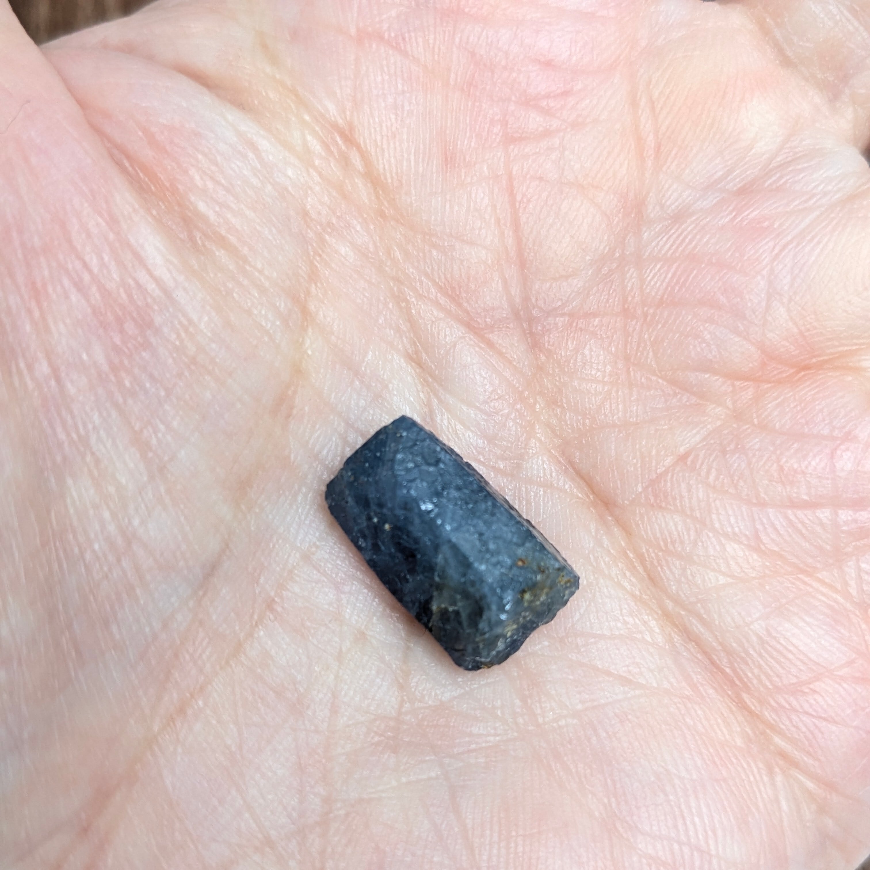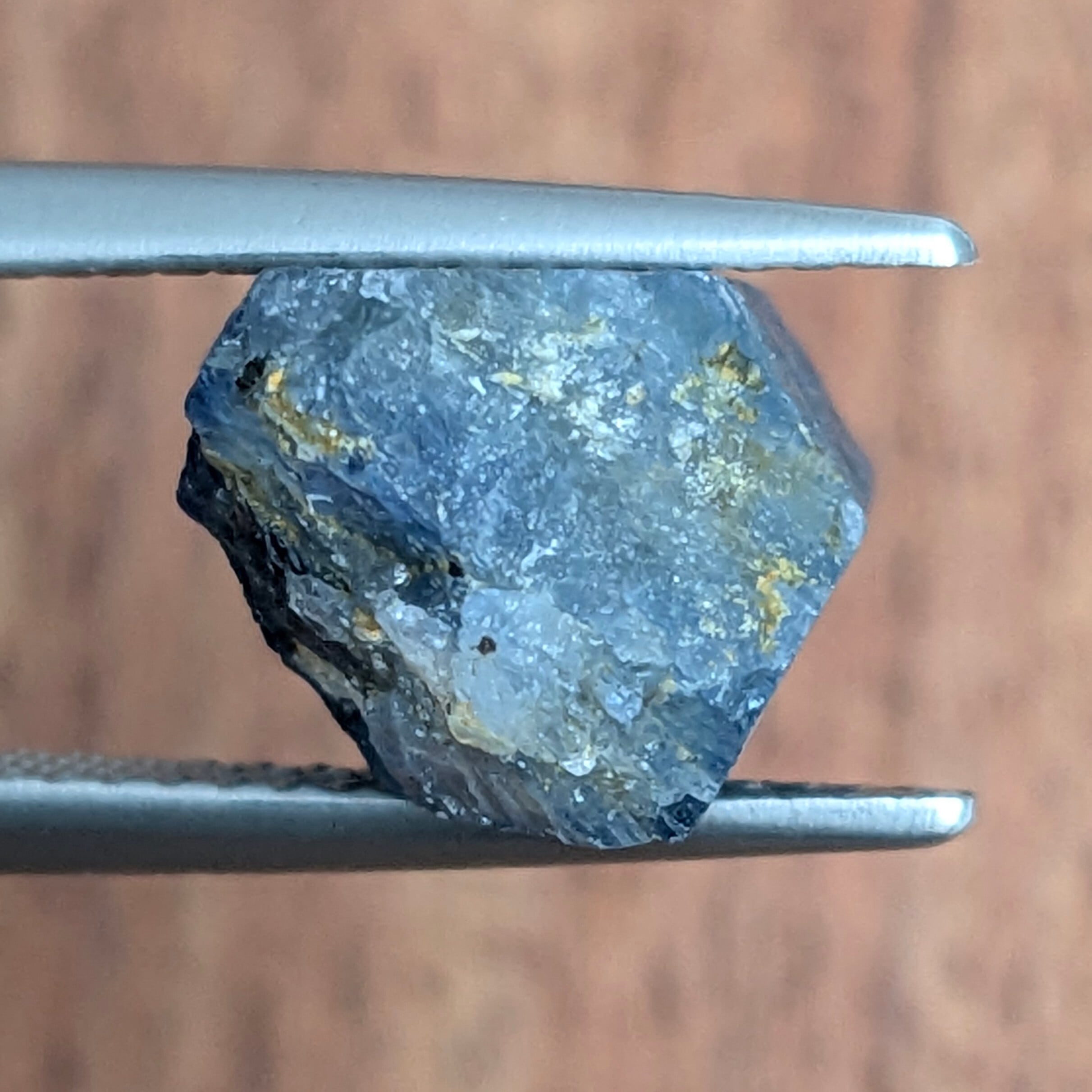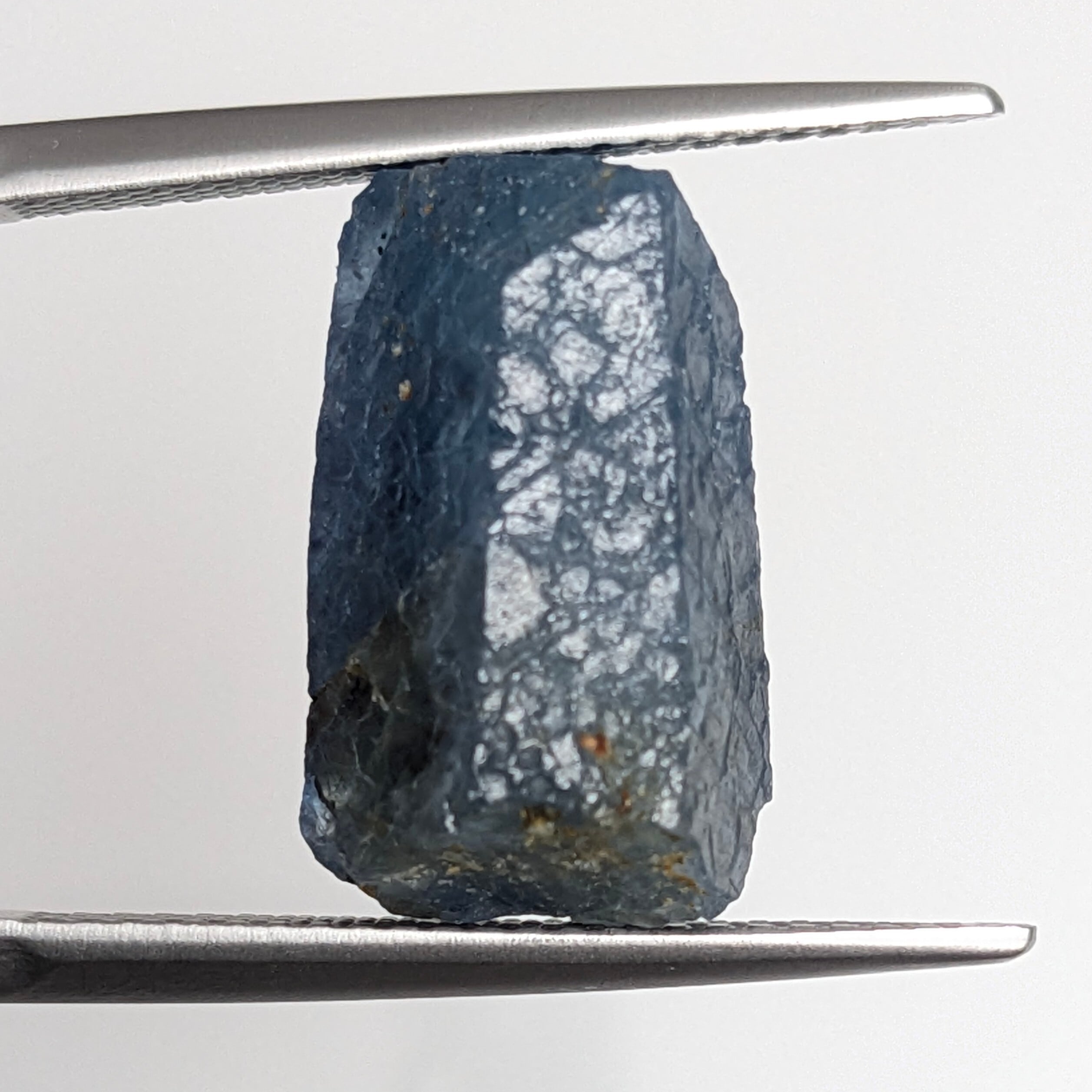 私たちの手元に来るまでの、長い旅路の跡を結晶面に残しながら、雄々しくギラギラと照り返す一粒。かなり大きめのサファイアの原石です。肉眼ではグレー味が強く感じられますが、ひとたびペンライトなどの強い光をあてると、潜在的に持っている美しい青色とそこはかとない透明感がその姿を現します。断面には、コランダムに代表的な“トライゴン”と呼ばれる三角形の表面模様が・・・。十分な大きさがあるので、原石のままで楽しめそうな一品です。