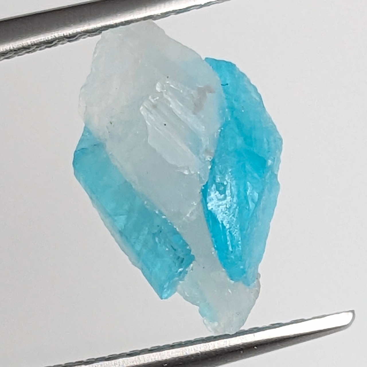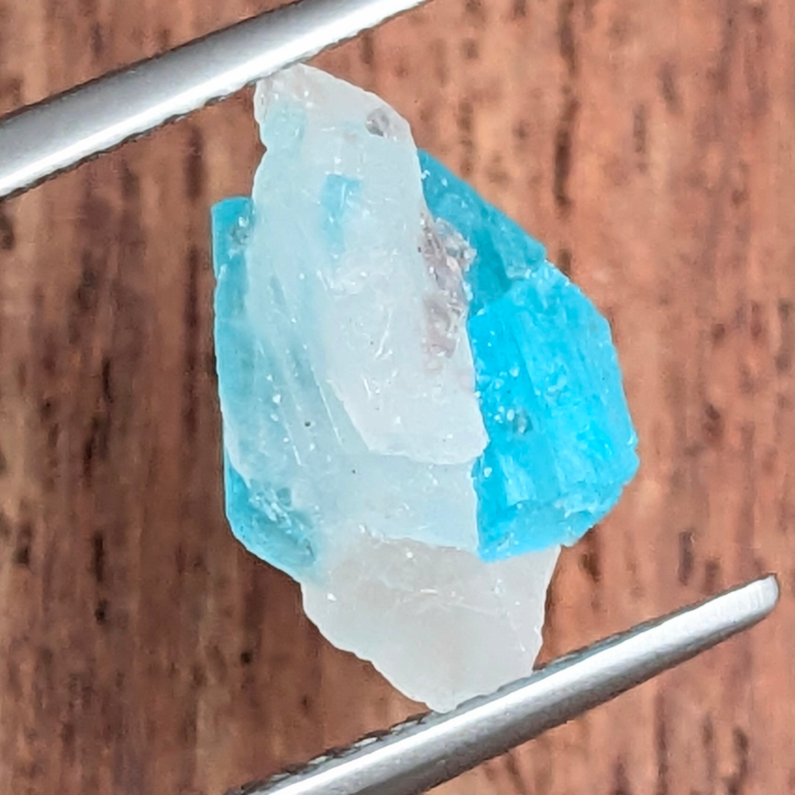 「夫婦宝石」・・・と呼びたくなるほど、そっと寄り添った大小のパライバトルマリンの原石が愛おしく感じる一粒。くっつきそうでくっついていない2つのトルマリンは、会えそうでなかなか会えない織姫と彦星を思わせるような、奥ゆかしい輝きを放っています。10倍のルーペで拡大してみると、半透明の石英部分との接合面がパズルのようで、元素がこのように分かれてそれぞれの鉱物を形作っている“奇跡”のようなものを感じます。とてもレアで、美しい一品です。