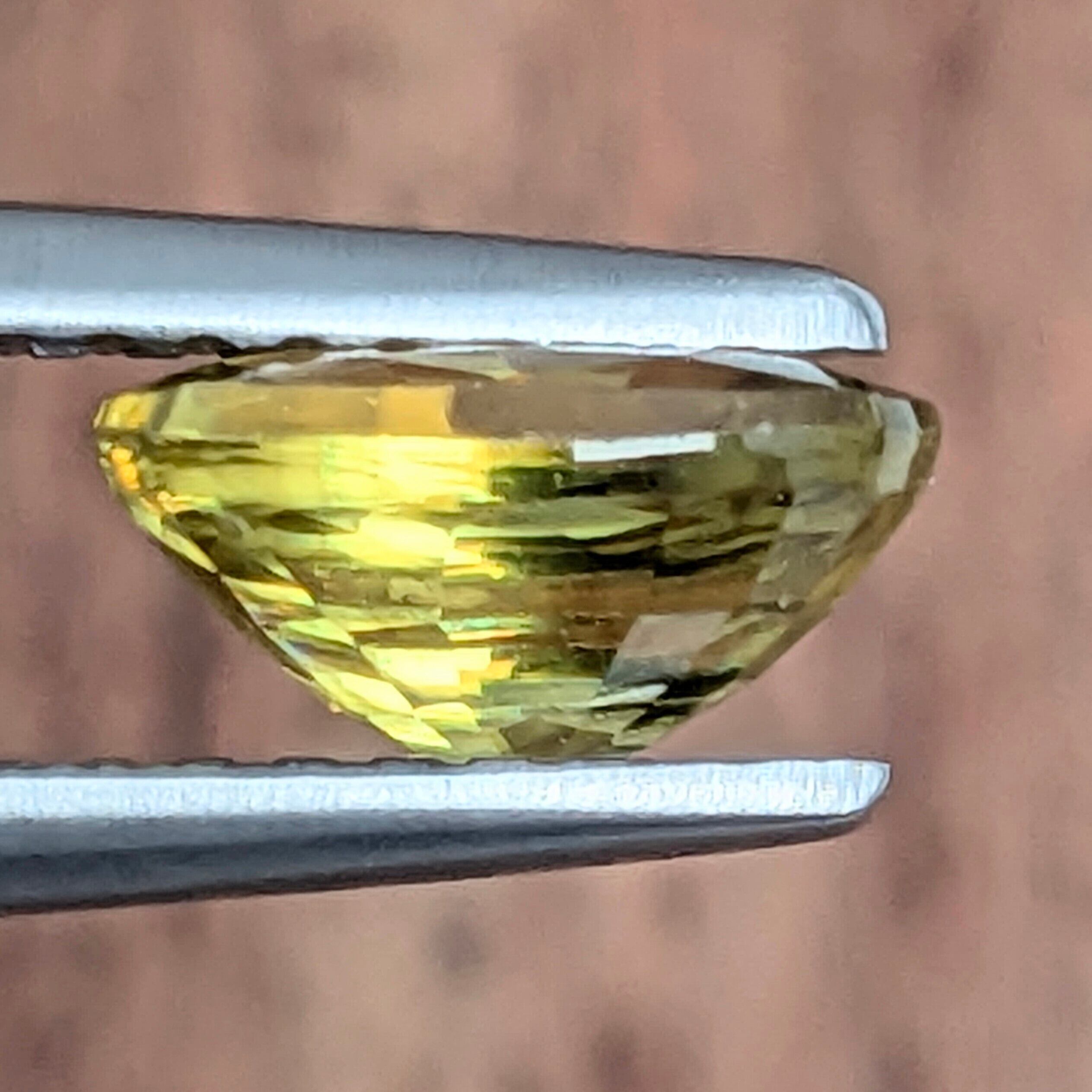 小さな楕円形のカプセルの中に、光を閉じ込めたような眩い輝きの一粒。「ここから出して!」と、光の七色の妖精たちが飛び回っているかのようです。スフェーンは地の色がイエロー系とグリーン系がよく見られますが、今回はどちらかというとイエロー味の強い子です。ちょっと面長の楕円形のその結晶の中で、限界まで自由に光が屈折して煌めきを放っています。光自体の七色の輝きと、体自体からの光の反射のテリとが合わさって、とても美しい1ピースになっています。