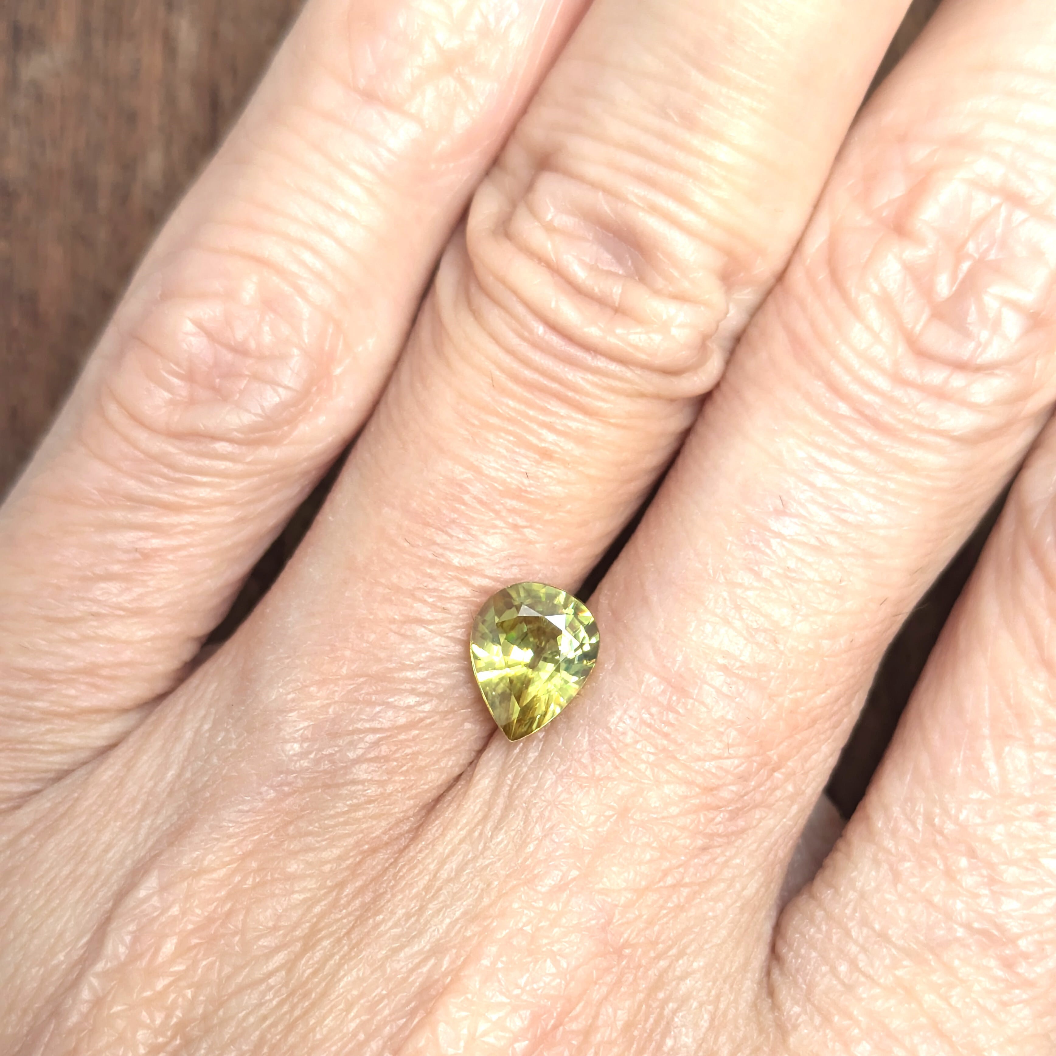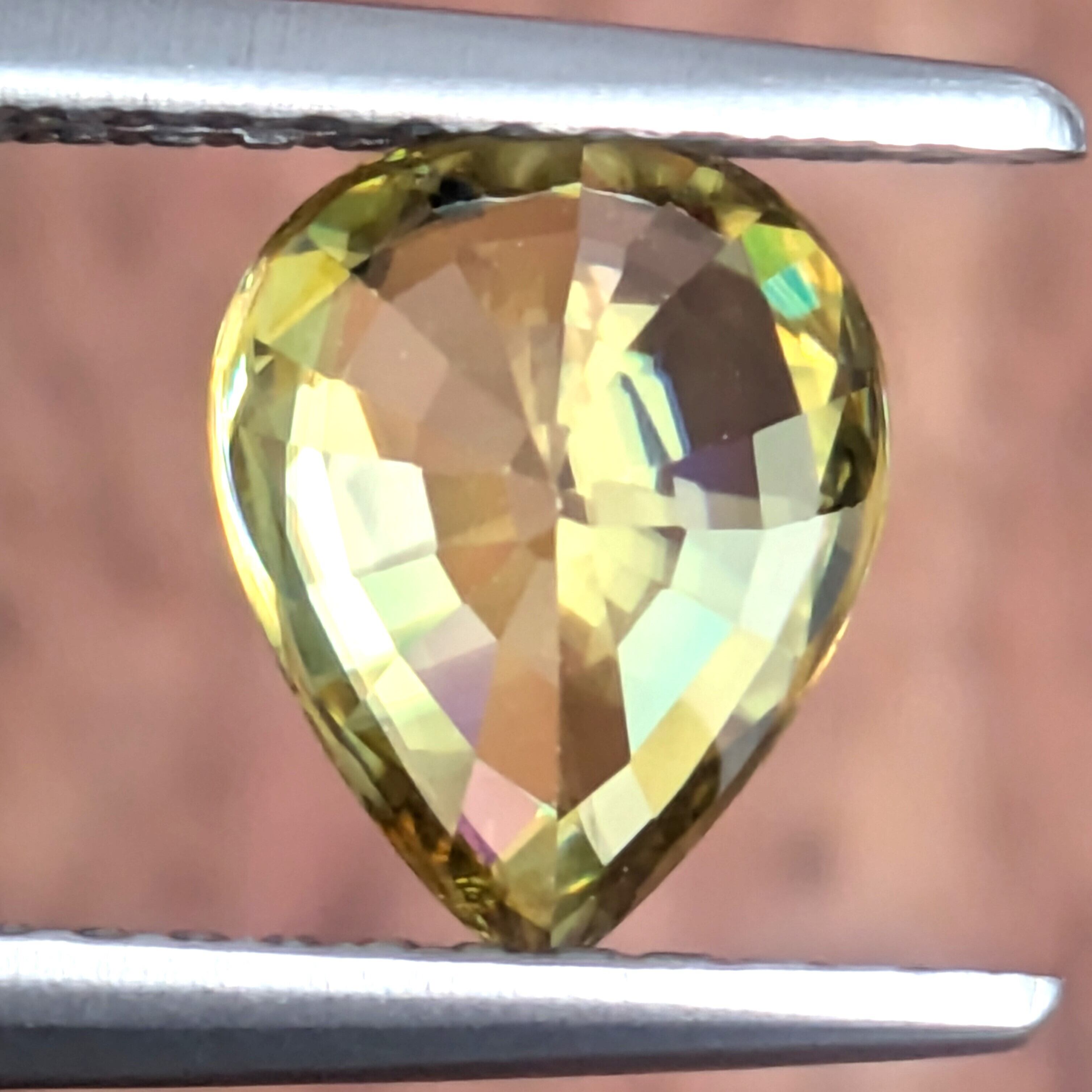折り重なり、延々と続く鏡の世界のように、何重にもファセットエッジが無限に続いているような不思議な見た目の宝石「スフェーン」。これは石の内部に入った光が2つの方向に大きく分かれて進むことで起こる“複屈折”によって引き起こされます。この“複屈折率”も強いのですが、その“一つの白色光を七つの色の成分の光”に分ける力も大きな宝石。その結果、石の内部で夢のような虹色の饗宴が繰り広げられているのです。