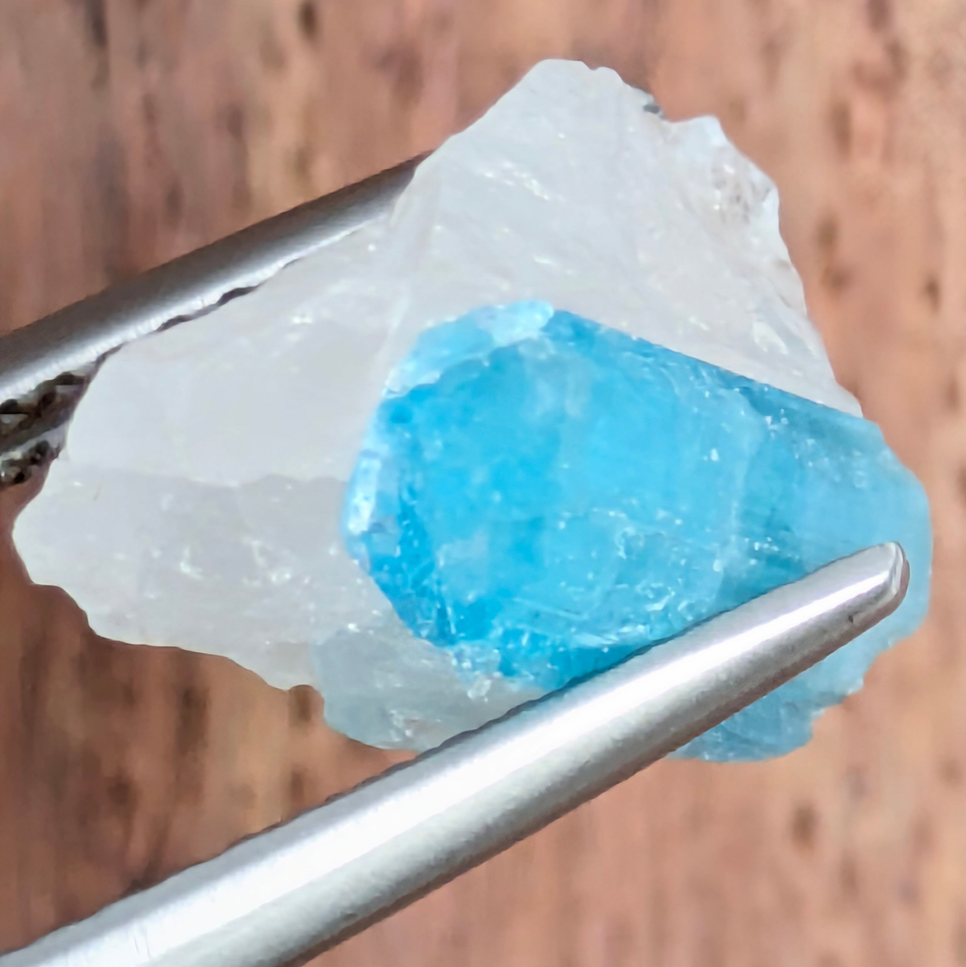 美しいネオンブルーのパライバトルマリン原石。なぜ、こんなにも美しいのにジュエリー用にカットされないのか?ここまで美しい姿を保った原石であれば、誰しもがカットしようとは思わないかもしれません。石英に美しく鎮座するその姿は、未だ成長を続け、輝きからはその鼓動が聞こえてきそうな気がします。どのくらいの時間をかけて成長し、どのような思い出を刻んでいるのか・・・想像が膨らみます。