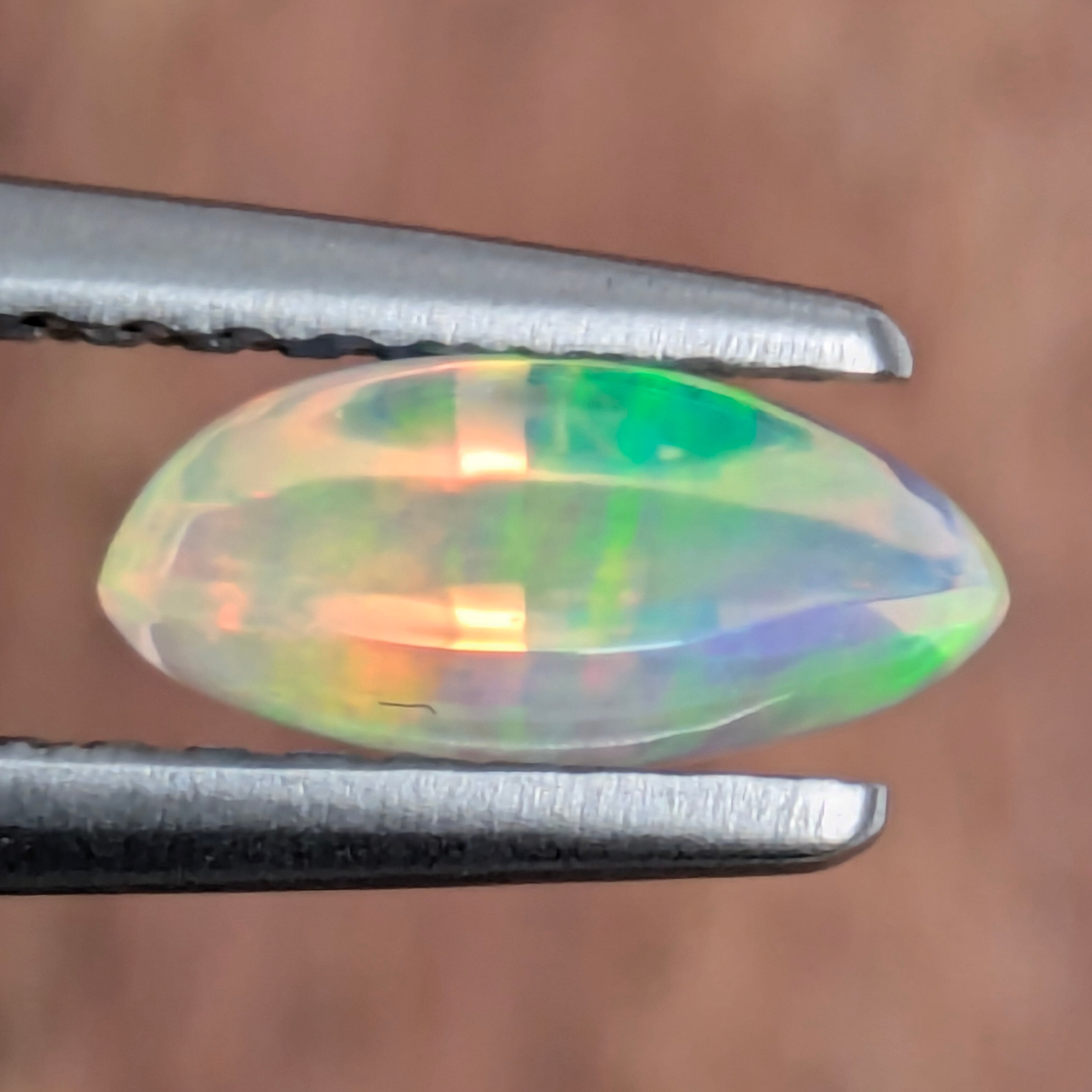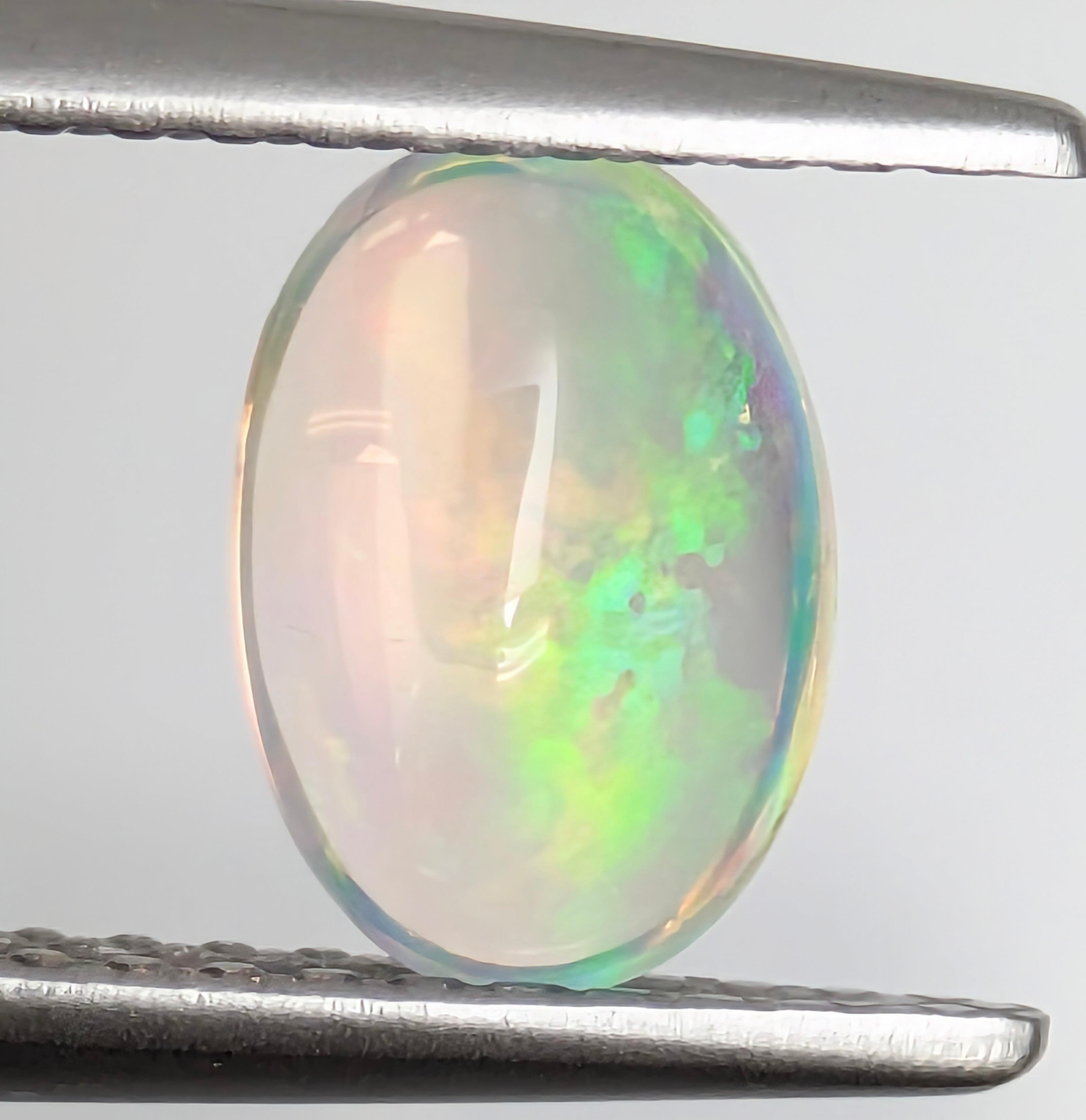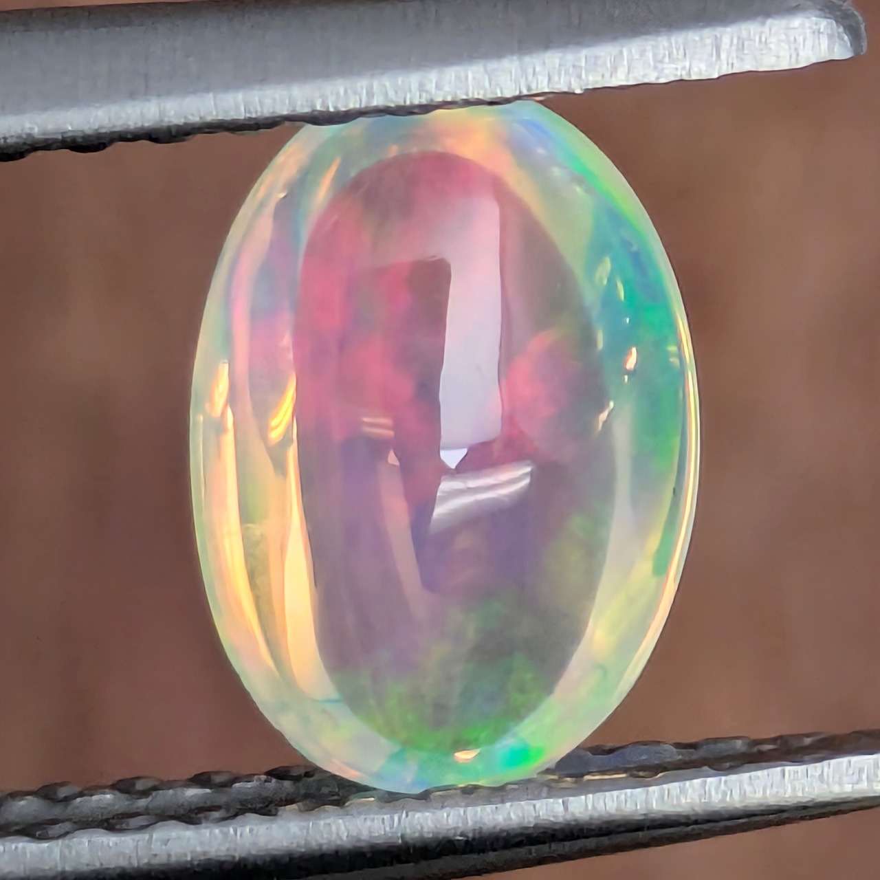 ほぼ透明な基盤の石に、嘘のように飛び交う虹色の遊色たち・・・!0.721ctと決して大きくはないですが、この艶感、遊色の鮮やかさ、透明感による存在感がとても美しい1ピース。何よりも、角度によってちょうど石の中央部に浮かび上がる印象的な赤い閃光に目を奪われます。例えるなら、子供のころに夢中になったシャボン玉の幻想的な美しさをそのまま宝石にしたよう・・・!私たちの追憶の美の結晶です。