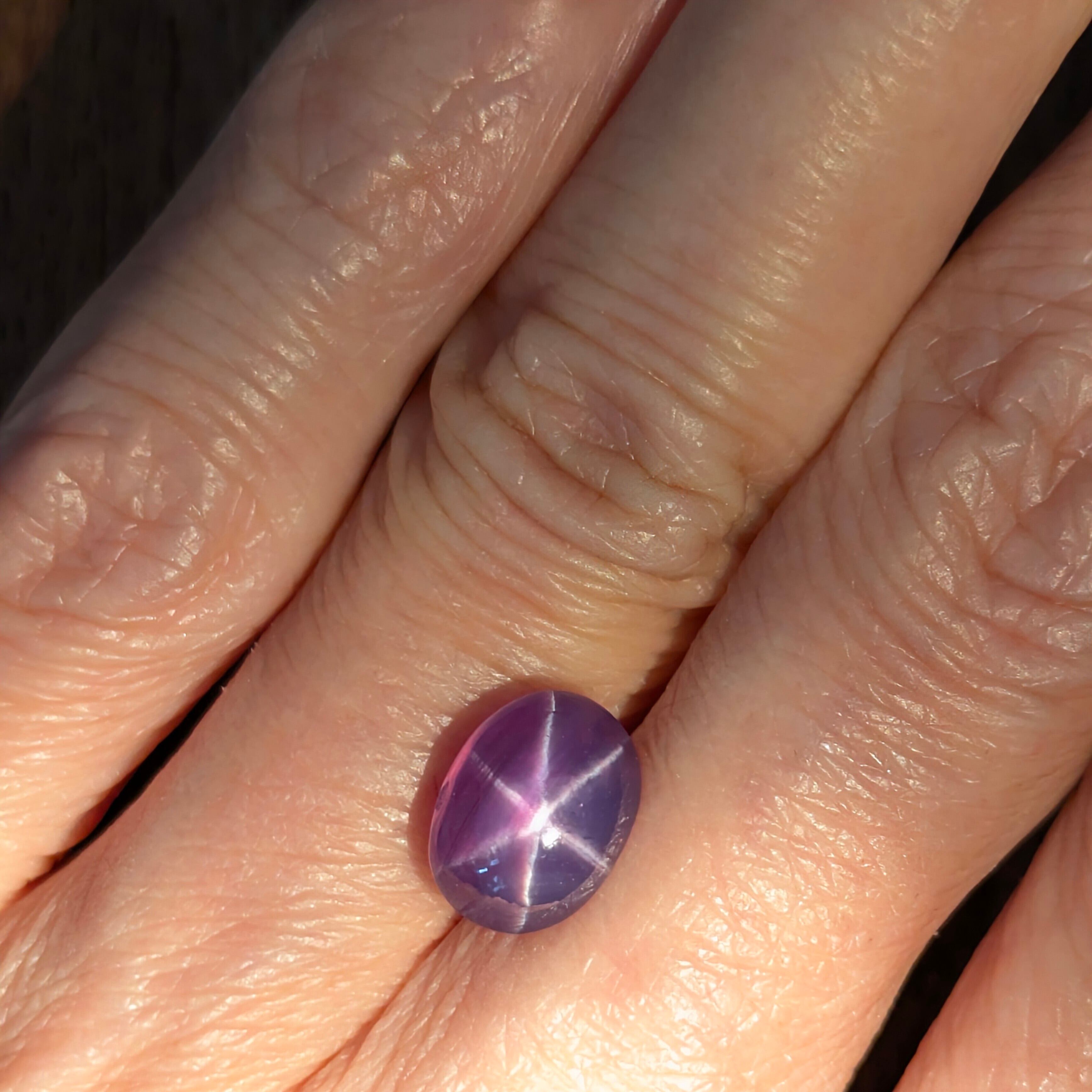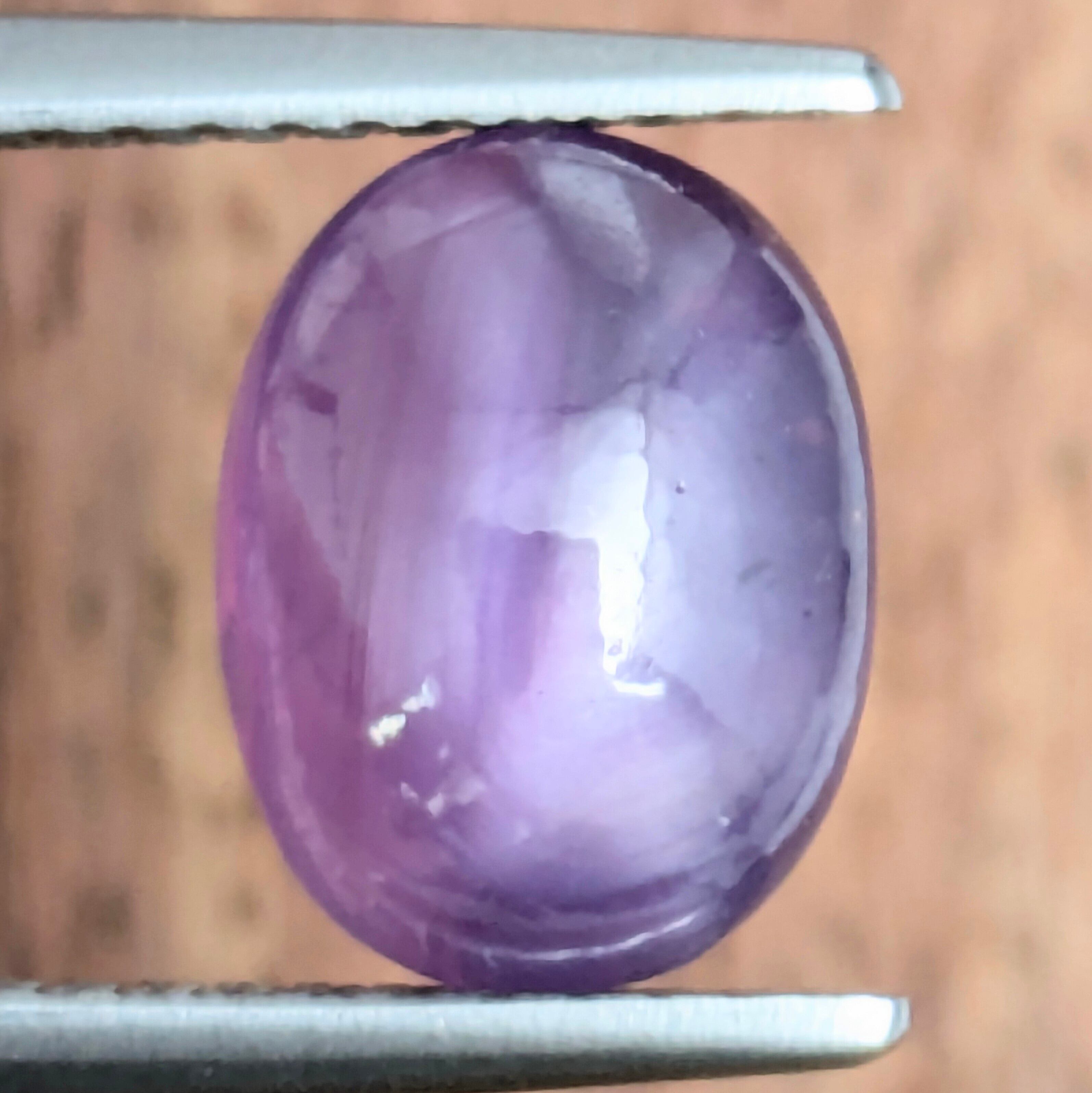 裏面は大きく“生地足らず"の部分がありますが、スターがとても美しく地色のバイオレット・カラーもとても大人っぽい魅力を持った1ピース。肝心のスターは、カボションの中央部ではなくちょっと側面寄りに出るカットになっておりますが、これこそ“いろいろな角度から表情を楽しむ”醍醐味を持った「石の個性」と言えると思います。石の表面をツルっと滑るスターの姿は、いくら見ても見飽きません。