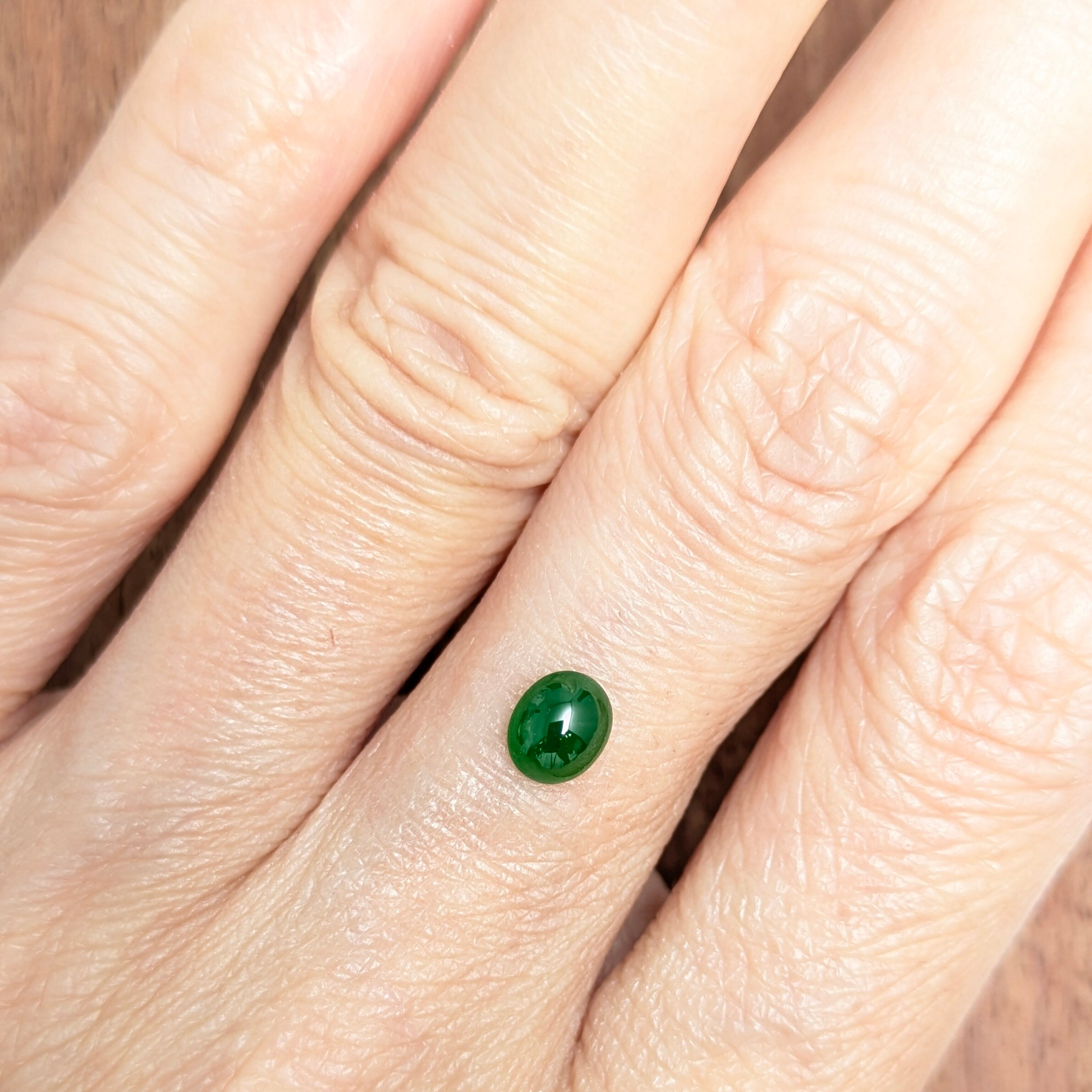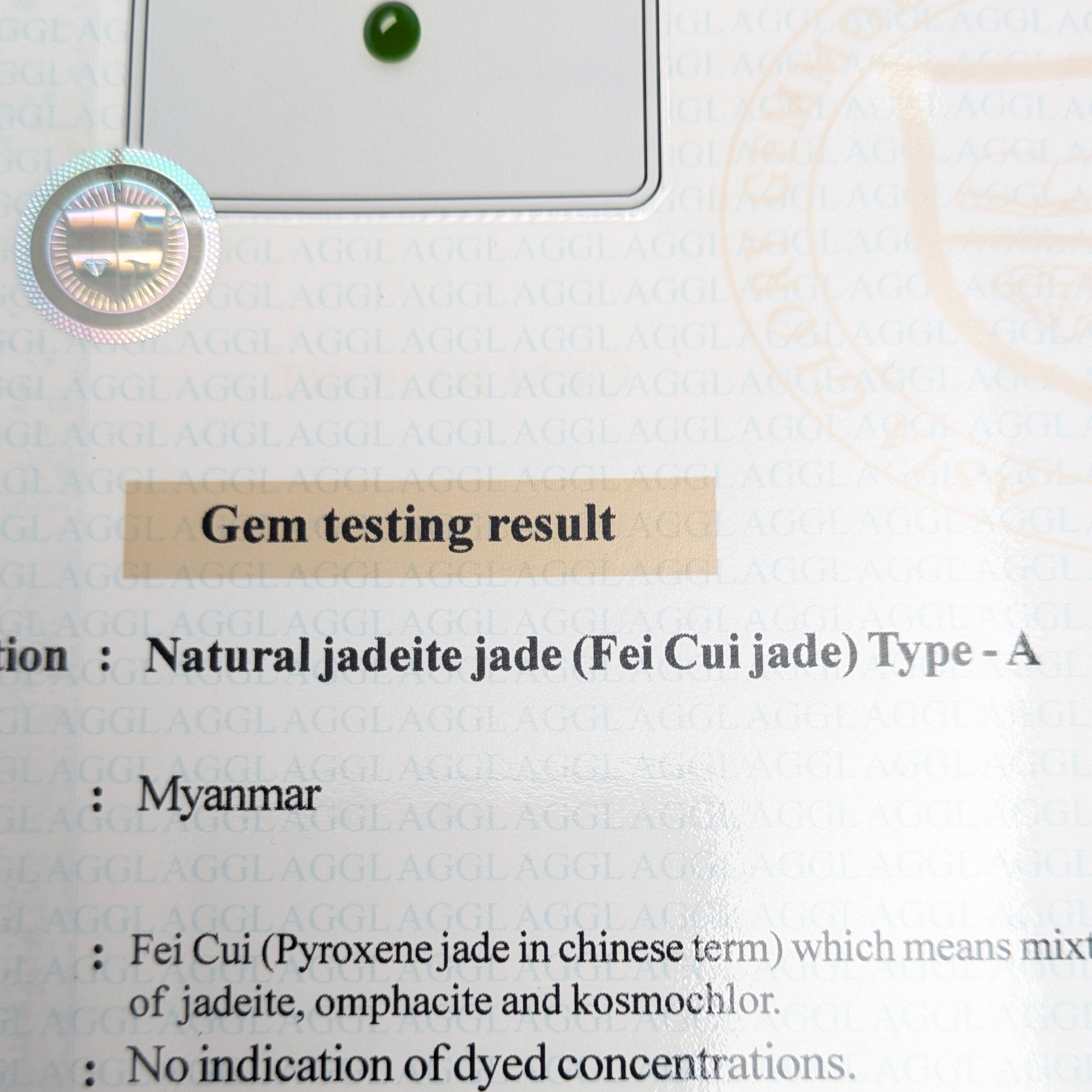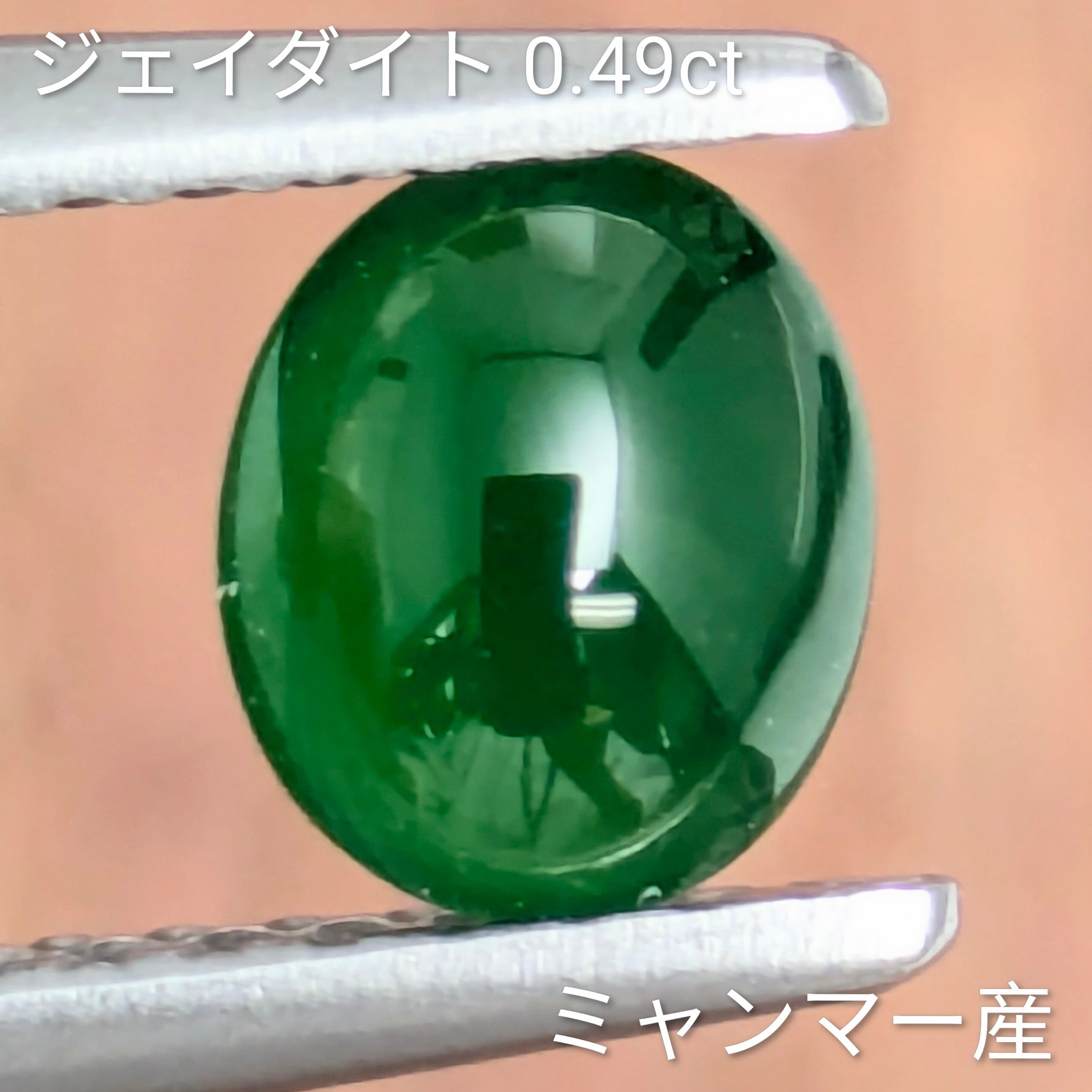 0.49ctと小粒ではありますが、色ムラもなく透明度も高い非常に美しい艶感のジェイダイトです。エメラルドやツァボライトのような鮮やかなグリーン系の宝石と同様、この印象的なグリーンは微量に含まれる「Cr(クロム)」が原因です。瑞々しく太陽を一杯に浴びて成長したオリーブの実のように、ツヤツヤぷるんぷるん!肉眼でも透明感と美しいグリーンをきちんと感じられる、美しい1ピースです。