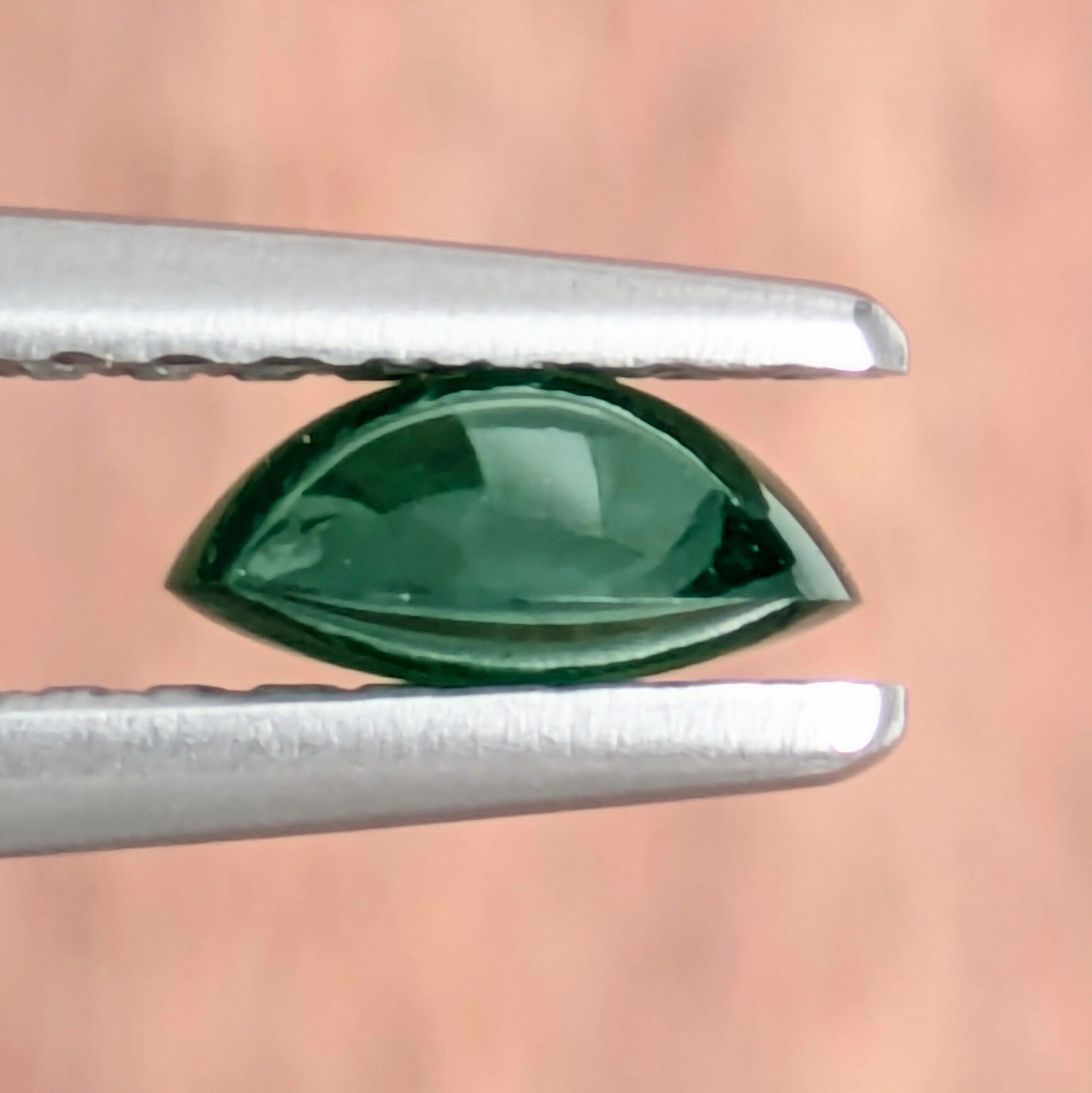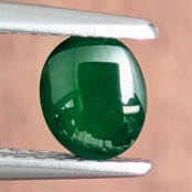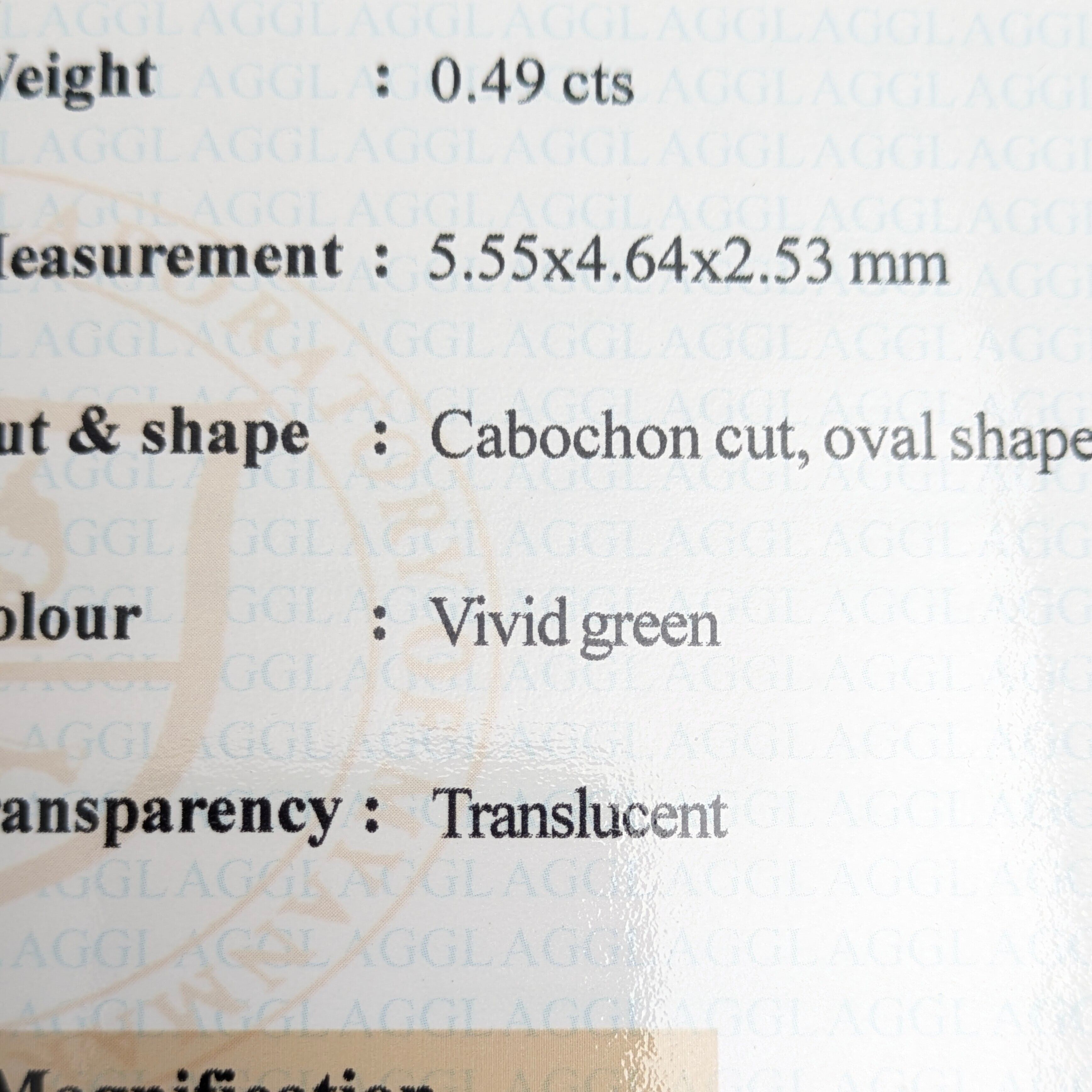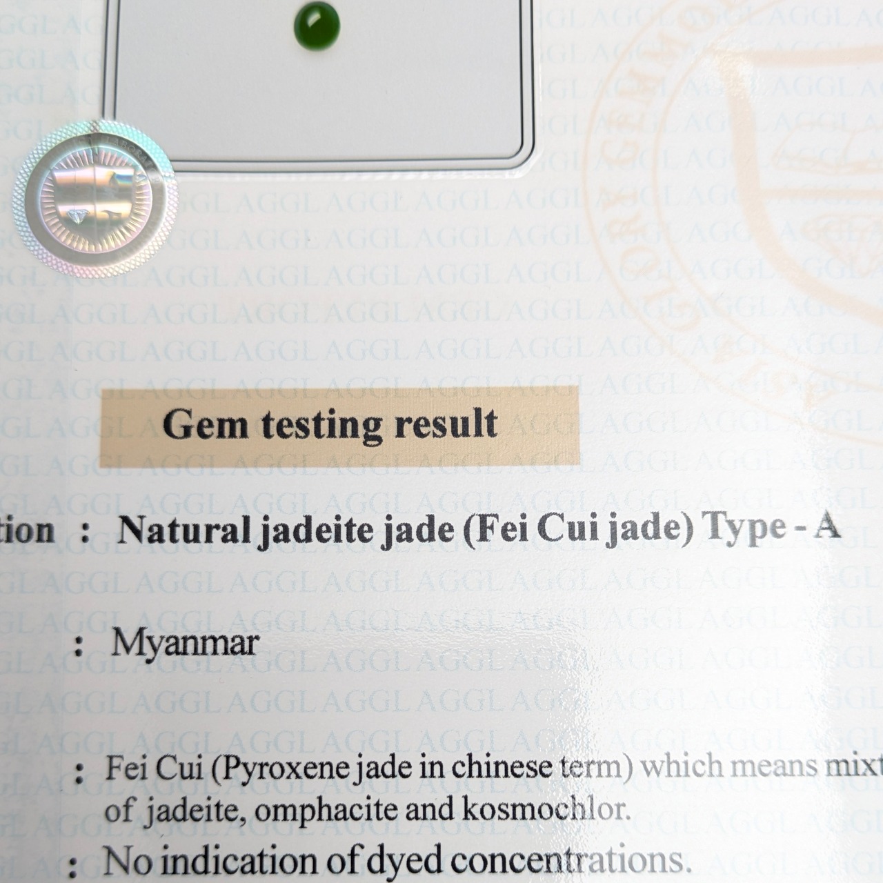 0.49ctと小粒ではありますが、色ムラもなく透明度も高い非常に美しい艶感のジェイダイトです。エメラルドやツァボライトのような鮮やかなグリーン系の宝石と同様、この印象的なグリーンは微量に含まれる「Cr(クロム)」が原因です。瑞々しく太陽を一杯に浴びて成長したオリーブの実のように、ツヤツヤぷるんぷるん!肉眼でも透明感と美しいグリーンをきちんと感じられる、美しい1ピースです。