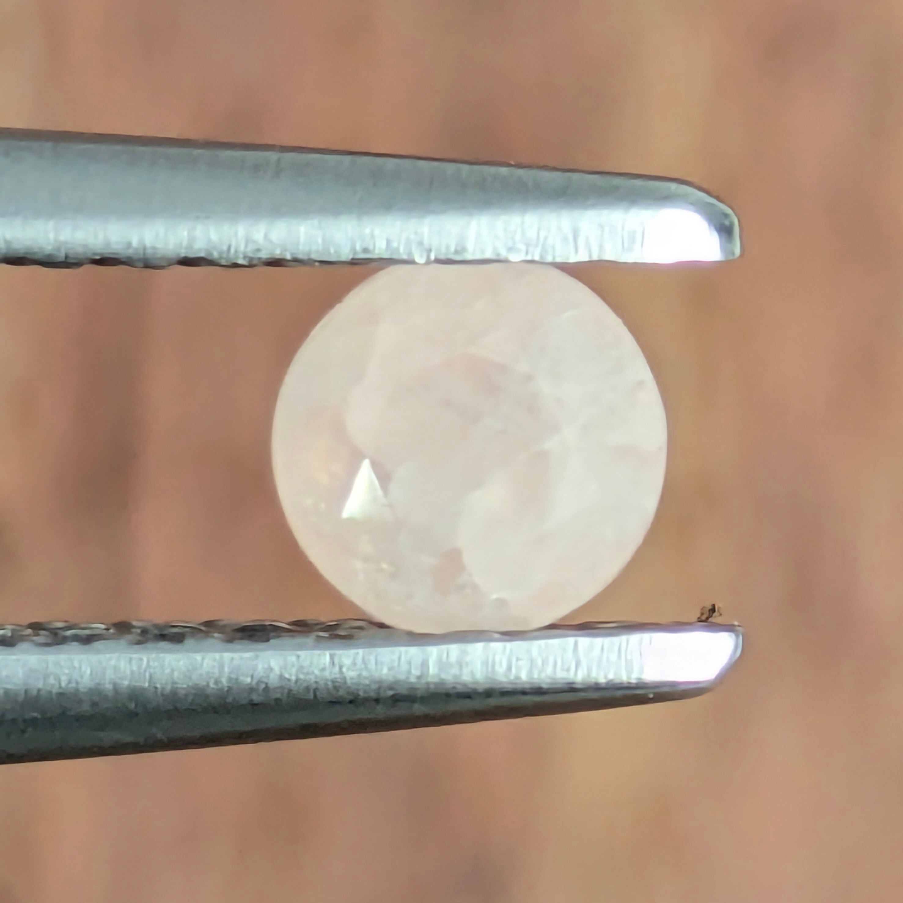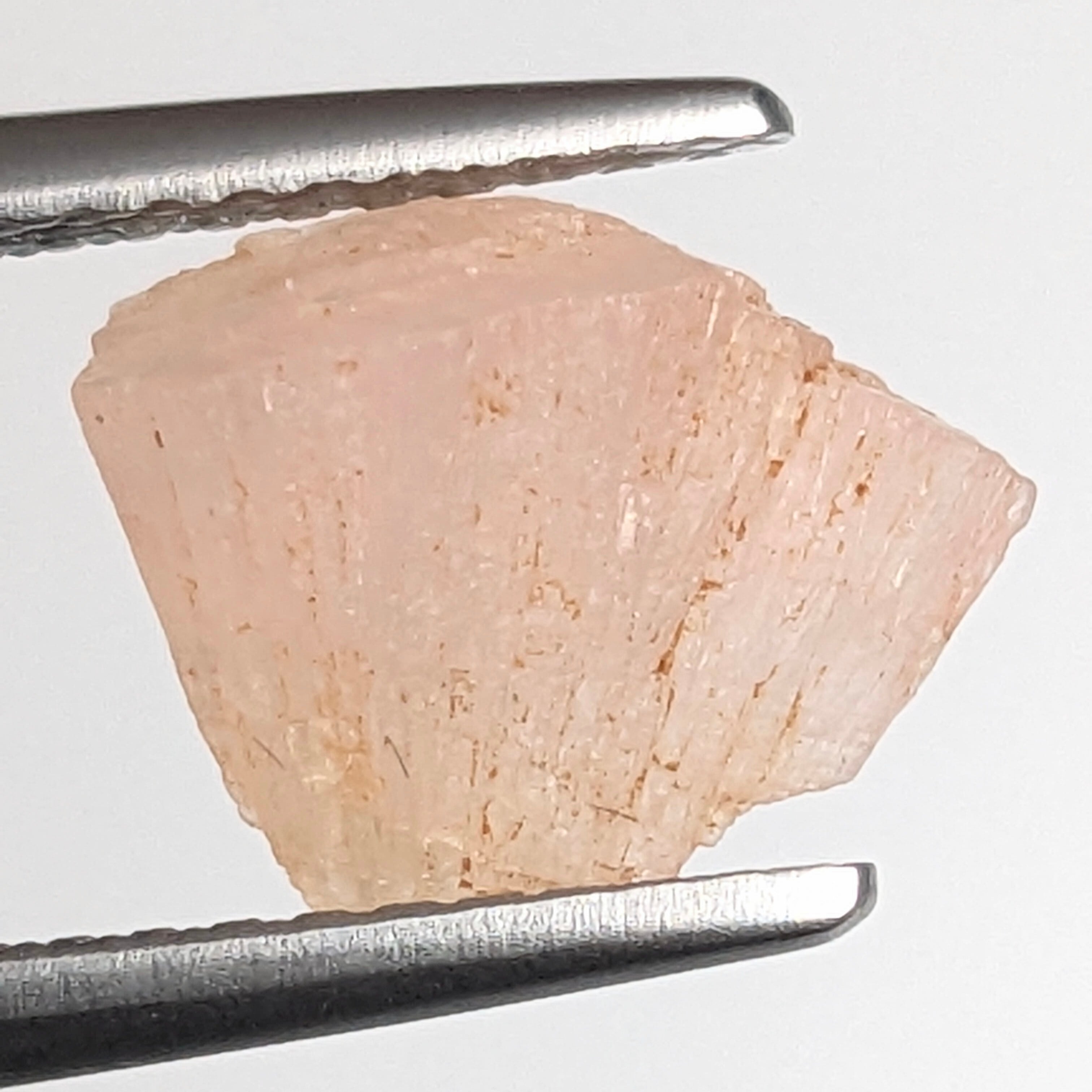 ミャンマーで直接原石で仕入れをした1.73ctの「アブデーバイト原石」を、日本にてカットした1ピース。わずか2割程度しか宝石として残らない、とても希少な存在であることが分かります(もちろん原石の形やインクルージョンの状態によります)。アブデーバイトは現在のところエメラルドやアクアマリンと同じ「ベリル・グループ」に属する鉱物だと考えられていますが、原石写真からもわかりますように、柱状の細い結晶が群晶になっているような状態で産出します。画像では分かりにくいのですが、実物は可愛らしいベビーピンクの色合いに心がときめく1ピースです。