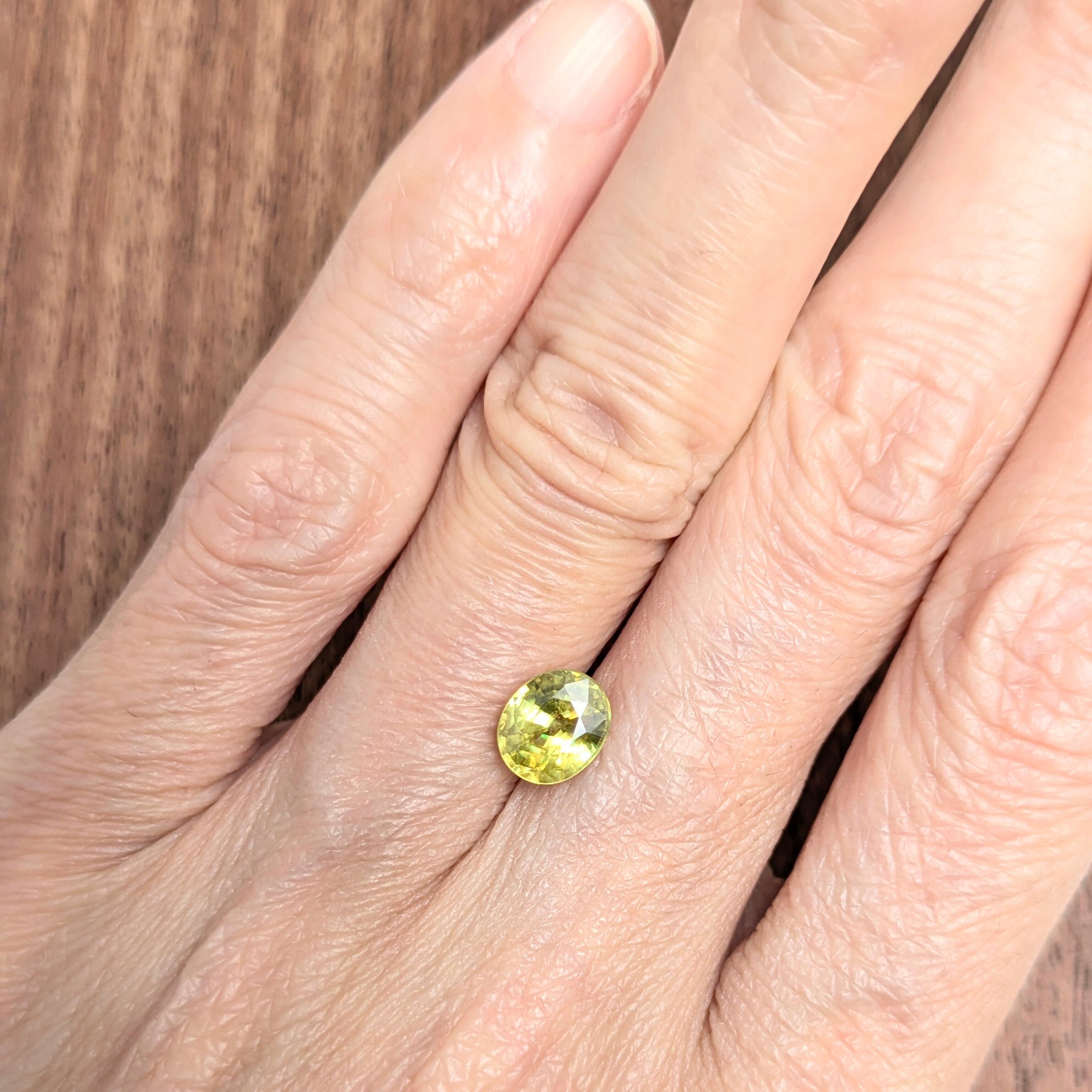 スフェーンは別名、「チタナイト(チタンを含む石、という意味)」。チタン自体は金属で、見た目も不透明な銀色をした物質ですが、それが元素としてある条件下の鉱物に含まれると、この様な鮮烈な虹色を発する宝石になるというのは不思議な話。この虹色の「分散」という現象は、ダイヤモンドの「ファイア」と同じ現象ですが、スフェーンの分散はダイヤモンドを上回る鮮やかさです。分かってはいても、やはり不思議な現象ですね。