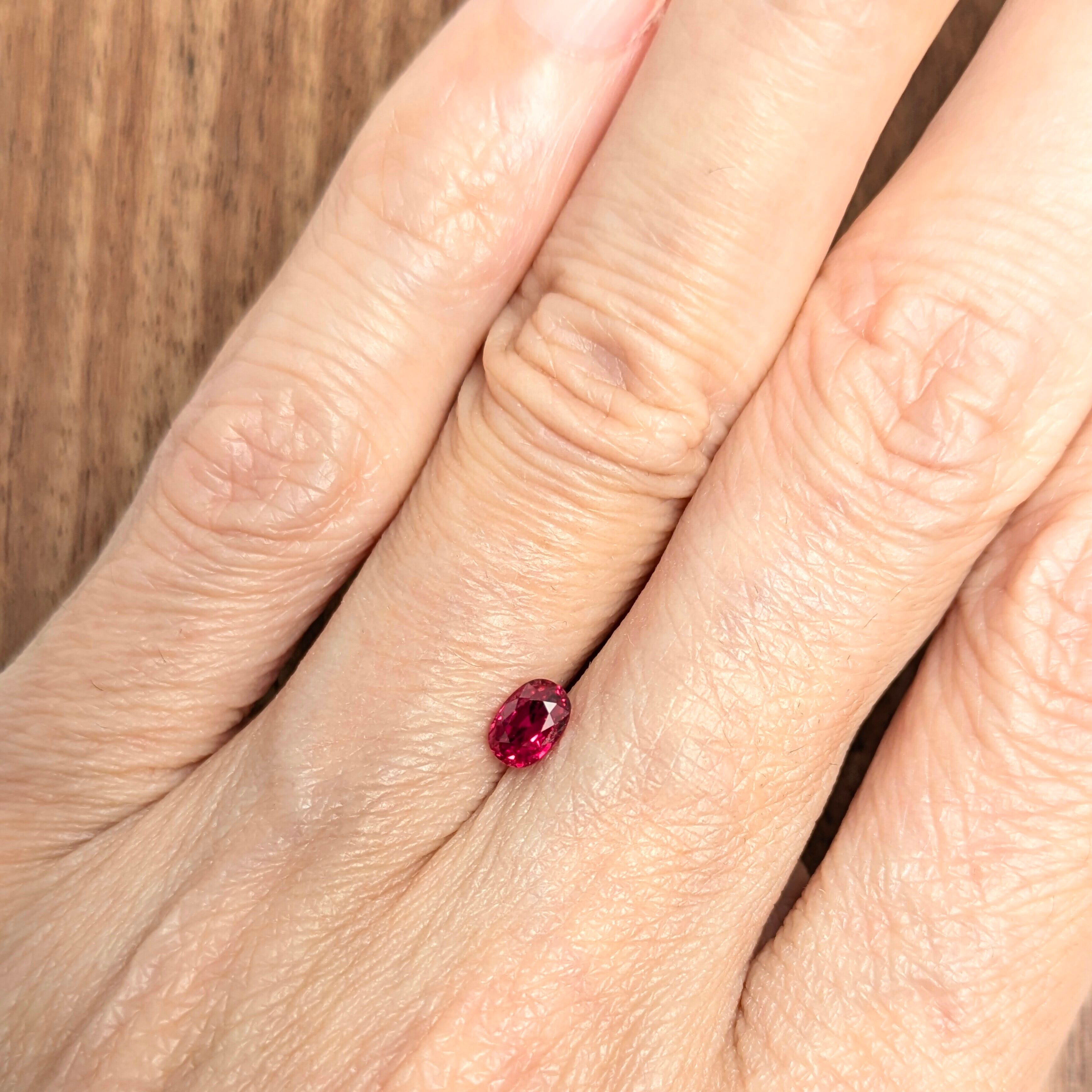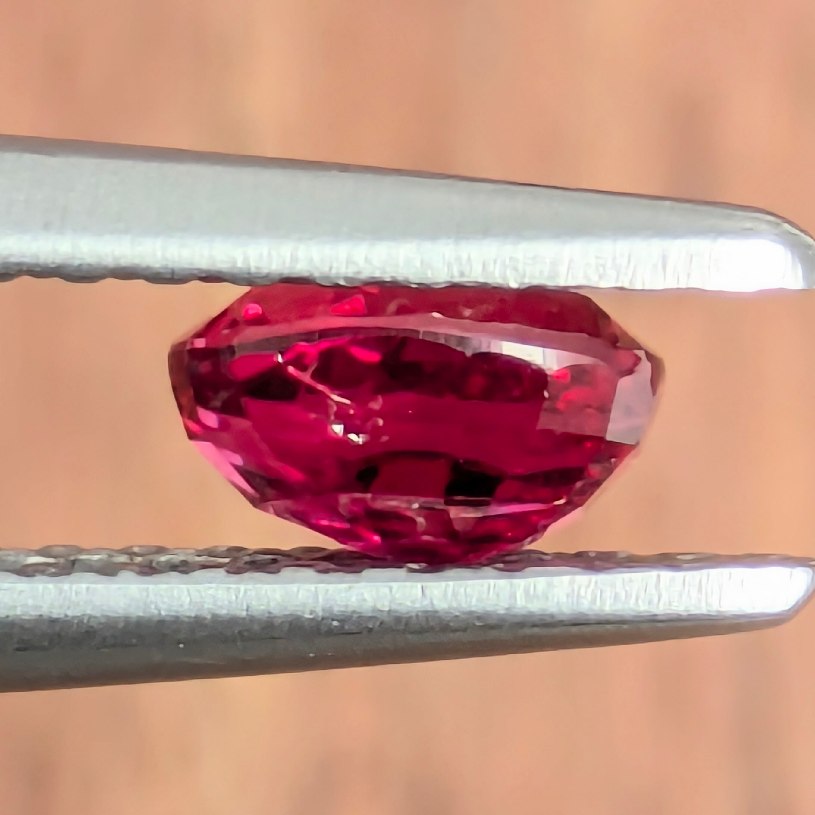 なかなか正確な色合いを捉えた撮影が難しいのですが・・・。かなり彩度の高い、美しい赤色が印象的なルビーです。ルーペで覗くと、肉眼でその美しさを邪魔しない程度の結晶のインクルージョンなどが煌めき、「きっとこの小さな輝き一つ一つも、全体の美しさに貢献しているのだろうな」という健気な美しさ。宝石は立体物、動いて煌めいて光を受けて初めてその真価を発揮する。是非、実物でご確認いただきたい1ピースです。