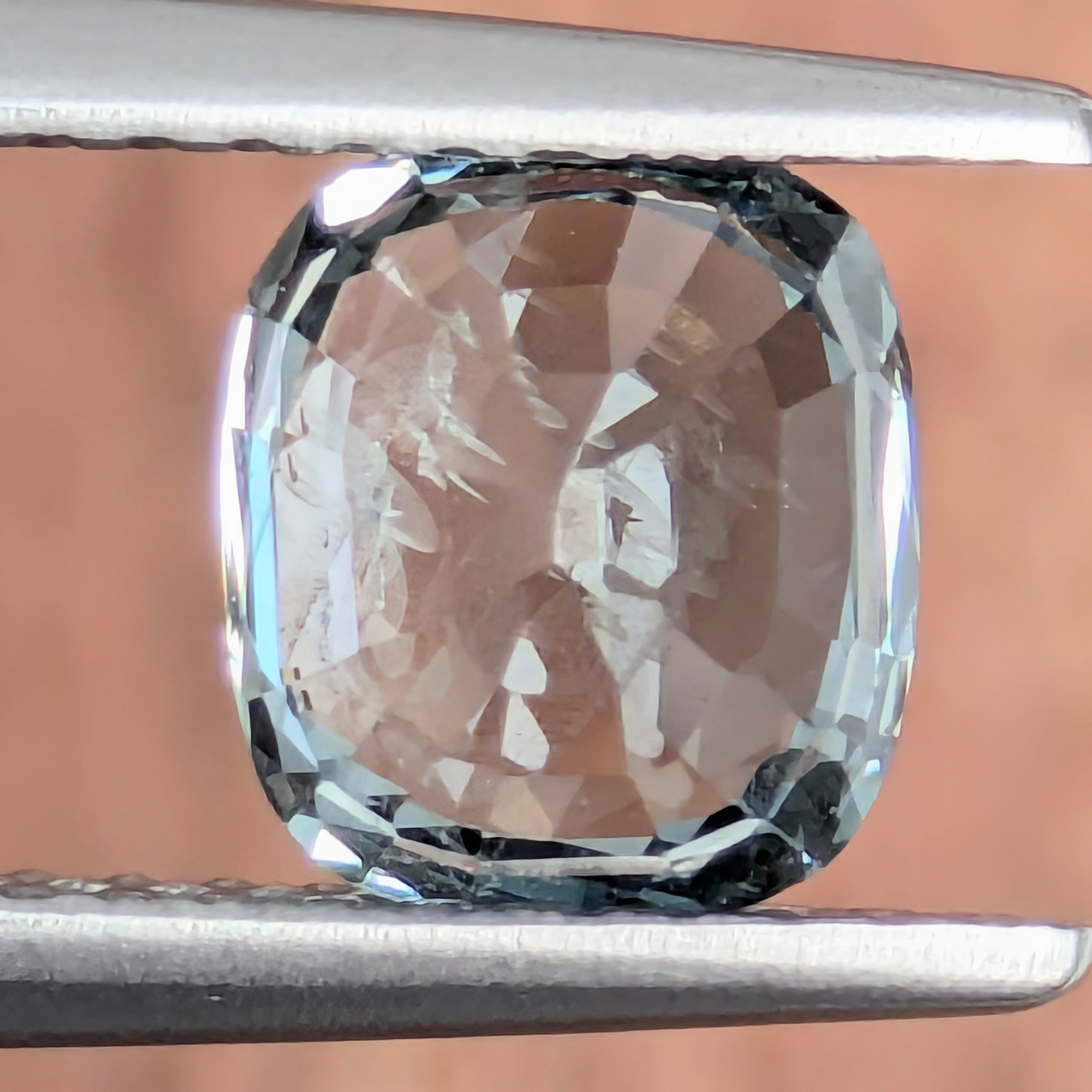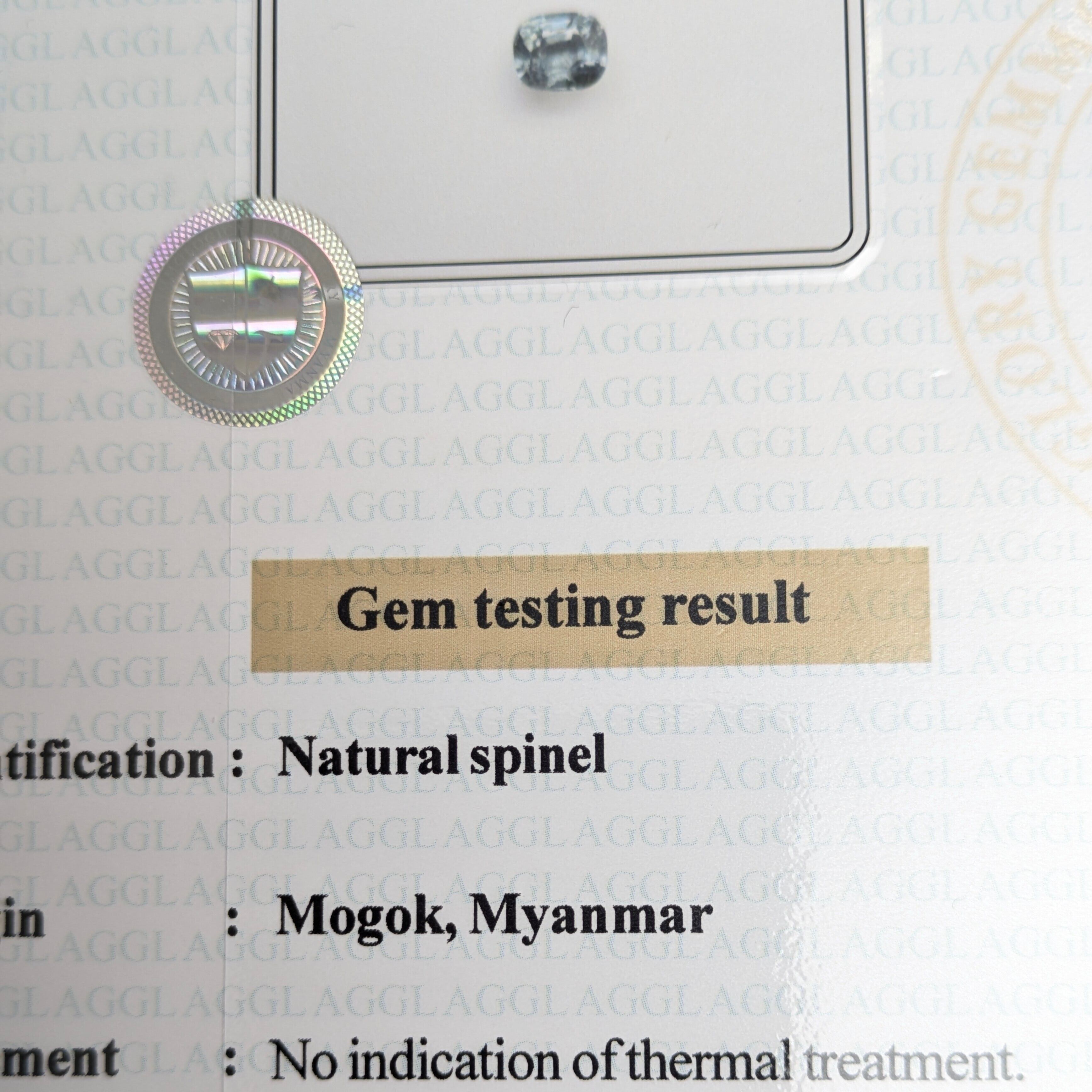 物語に出てくる、精霊が住んでいる湖の色のようなスピネル。カラーグレードは「ライト・グレイッシュ・グリーン」ですが、グレー味をかんでいることでどちらかというと肉眼だとブルーっぽく見えるかもしれません。透明感高く、テリのあるその内部を覗き込むと、まるで妖精たちの羽根の羽ばたきのような薄いレリーフの液体インクルージョンやフェザーが漂っています。とても神秘的な美しさを持つ1ピースです。