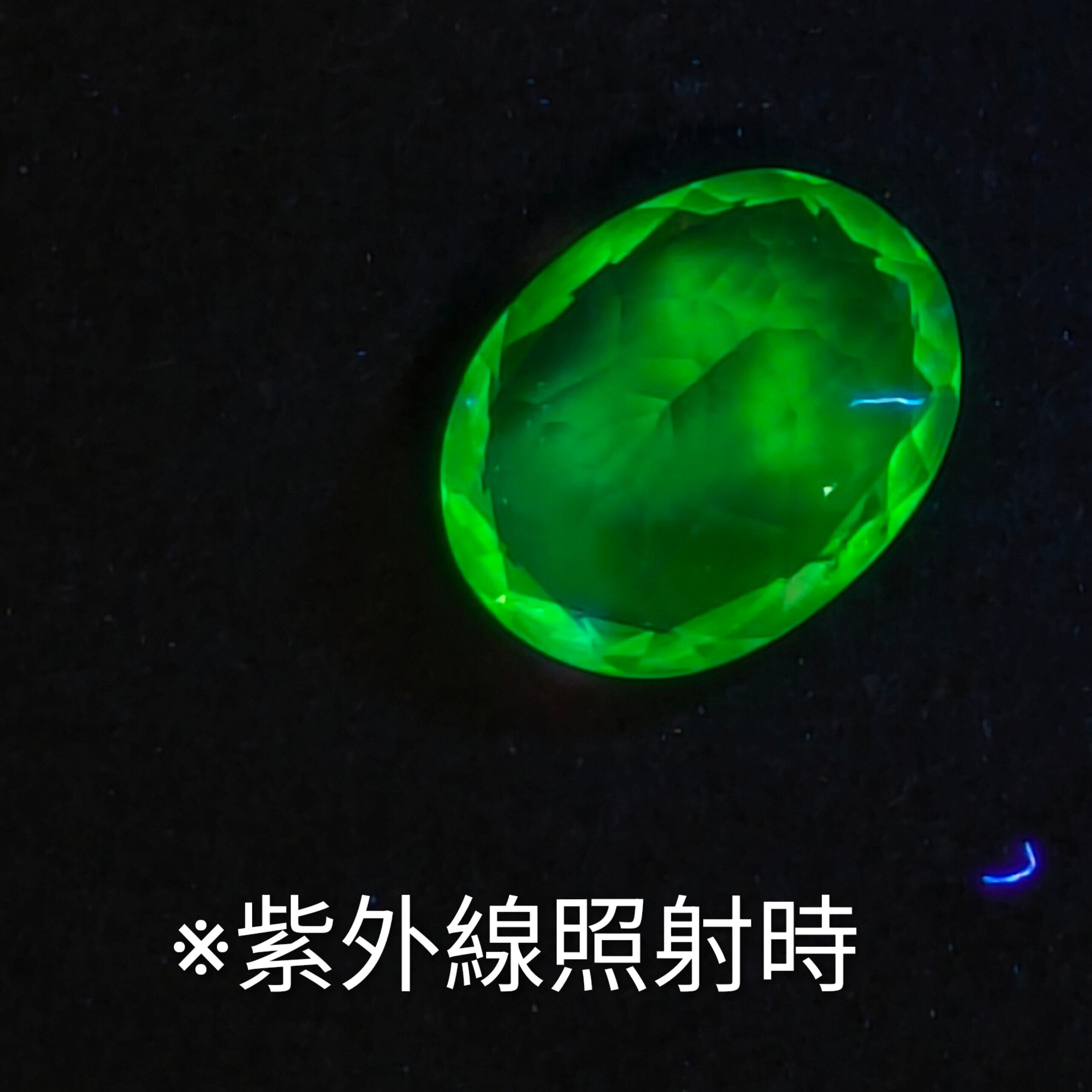 幼いころの、眠れない真夏の夜の記憶。子守歌代わりに聞こえてくる虫の音に誘われ、蚊帳の中からそっと抜け出した思い出。障子を開けると、そこにはふわふわと幻想的な小さな灯りが飛び交っている・・・蛍。そんな想像をしたくなる、鮮やかだけど優しい黄緑色の紫外線蛍光を発する宝石、「ハイアライト。日中は控えめなその姿からは想像できない、劇的に発光するその姿。鉱物にあるまじき“生命のほとばしり”を感じて、嬉しい驚きを感じます。
