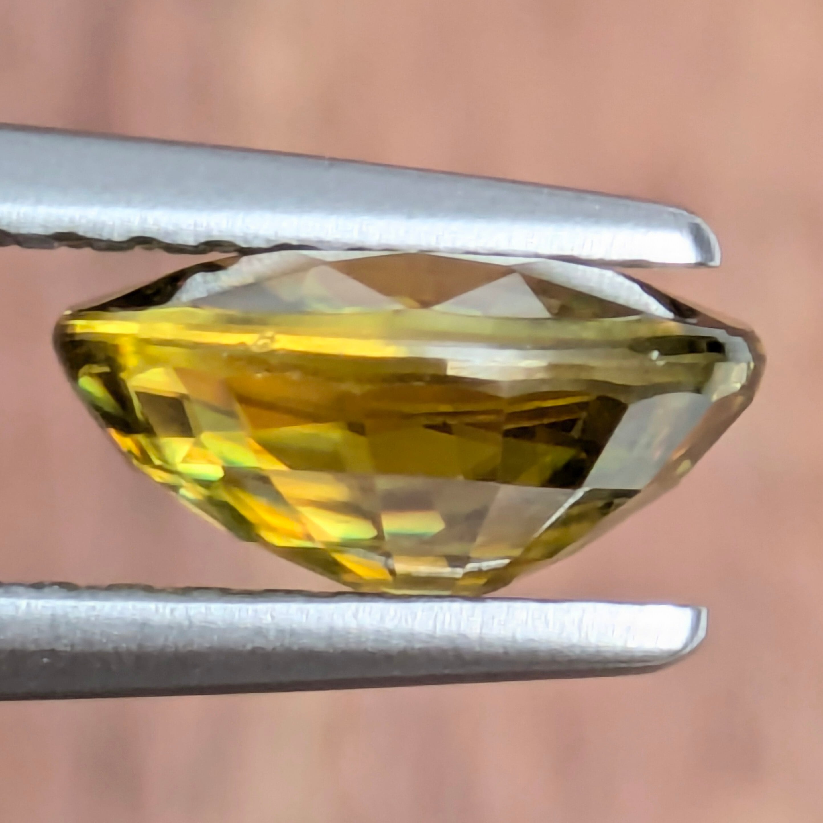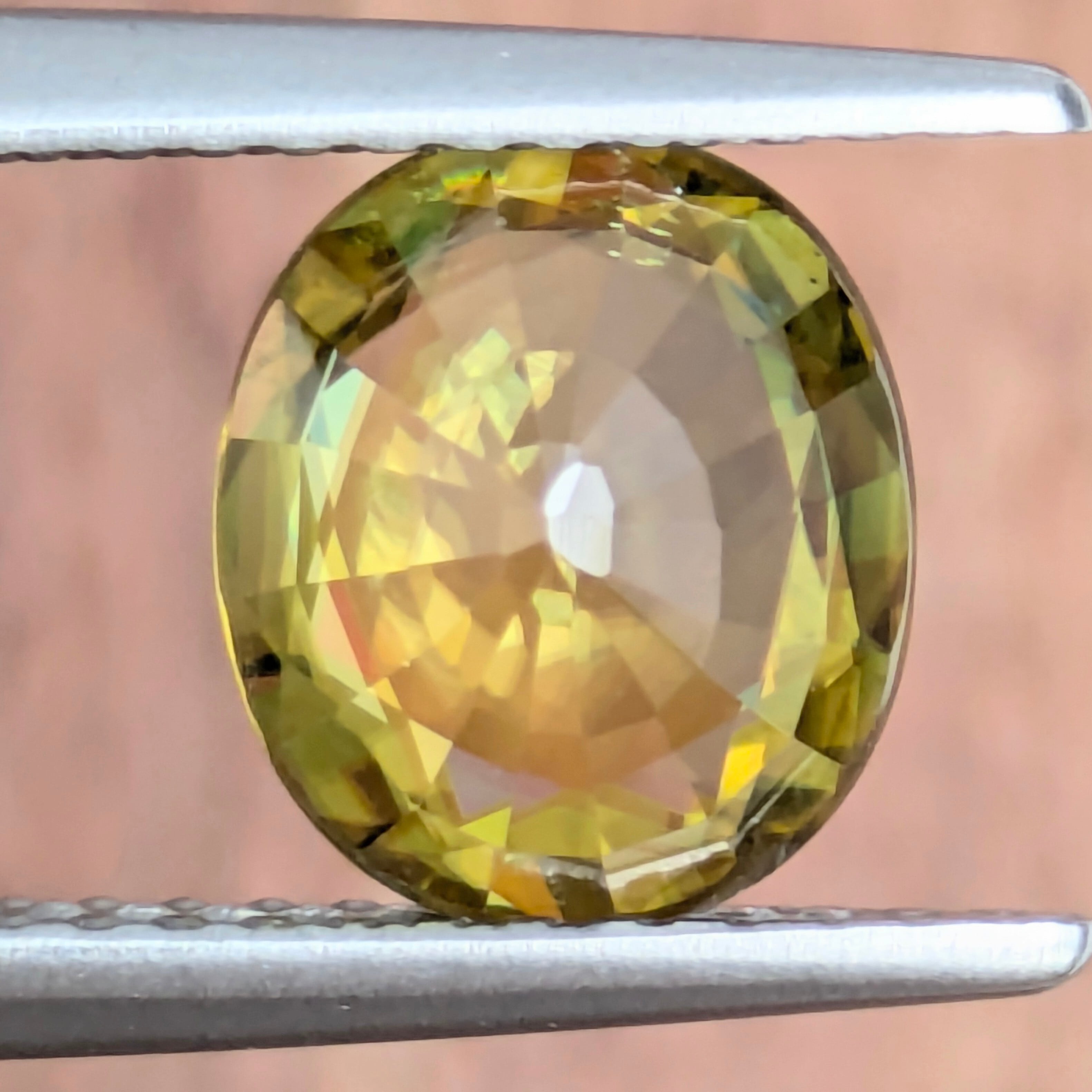 二重に滲むファセット・エッジごしに見える、これまた二重に煌めく七色のファイア。どこまでも幻想的な美しさを持ったスフェーンです。地色は落ち着いた色合いのブラウン味を帯びたグリーンといった風情ですが、その色合いを飛び越えて主張してくる虹色の輝きはスフェーンだけが持ち得る個性です。太陽よりも明るく、万華鏡よりも多彩に・・・。平凡な日常に、輝きでスパイスを加えてくれる1ピースです。