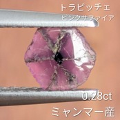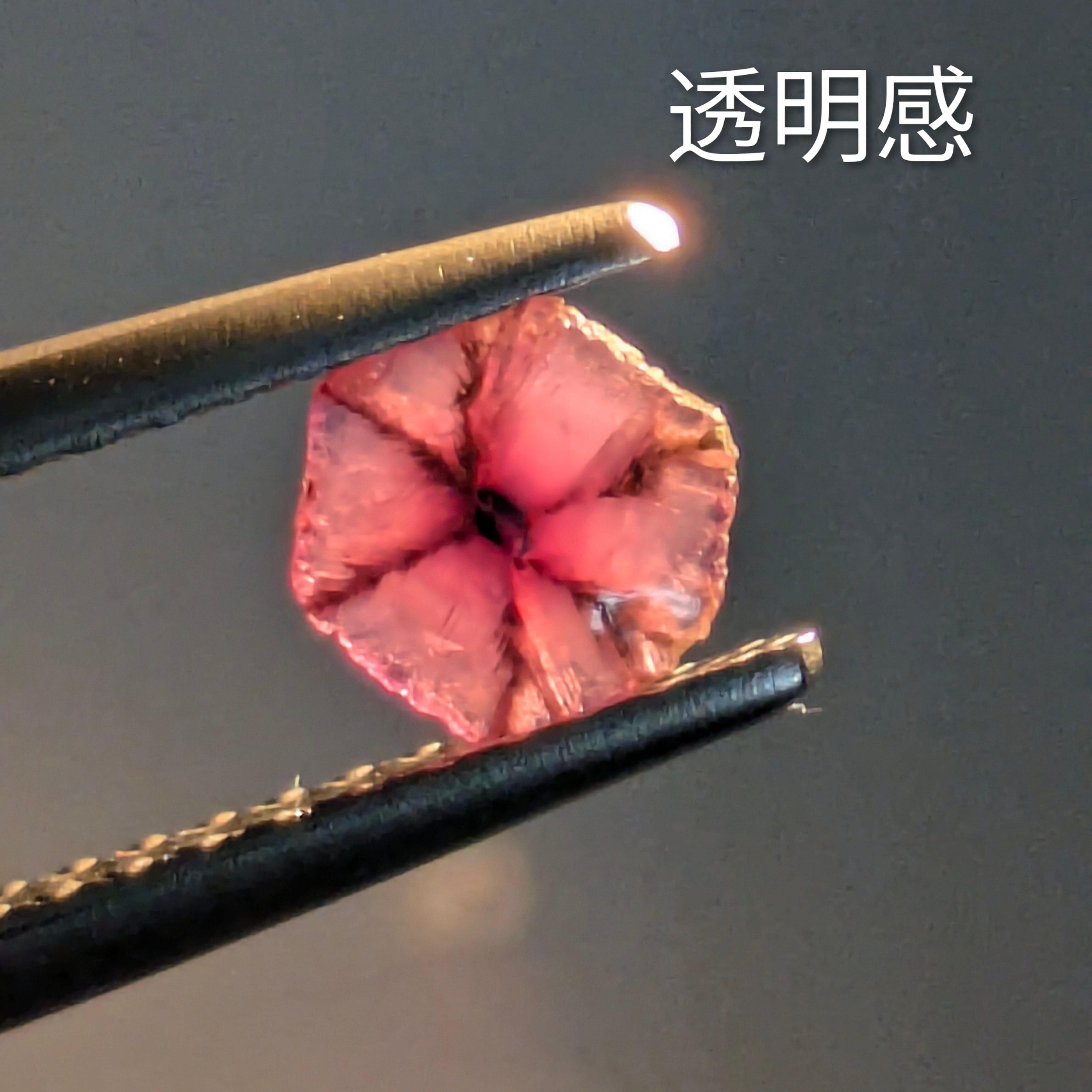 まるで石に生命を通わせている血脈のようにも見える、トラピッチェ特有の“サトウキビの絞り機模様”。この6条の線以外のピンクサファイアの部分は意外と透明感があり、真っ赤な紫外線蛍光を発する時と、通常時とで、その様子を劇的に変化させます。このような模様が偶然に生まれ出るとは、なんとも不思議な1粒。紫外線に当たって真っ赤に発光する様は、まるで“竜の目”のようにも感じます。(見たことはありませんが・・・)