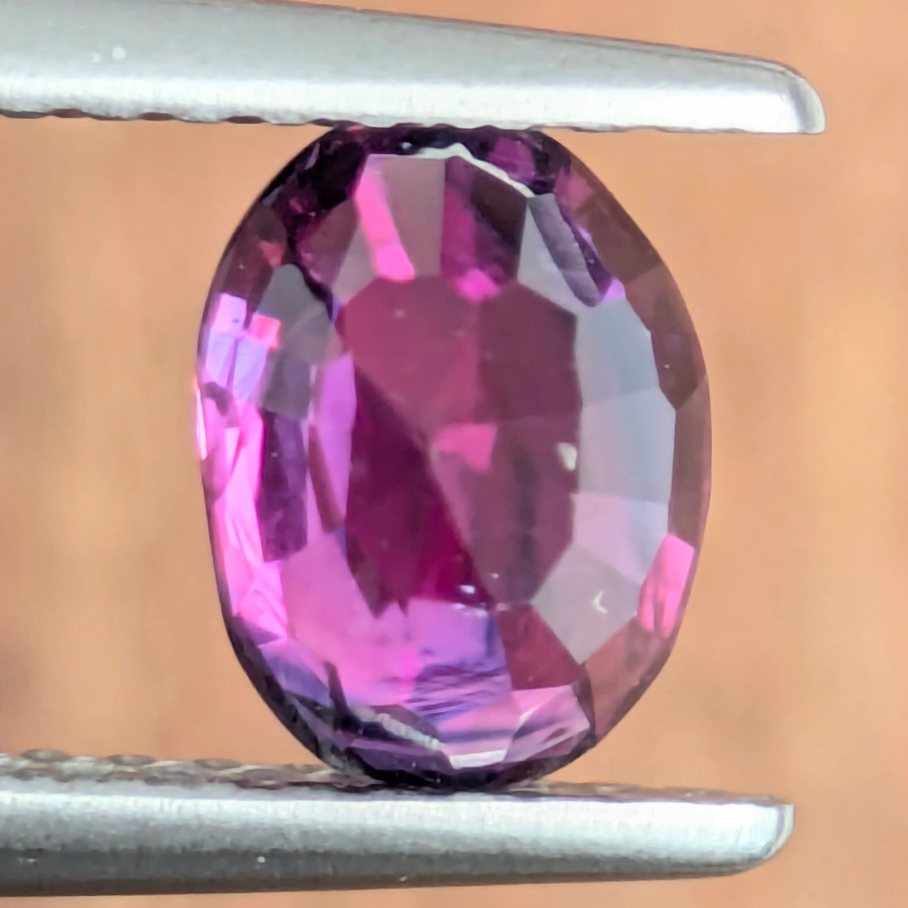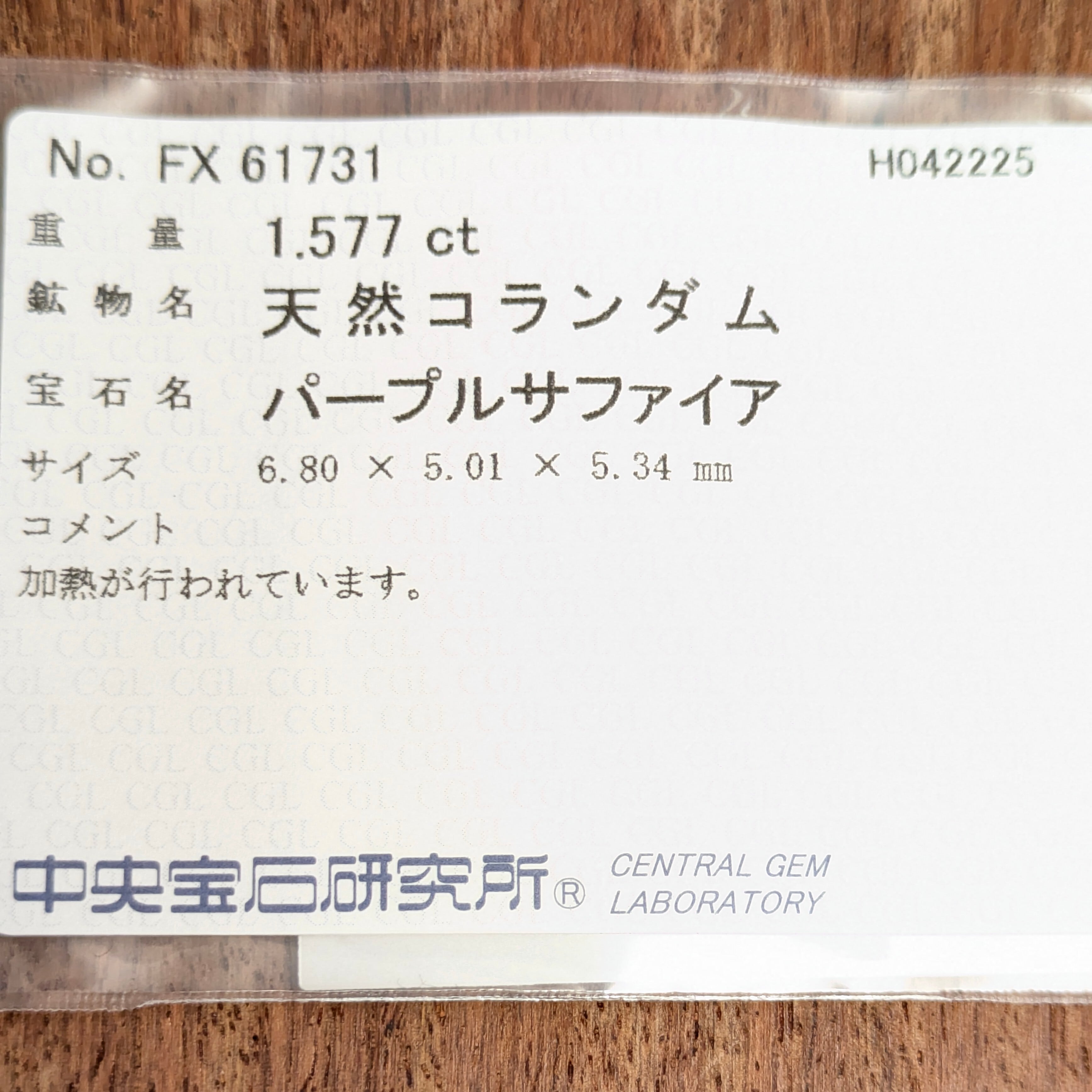 熟成したワインのような、極上のパープル・カラーのサファイア。とても奥行きのある、高貴な紫色にウットリとしてしまいます。厚みがかなりありますが、そのおかげで四方八方からの輝きの違いを楽しめる1ピース。肉眼では非常に照りが良いですが、ルーペで拡大すると方向によっては若干シルキーに艶めく部分もあり、若干青とパープルが混ざり合ったような色ムラも魅惑的で、いくら眺めていても飽きない美しい一品です。